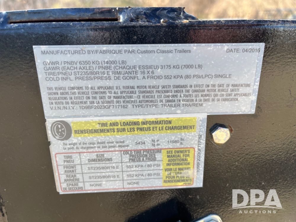 2016 Custom Classic Trailers Trailer Frame (JN3396), tandem axle, bumper hitch, jack stand, ST235/80R16 tires, GVWR 14,000 pounds.