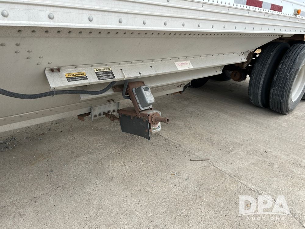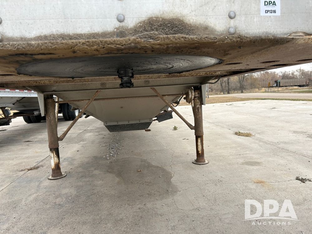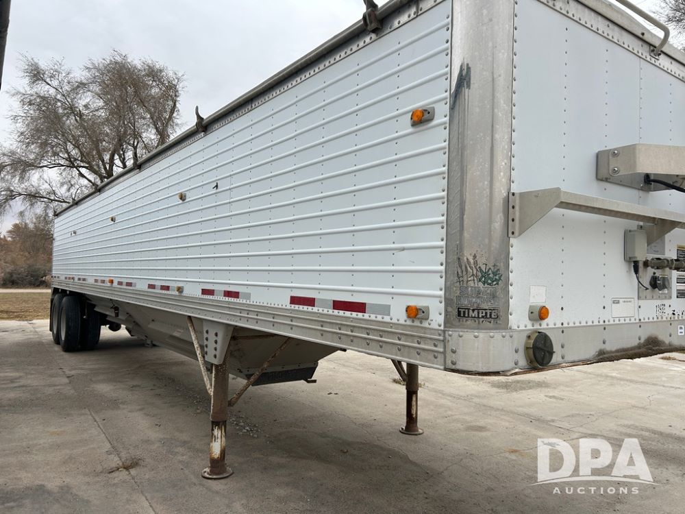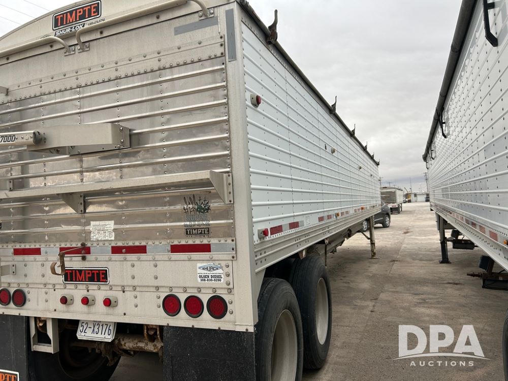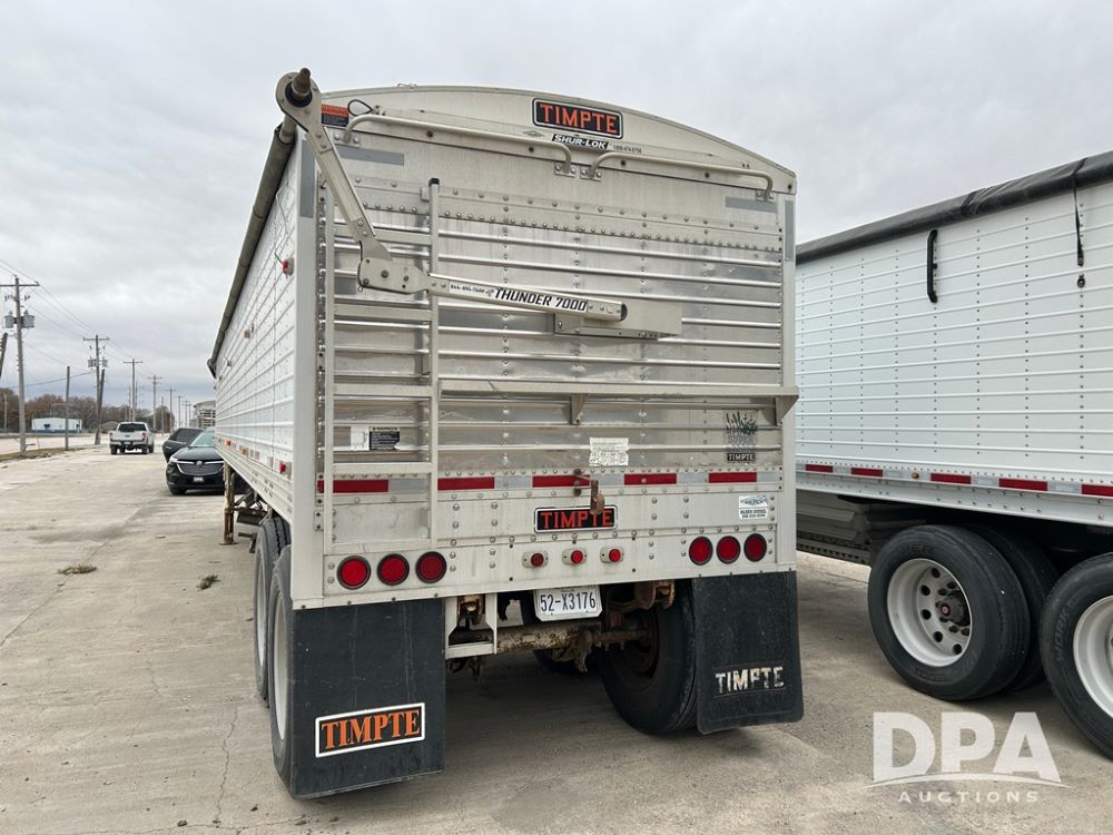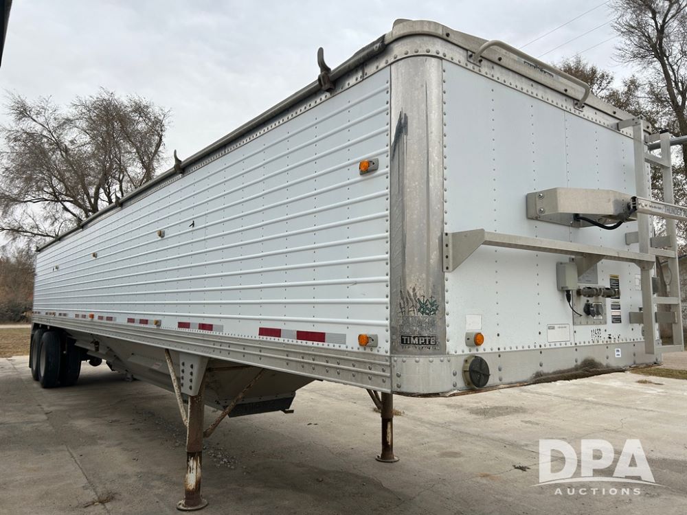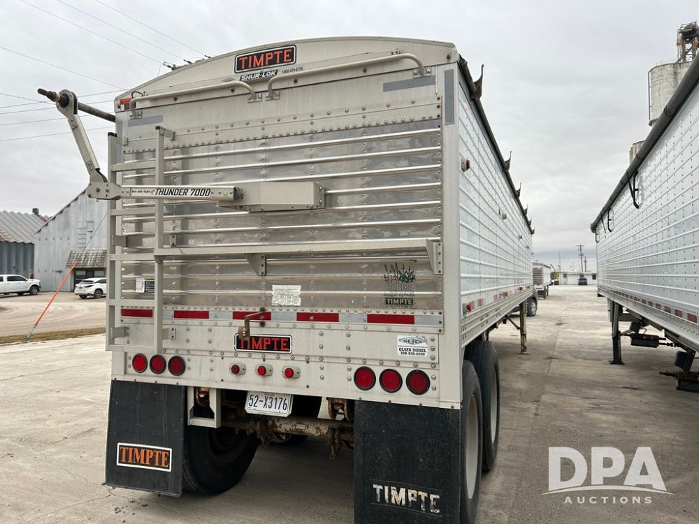 1997 Timpte Hopper Bottom Grain Trailer (CP1316, Unit 11932), 1997 Timpte aluminum hopper bottom grain trailer, Roll-Rite hopper open/closers, Thuner 7000 electric roll over tarp, tandem axle, spring suspension, 11R24.5 tires, aluminum rims.