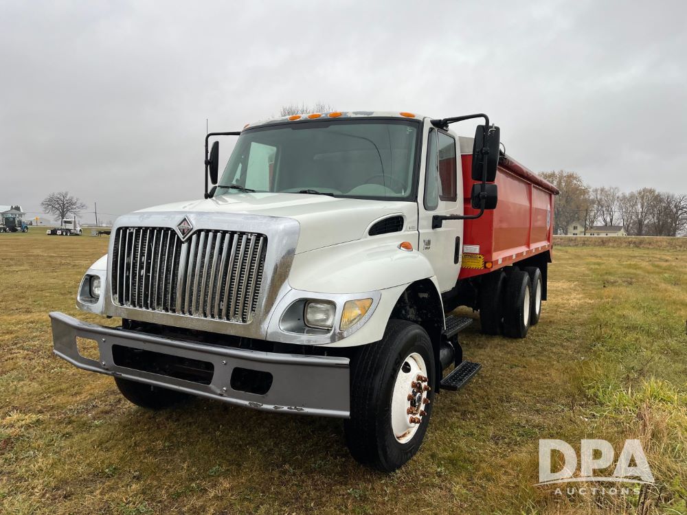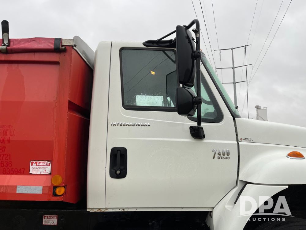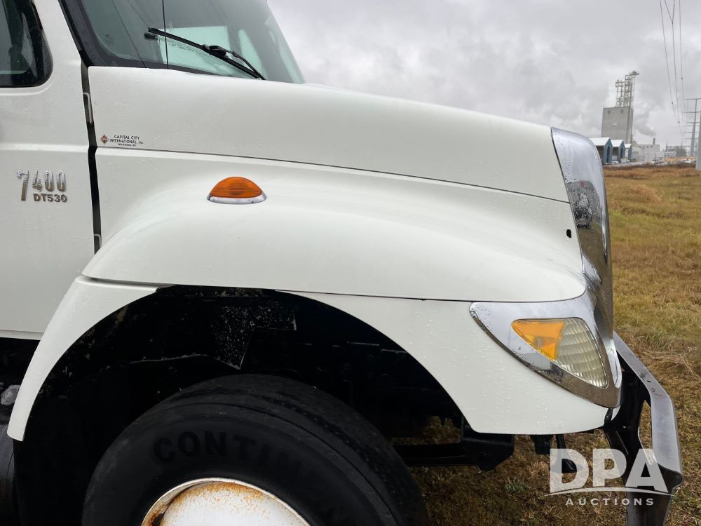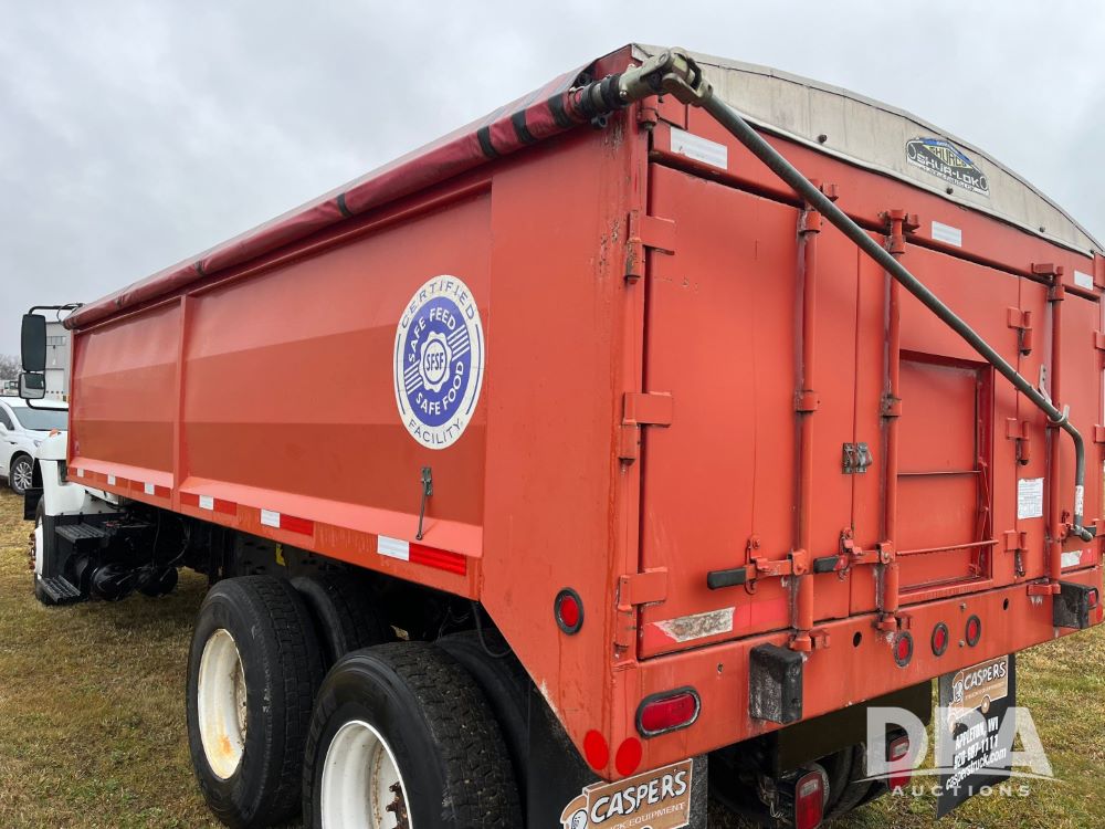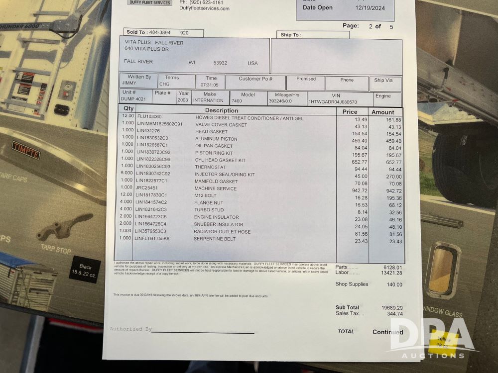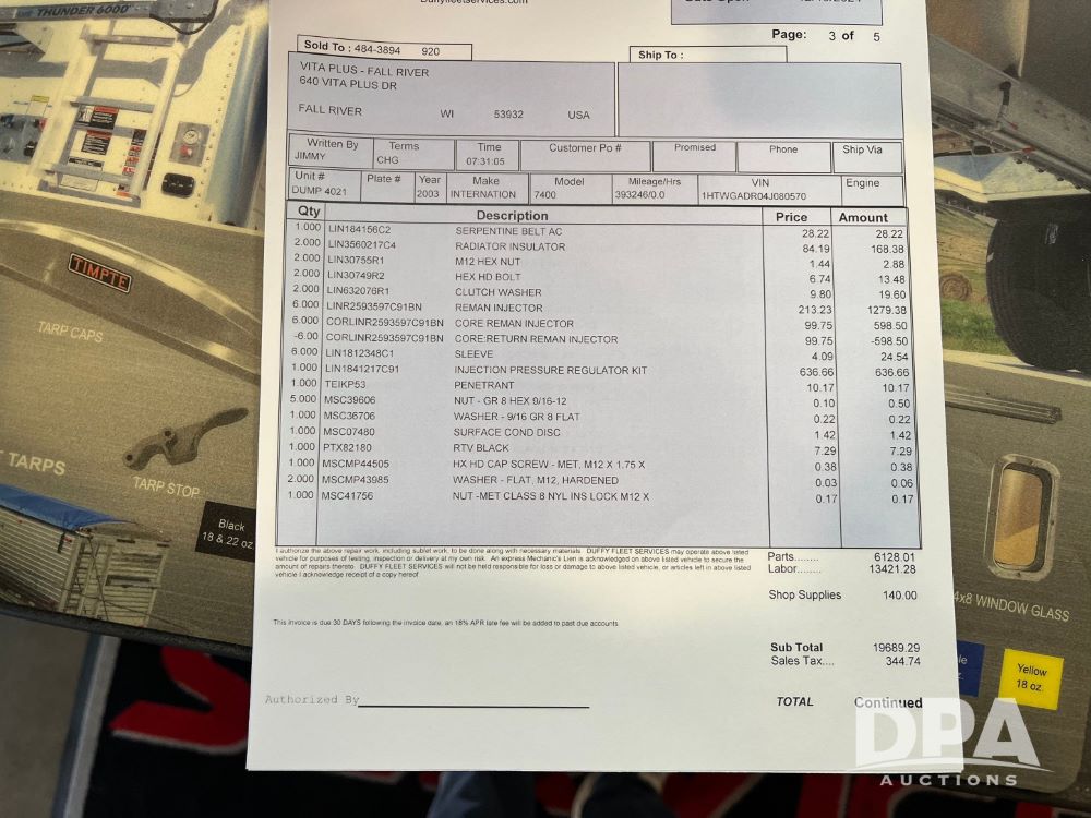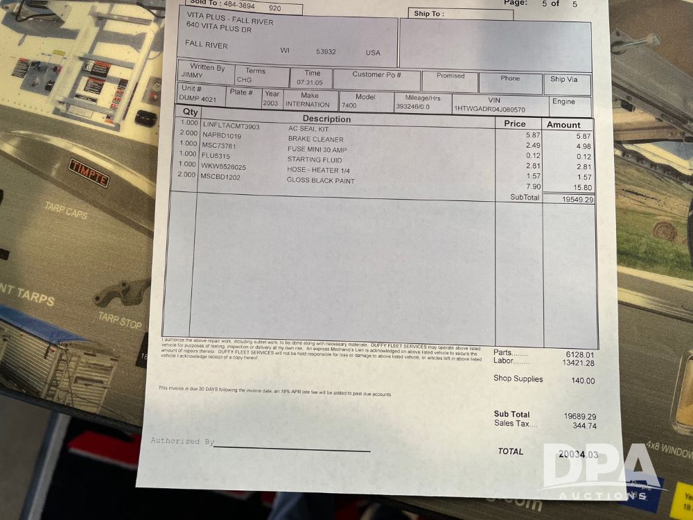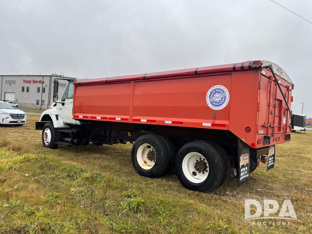 2004 International 7400 Feed Truck (JN3429, Unit 4021), DT530 diesel engine, Eaton Fuller 10 speed transmission, heat, Am/Fm radio, tandem axle, spring suspension, grain body, dual hoist, manual roll tarp, 275/80R22.5 front tires, 295/75R22.5 rear tires, shows 393,290 miles.