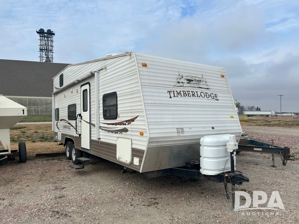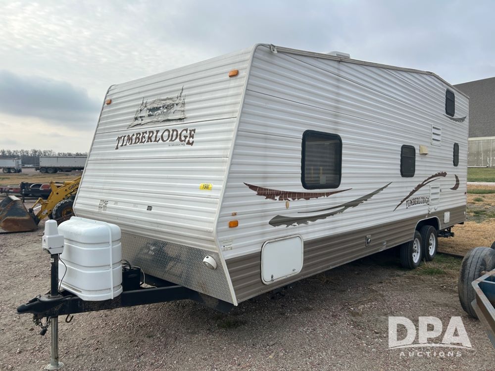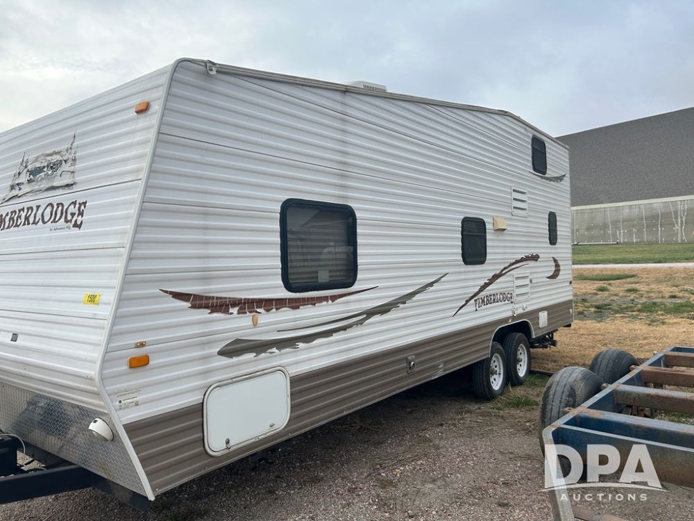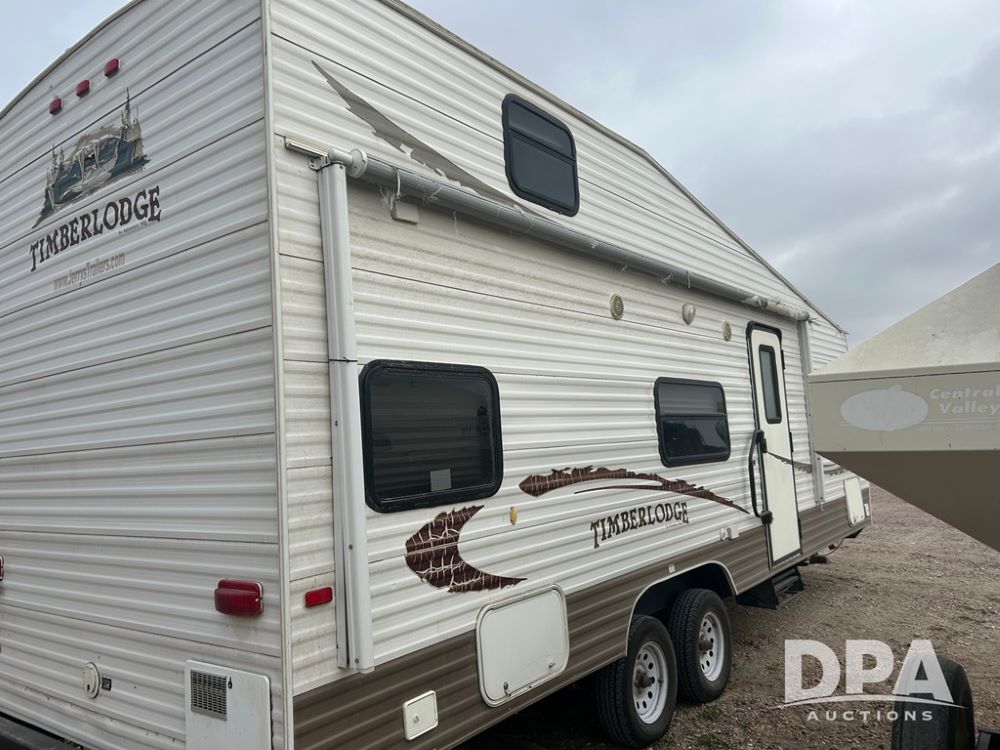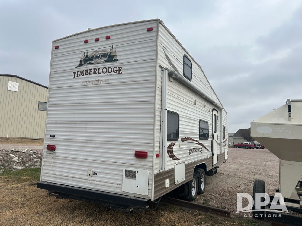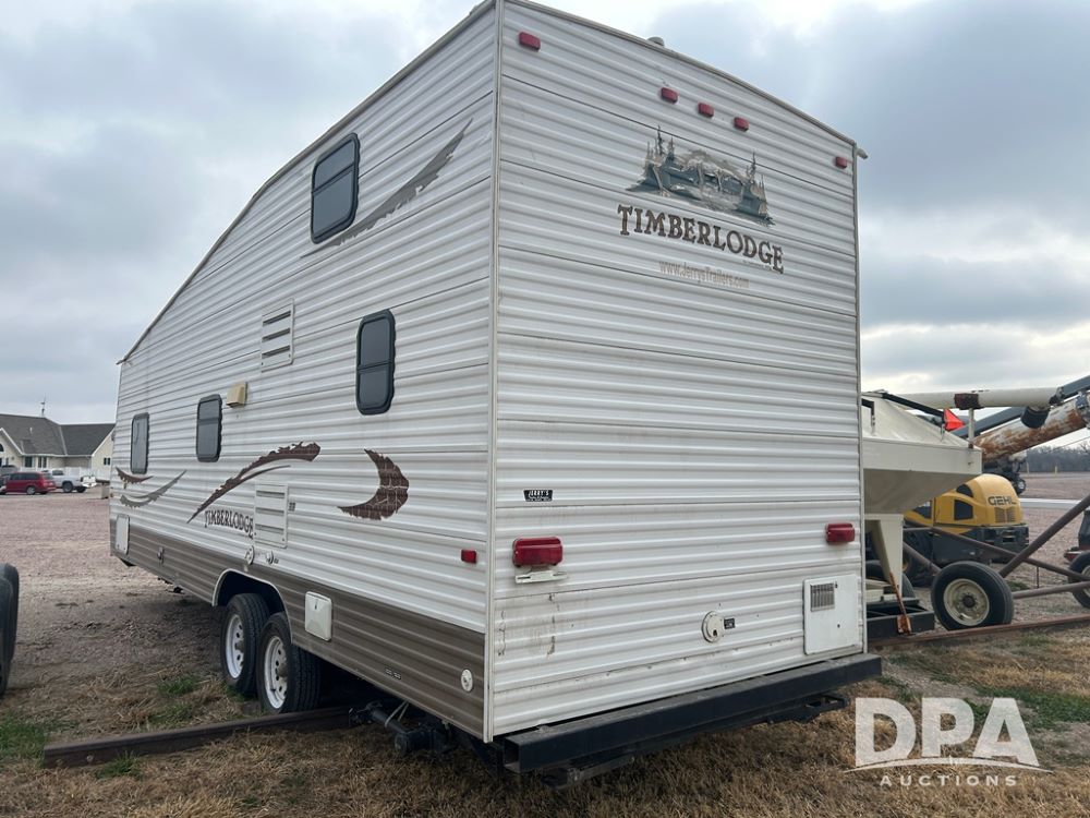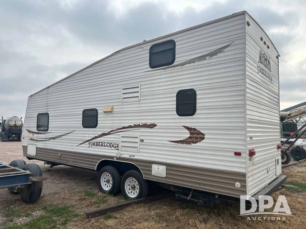 2009 Timberlodge Camper (CP1330), Timberlodge Model T27SKYA camper, bumper hitch, tandem axle, air conditioner, stove, refrigerator, microwave, bathroom, awning is torn away, ST205/75R15 tires, electric stabilizers, GVWR 7,182 pounds.