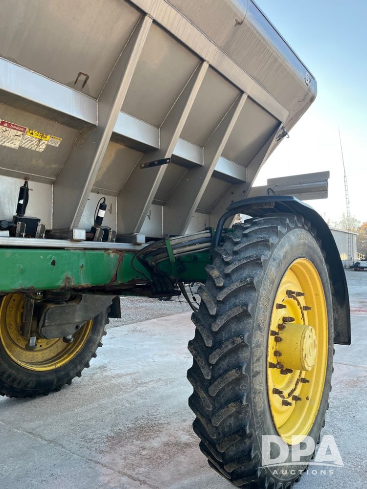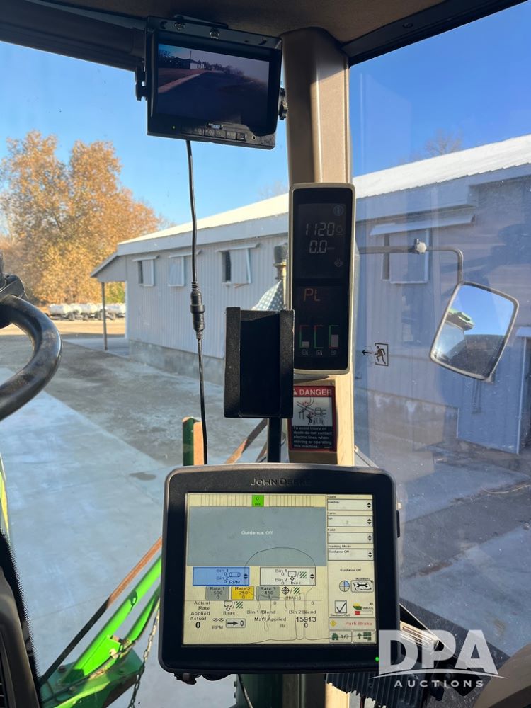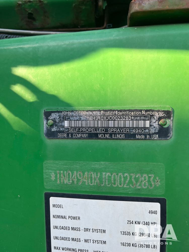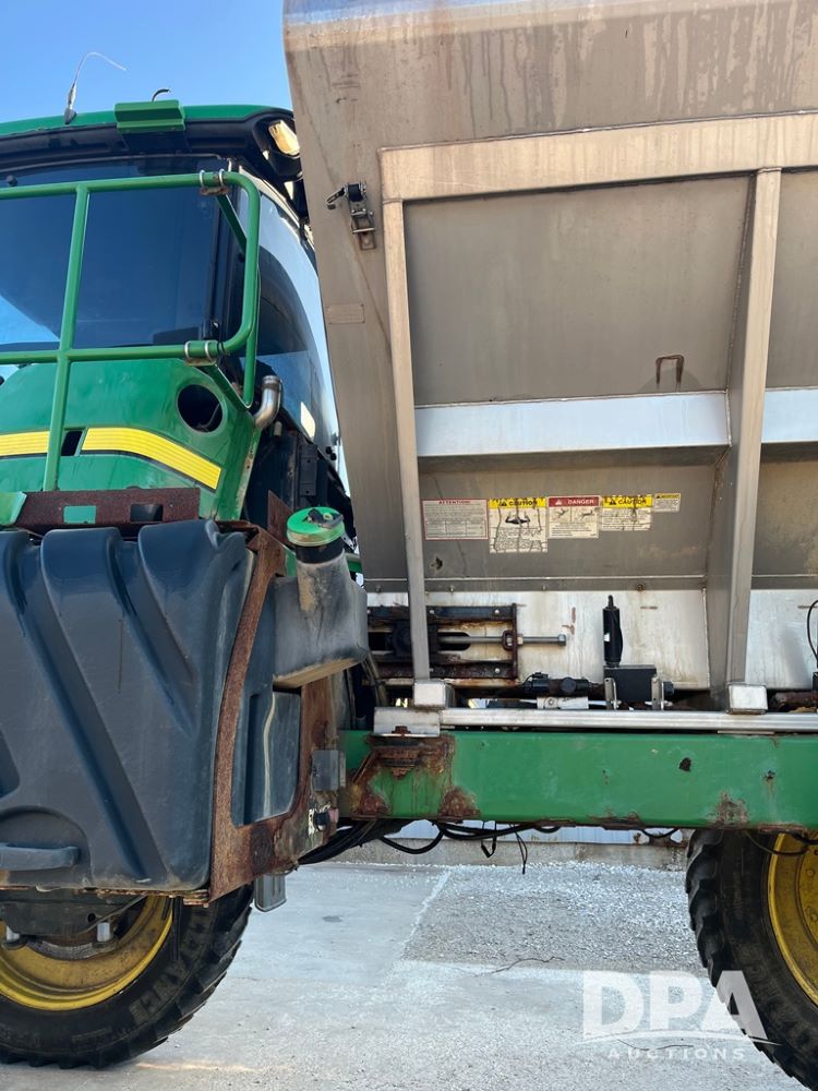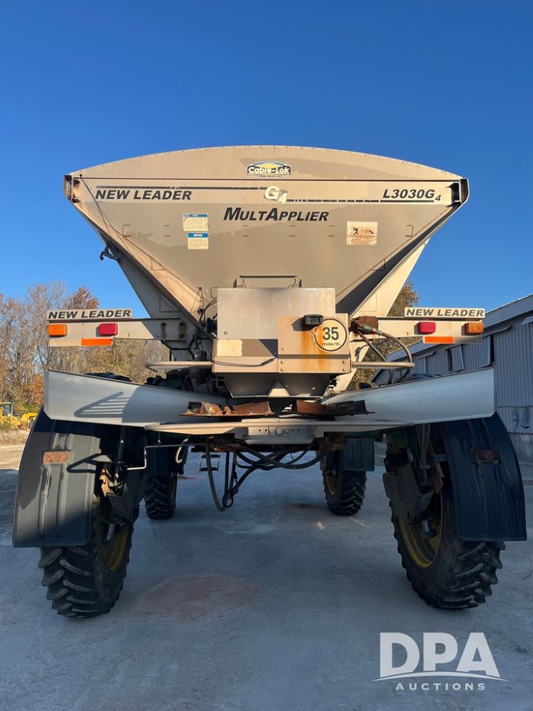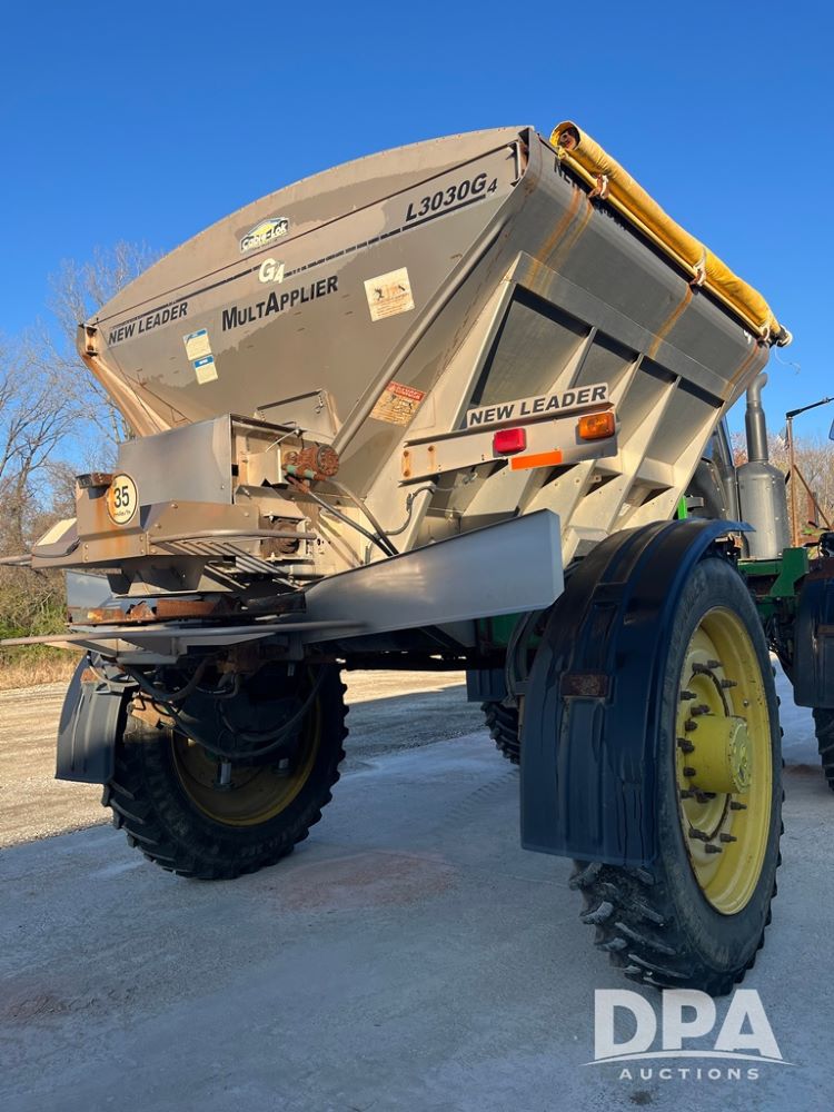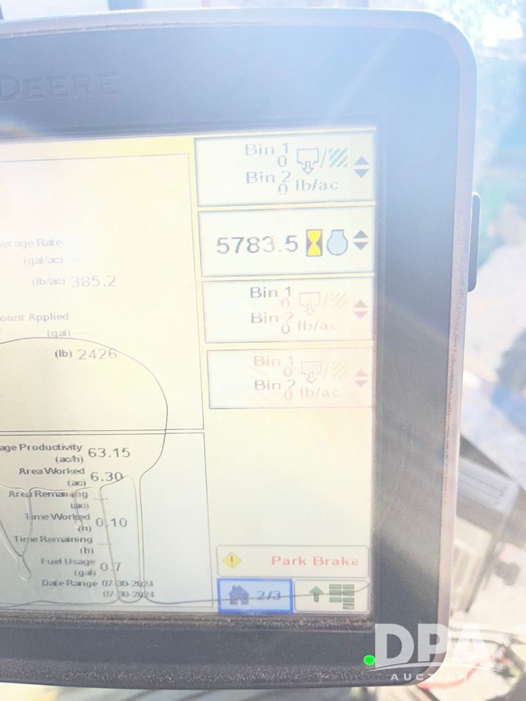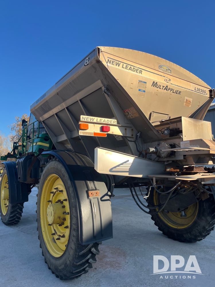 2013 John Deere 4940 Dry Spreader (ED5312), John Deere diesel engine, hydrostatic transmission, heat, air conditioning, AM/FM Delphi radio, buddy seat, New Leader L3030 G4 twin bin bed, MultApplier, roll tarp, 380/105R50 tires, fenders, Starfire 3000 receiver, John deere 2630 monitor, shows 5,783 hours.