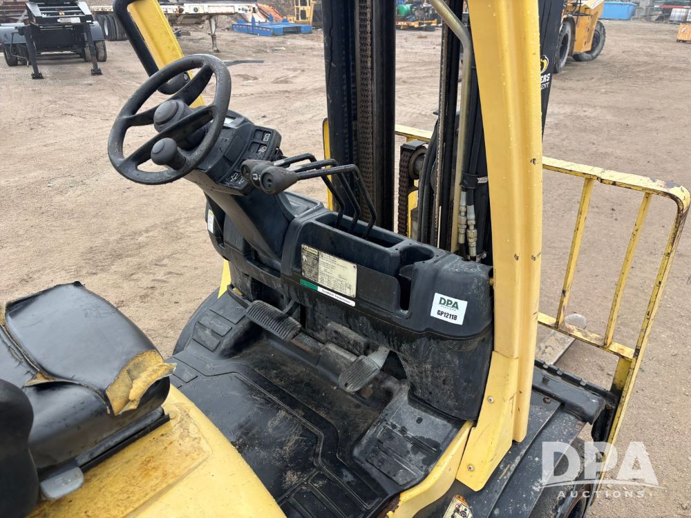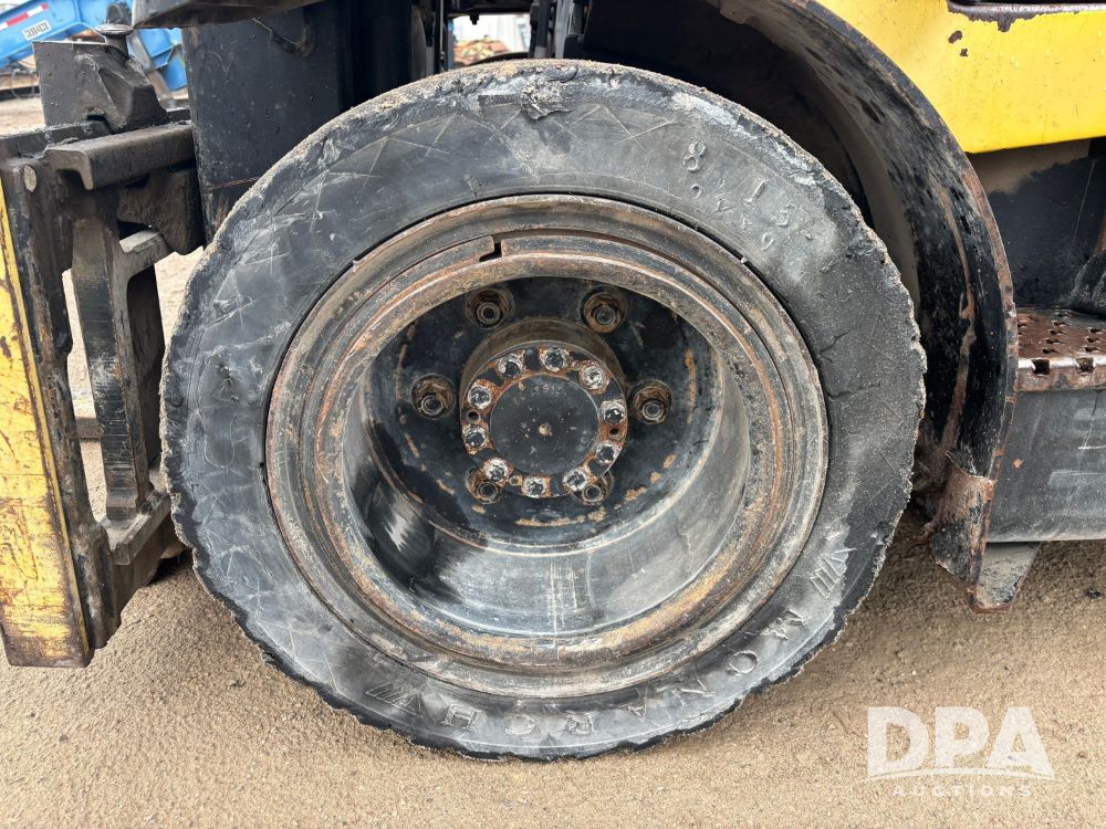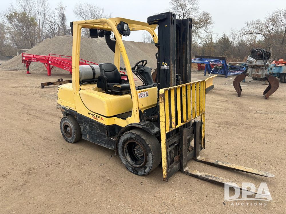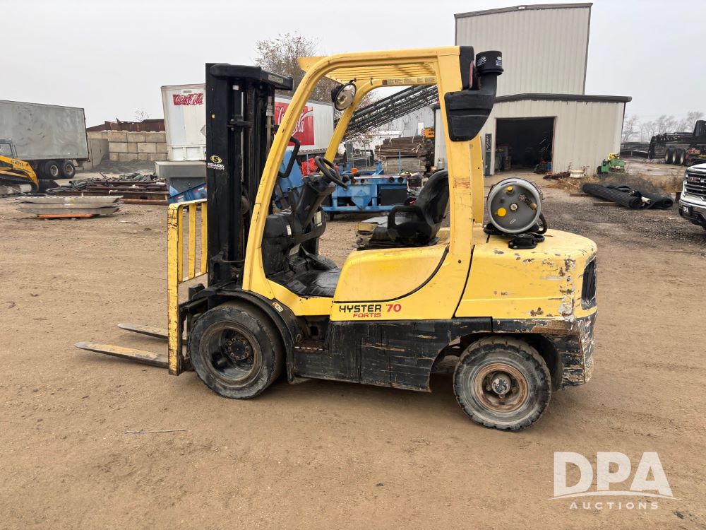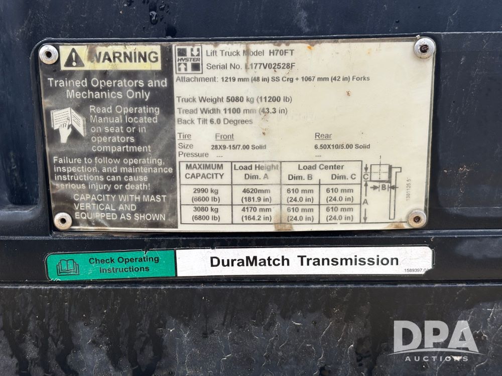 Hyster H70FT Forklift (GP12118), Hyster Model H70FT forklift, LP gas, Vortec 2400 gas engine, shuttle shift, forks, tilt, side shift, 6,800 lb maximum lift capacity, 28x9-15 front solids, 6.50-10 rear solids, truck weight 11,200 pounds, shows 9,276 hours.