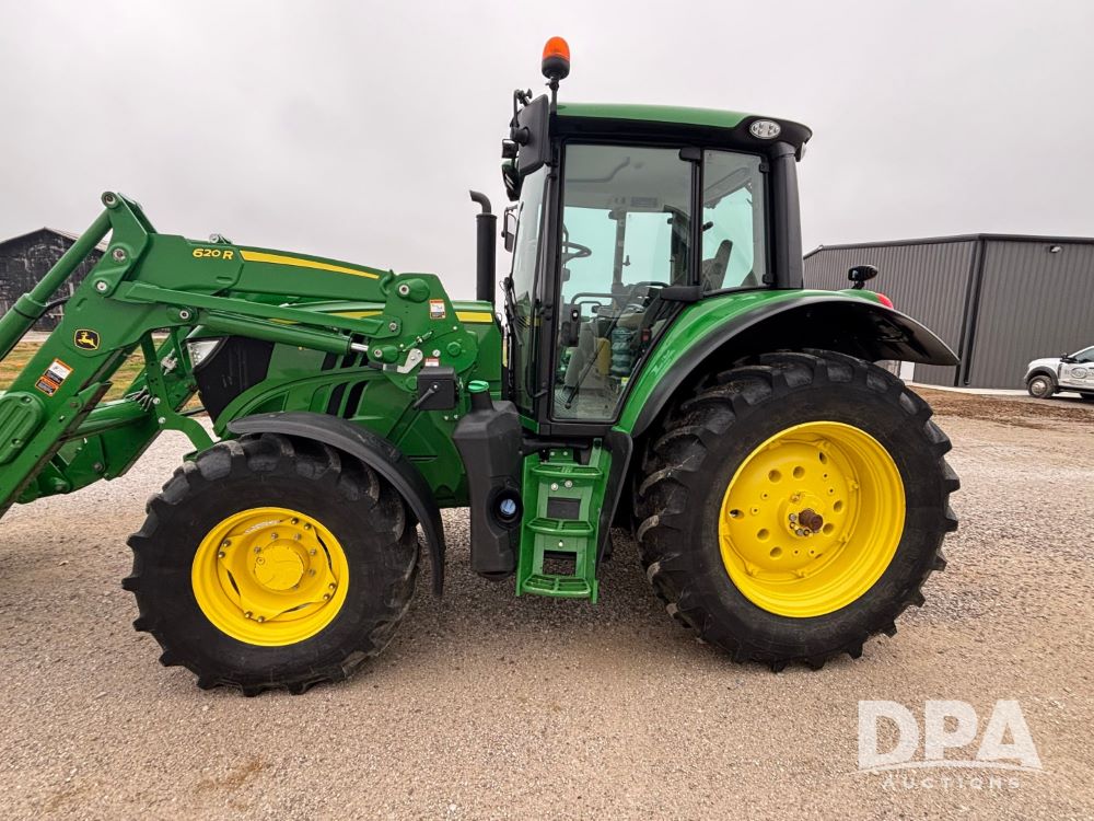 2023 John Deere 6130M Loader Tractor (LS0488), 130 hp diesel engine, def, 2022 620 John Deere loader attachment, rear 100/540 pto, 3pt, front wheel fenders, cloth seats, buddy seat, AM/FM Bluetooth capable radio, heat and air-conditioning, 3 hydraulic hookup, 499 hours.