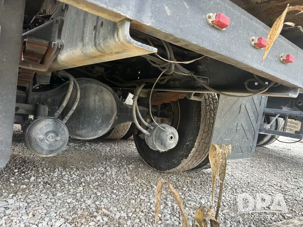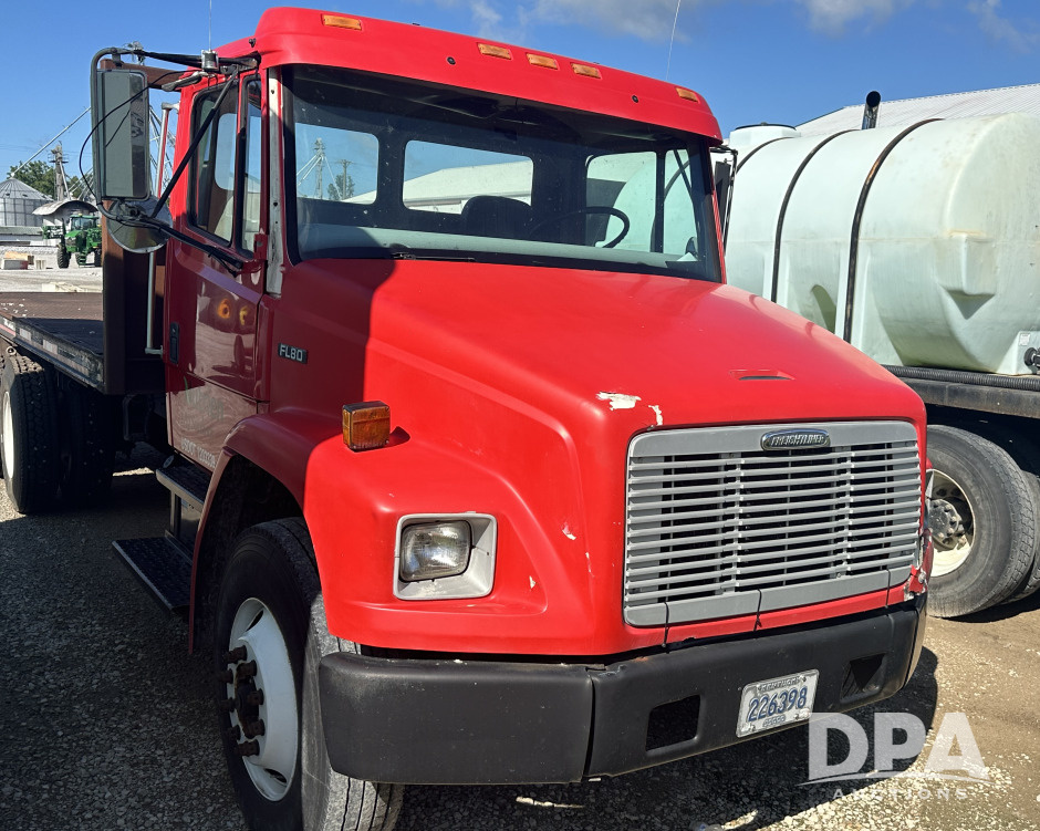 2001 Freightliner FL80 Flatbed (PZ14216, Unit 40221), Cat 3126 diesel engine, Eaton Fuller 9 speed transmission, heat, Am/Fm radio, cruise control, tandem axle, full screw, spring suspension, steel flatbed, headache rack, 11R22.5 tires, shows 277,781 miles.