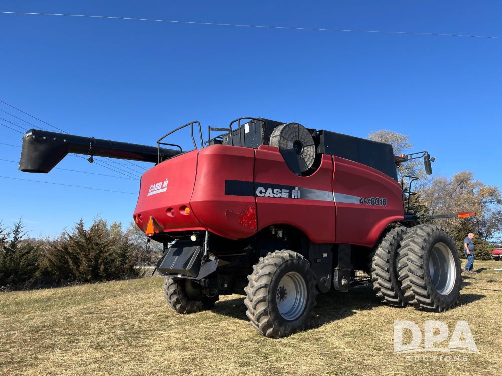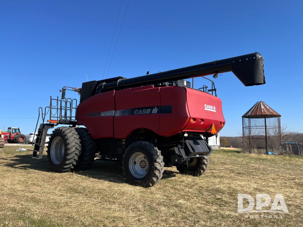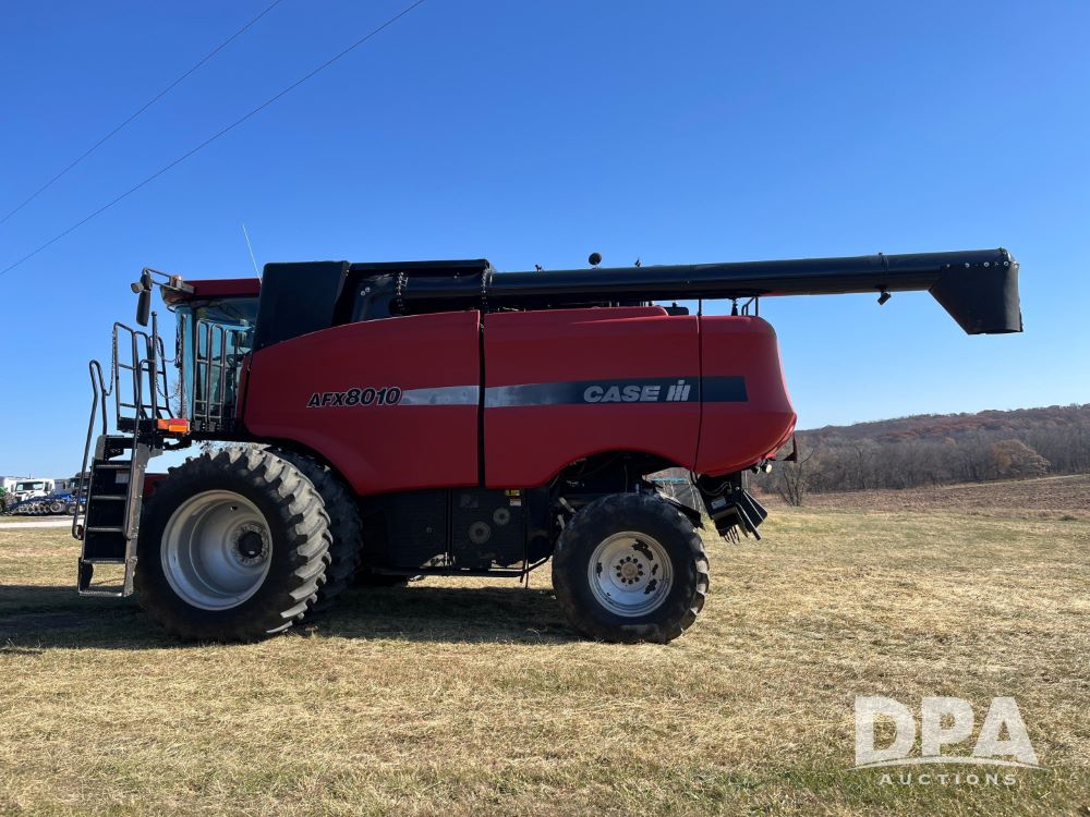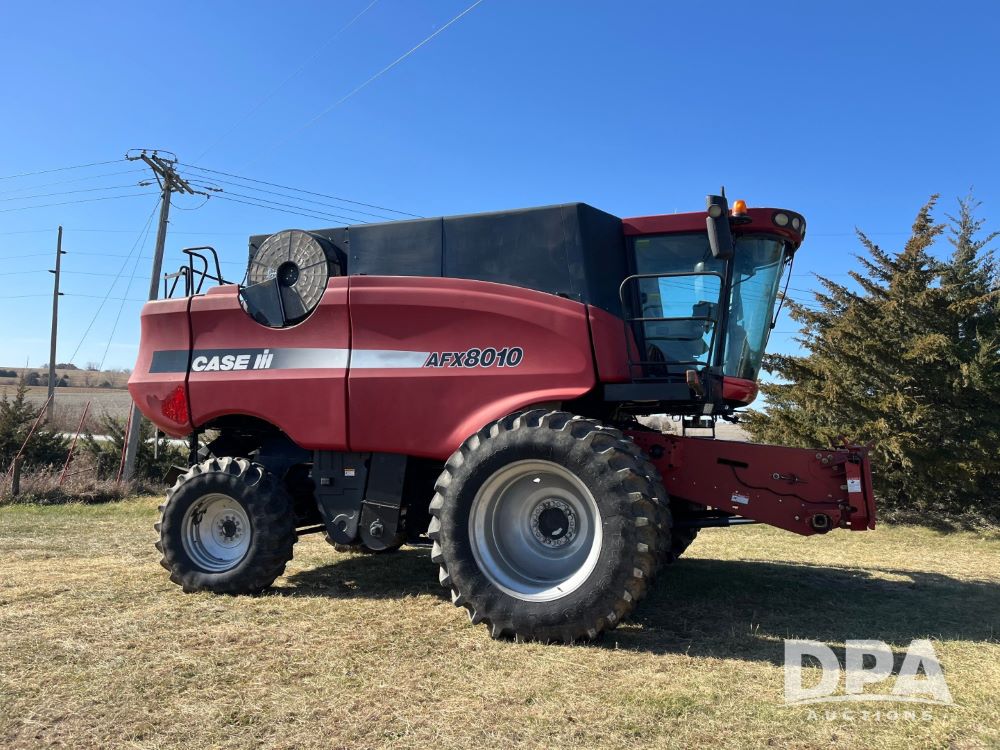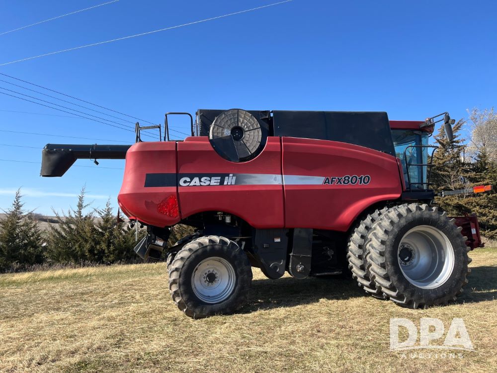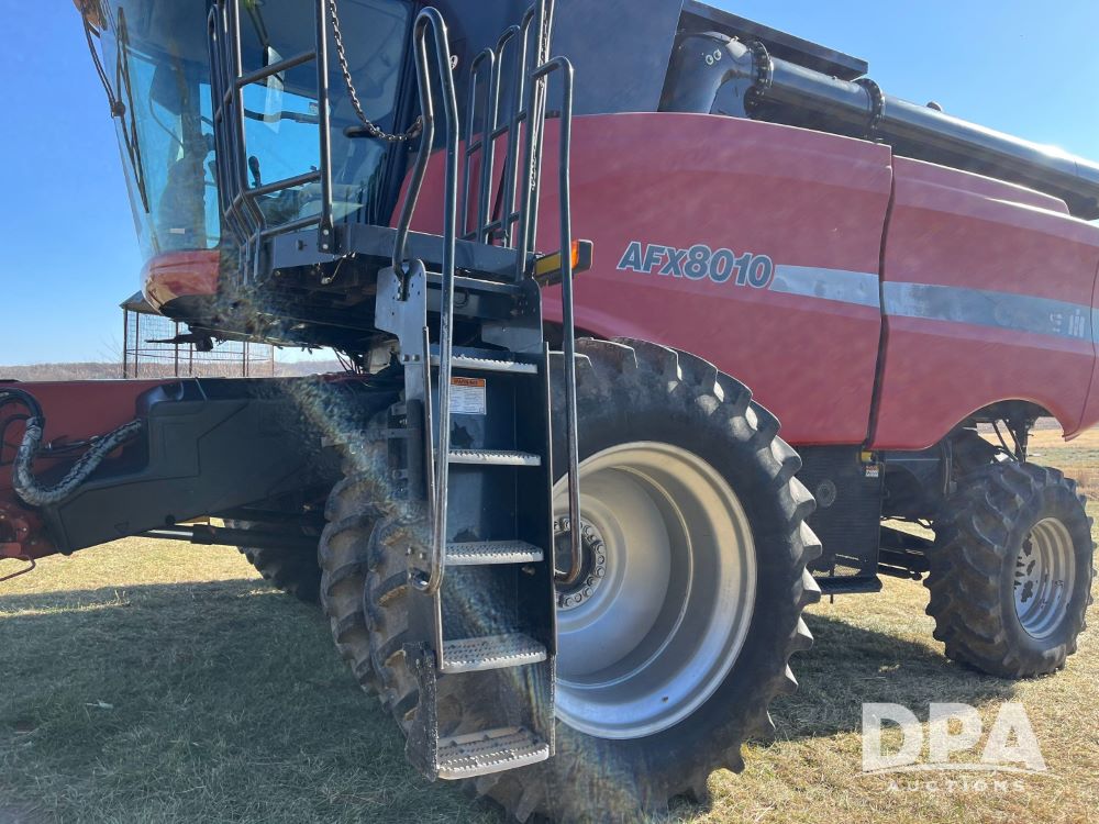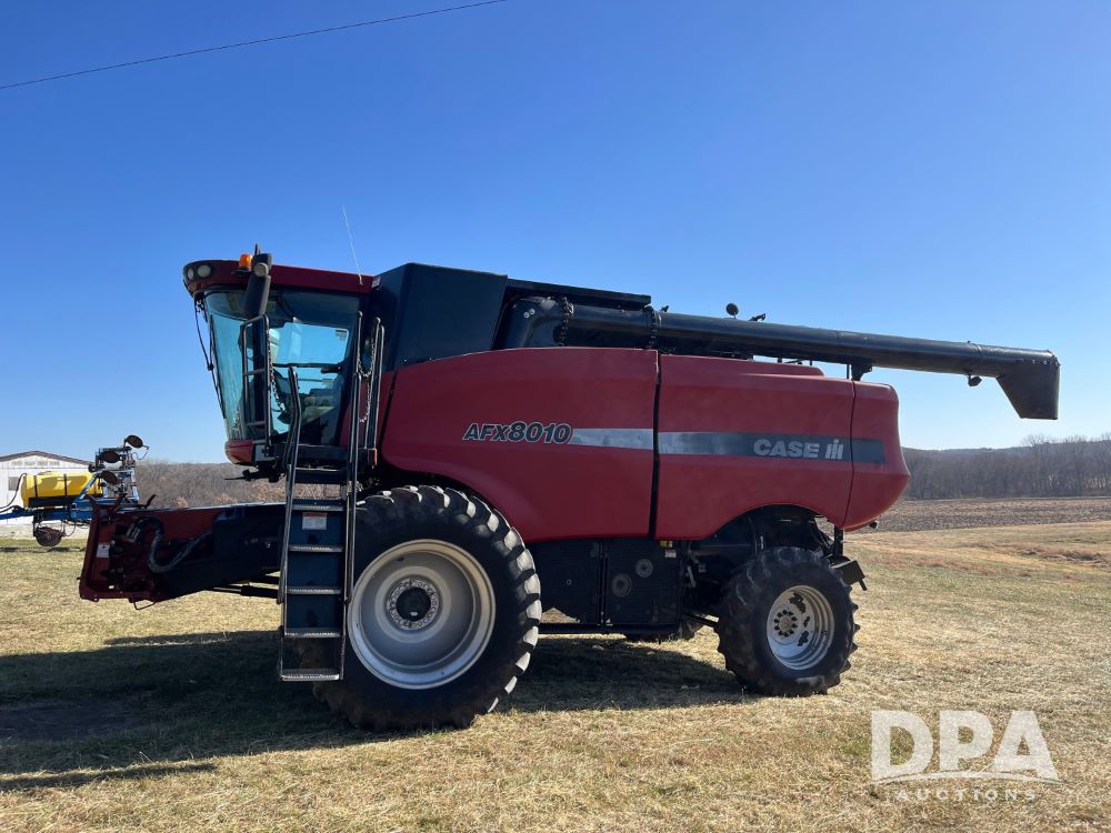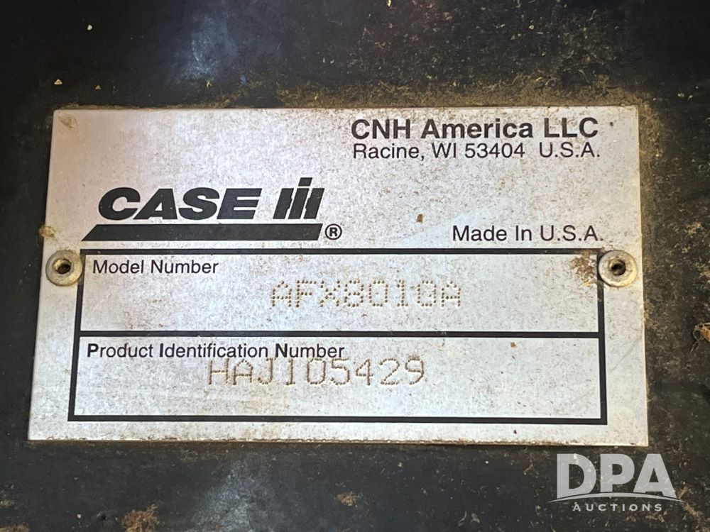 2004 Case IH AFX8010 Combine (JN3404), 10.3 Iveco engine, 400HP, Ag Leader yield and mapping monitor, rock trap, lateral tilt, rotor separator, chopper/spreader, fold down hopper, 330 bushel grain tank, 20.8R42 duals on drive axle, header cart tow hitch, shows 3,894 engine hours and 2,658 thresh hours.