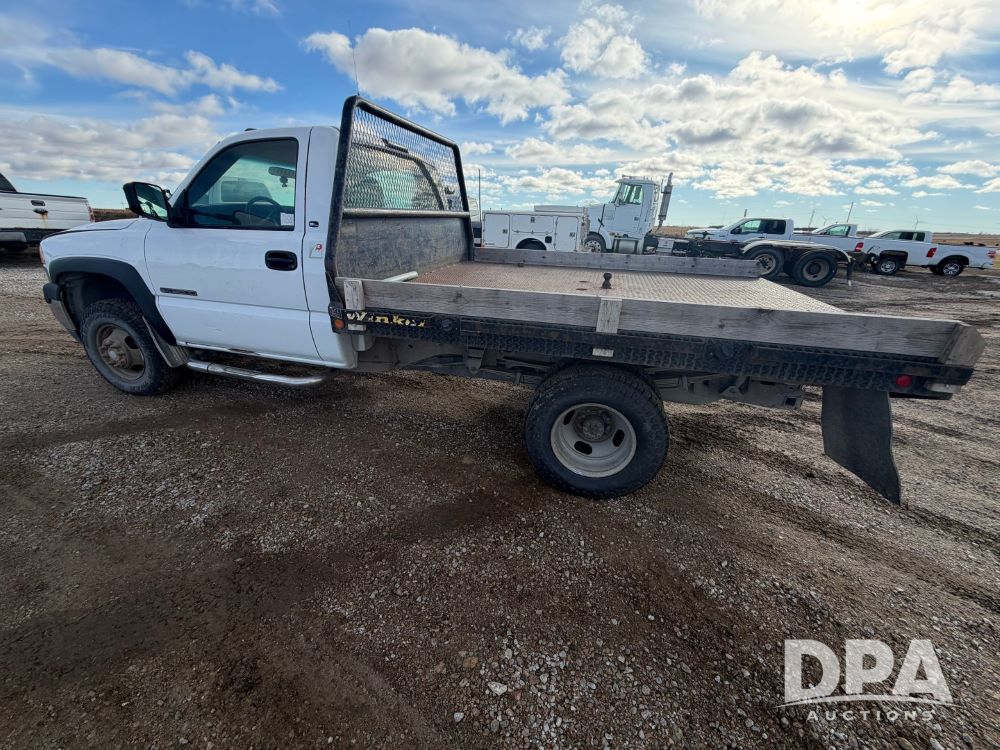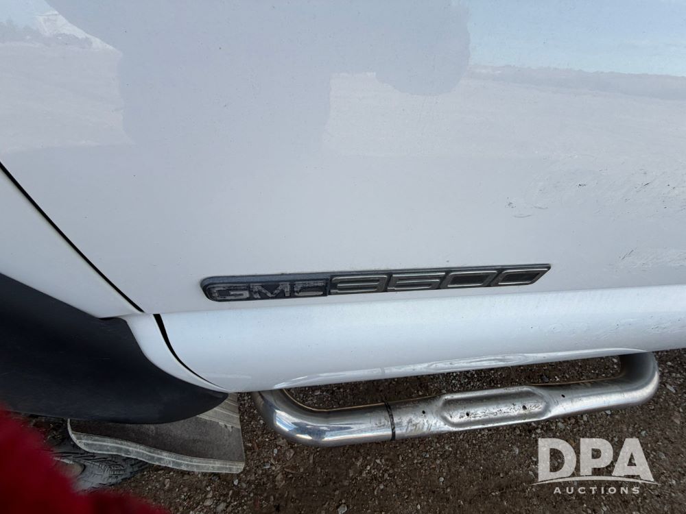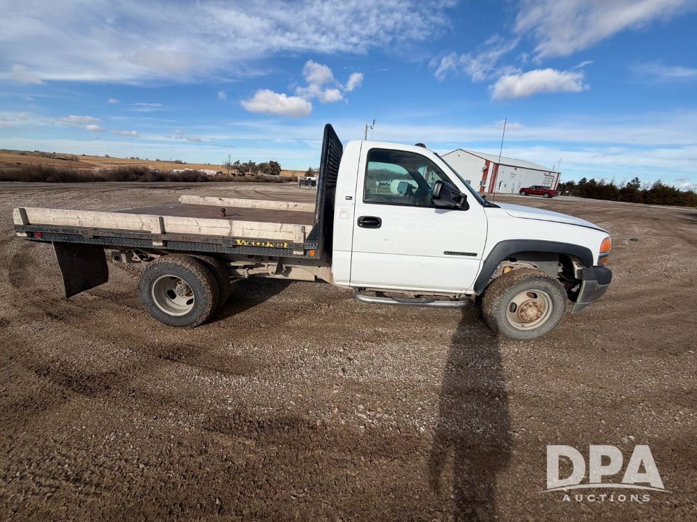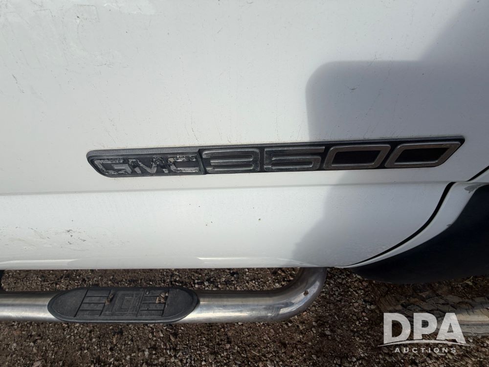 2001 GMC Sierra SL K3500 Dually (RR0573, Unit A19), SL model, gas engine, automatic transmission, regular cab, AC/heat, AM/FM radio, winkle steel flat bed with 5th wheel gooseneck ball, chrome running boards, receiver hitch, tow/haul mode, LT215/85R15 tires, shows 194,677 miles.