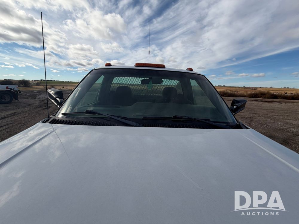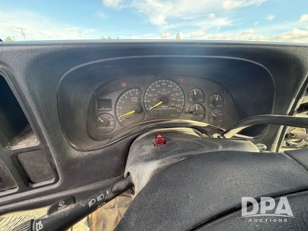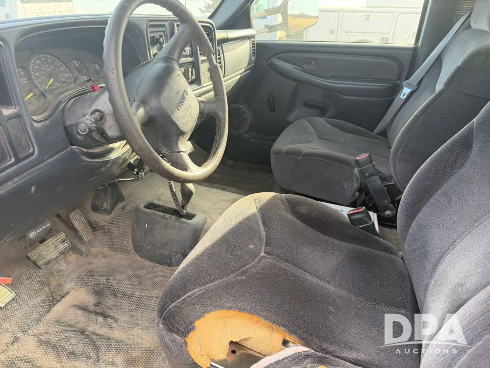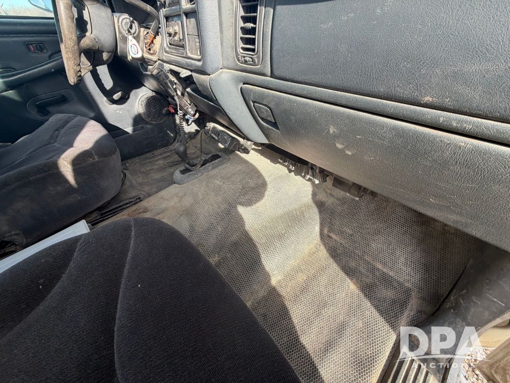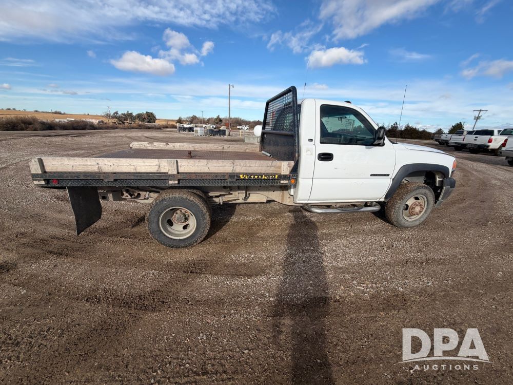 2001 GMC Sierra SL K3500 Dually (RR0573, Unit A19), SL model, gas engine, automatic transmission, regular cab, AC/heat, AM/FM radio, winkle steel flat bed with 5th wheel gooseneck ball, chrome running boards, receiver hitch, tow/haul mode, LT215/85R15 tires, shows 194,677 miles.