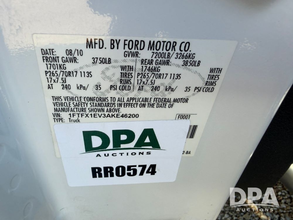 2010 Ford XLT F-150 Pickup (RR0574, Unit T27), Triton flex fuel gas 5.4L, automatic transmission, 4X4, electric windows and locks, cruise, tow and haul mode, cloth interior, crew cab, AM/FM/CD/Sirius radio, tow hooks, chrome running boards, aluminum rims, lined 6.5' box, receiver hitch, LT265/70R17 tires, shows 296,161 miles.
