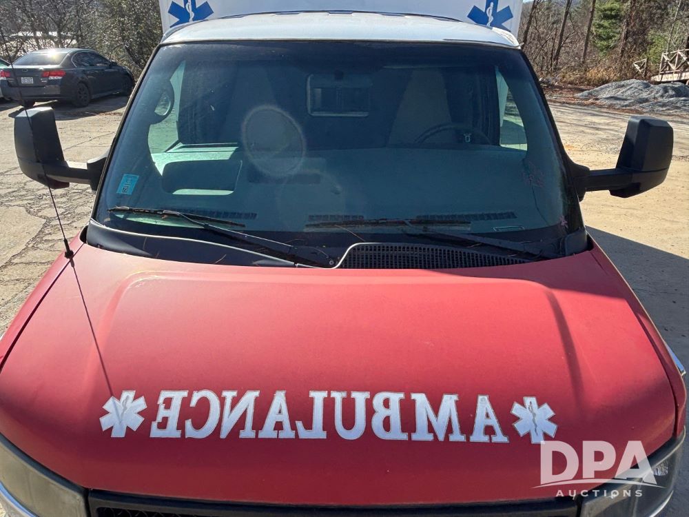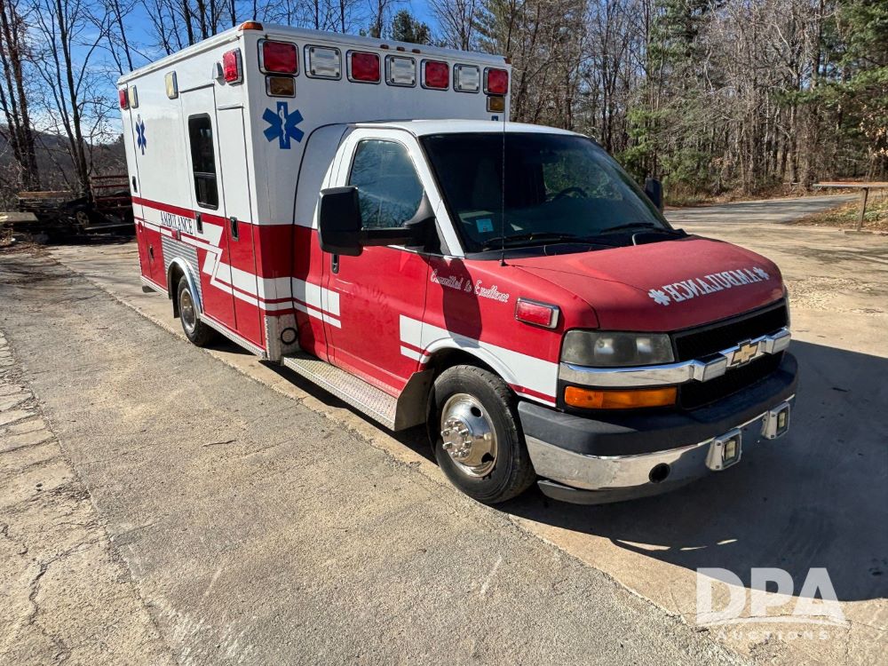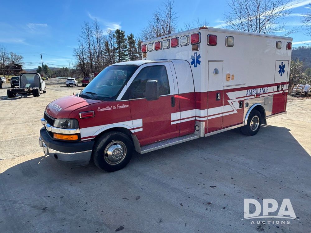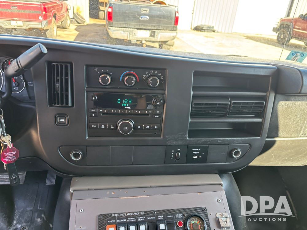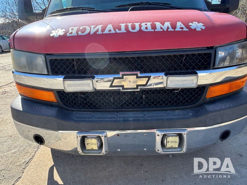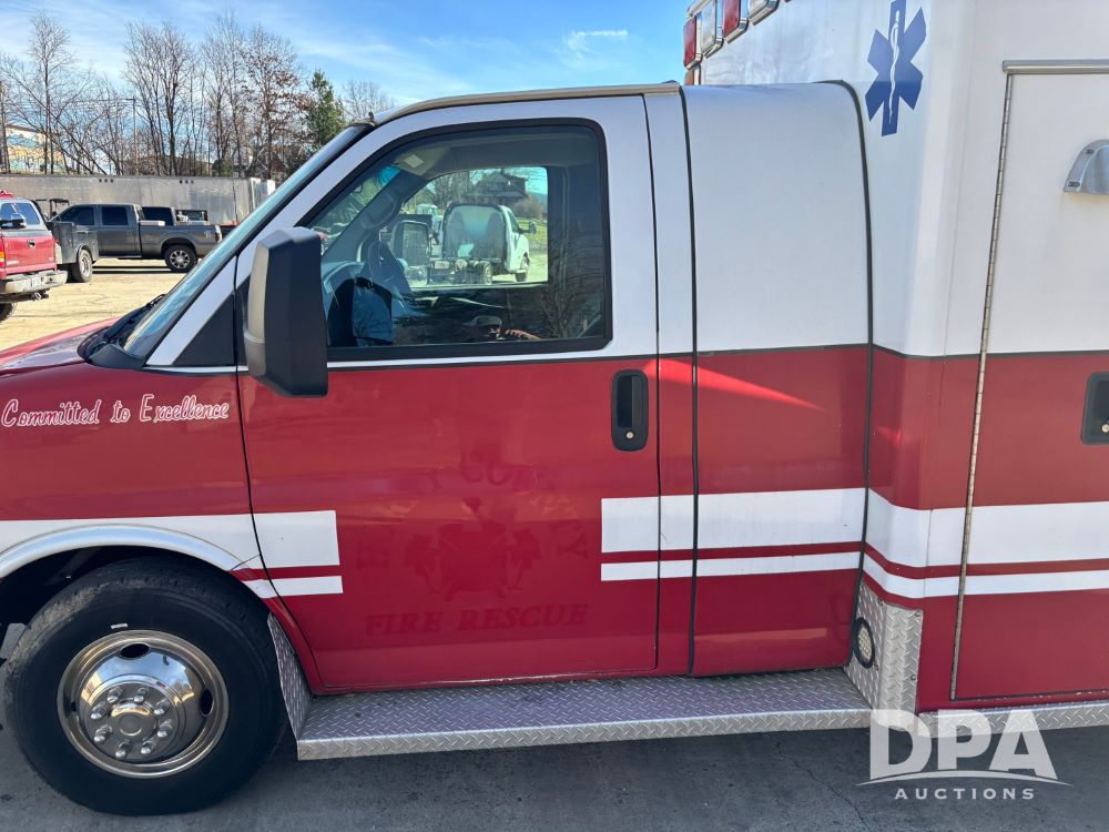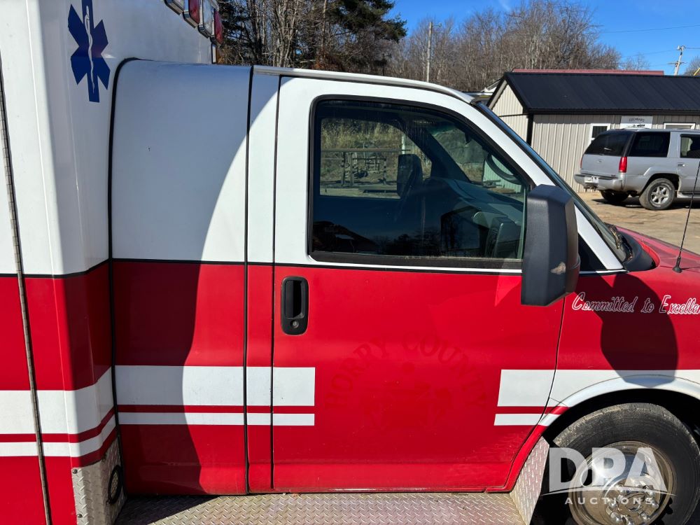 2014 Chevy G4500 Ambulance (GP12154), 6,6L Duramax diesel engine, 4 X 2, automatic transmission, towing capacity of 9200 pounds, Type III vehicle, LED emergency lighting, air conditioning, heat, specialized storage and seating, ample cabinet space, large compartments for equipment storage, shows 218,843 miles.