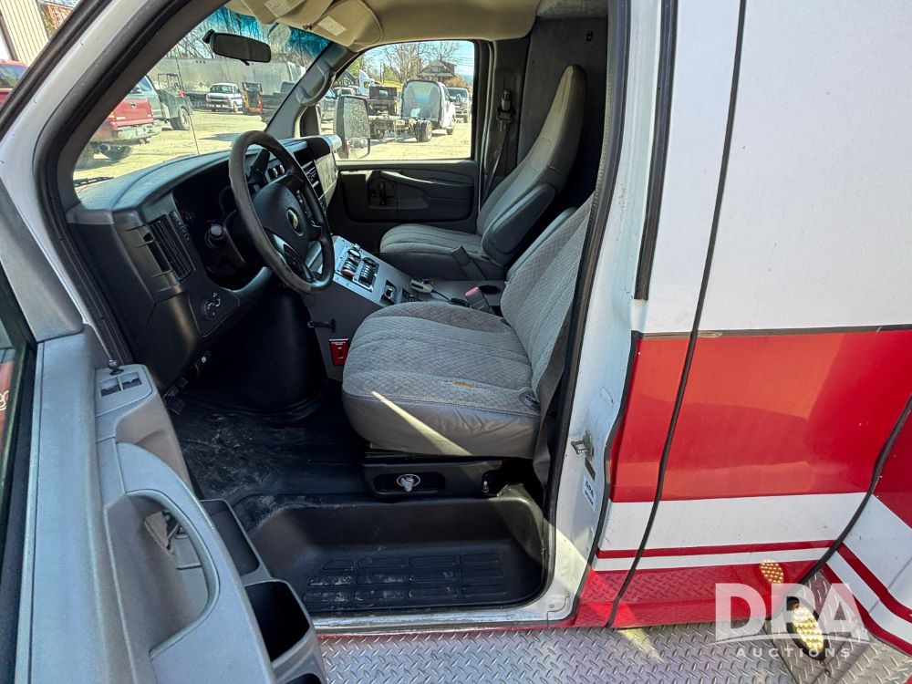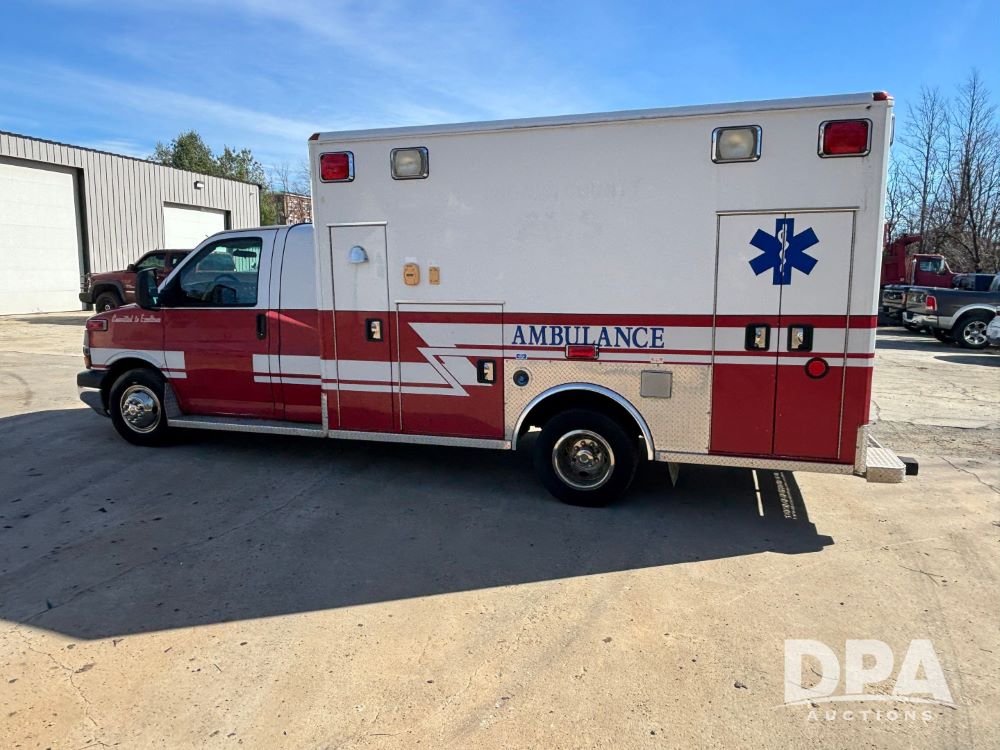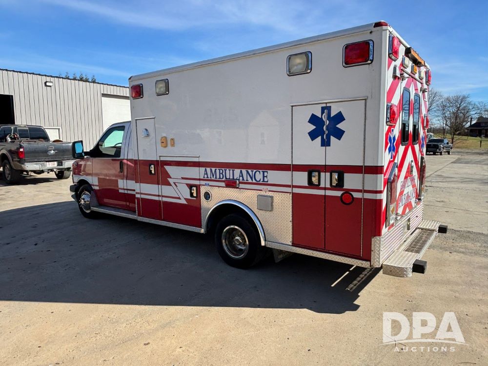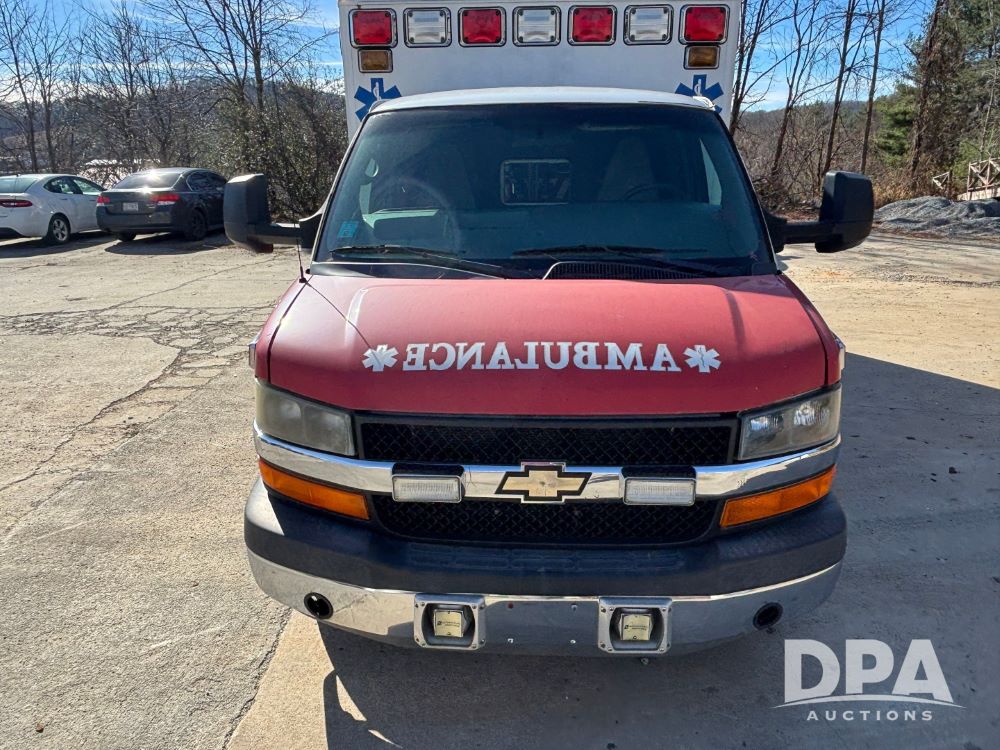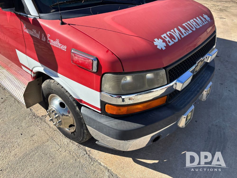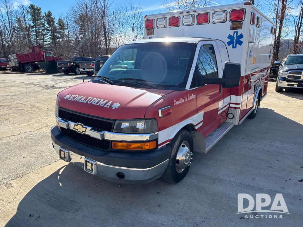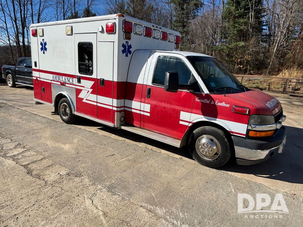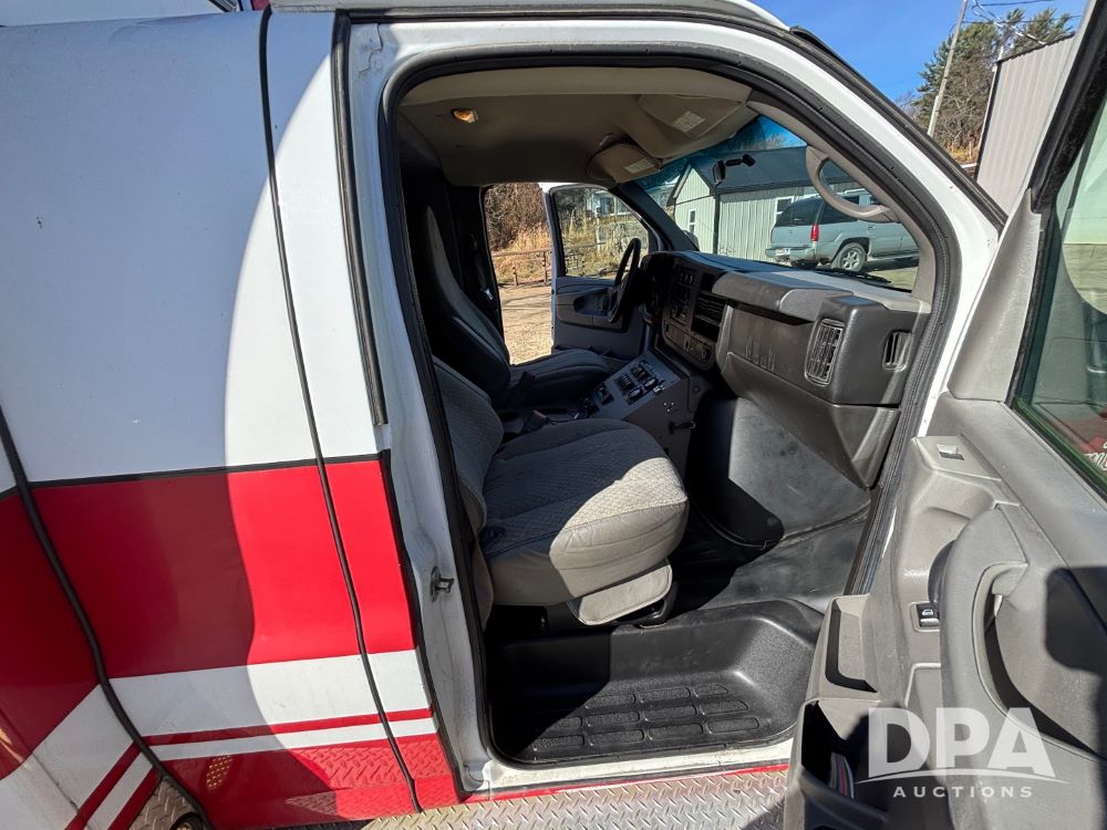 2014 Chevy G4500 Ambulance (GP12154), 6,6L Duramax diesel engine, 4 X 2, automatic transmission, towing capacity of 9200 pounds, Type III vehicle, LED emergency lighting, air conditioning, heat, specialized storage and seating, ample cabinet space, large compartments for equipment storage, shows 218,843 miles.