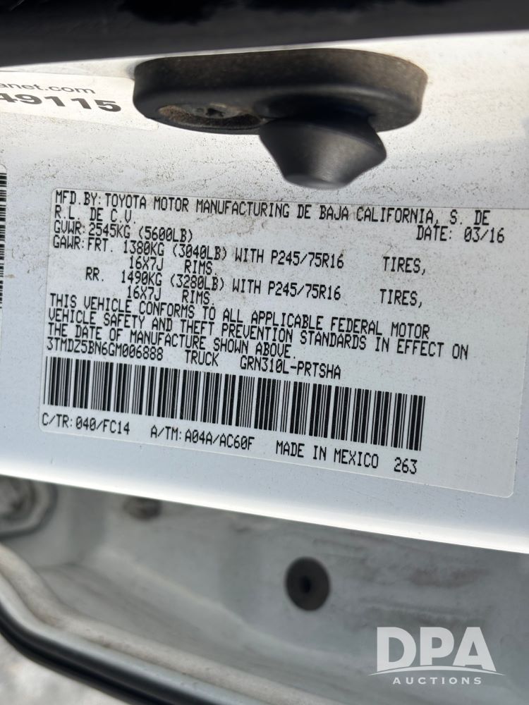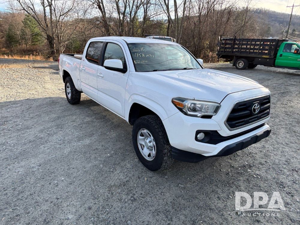 2016 Toyota Tacoma Crew Cab Pickup (GP12133), 4X4, D 4S V6 engine, automatic transmission, Crew Cab, bed liner, toolbox, tow hitch, shows 173,945 miles.