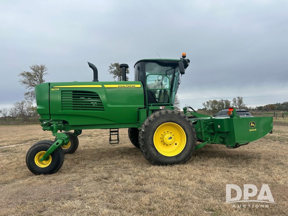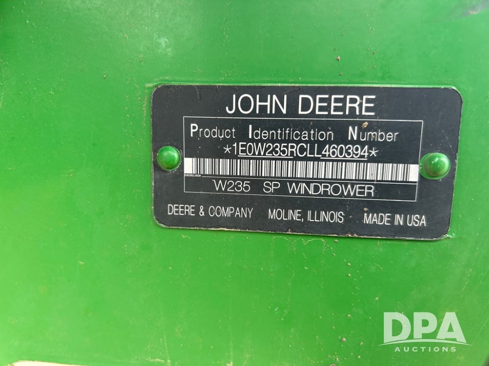 2020 John Deere W235 Windrower (JM667), John Deere diesel engine, hydrostatic ground drive, hydraulic platform drive, John Deere R500 rotary platform (S/N: 1E0500RSCLL460661) head included, 16 ft. cutting width, enclosed cab, buddy seat, suitcase weights, air conditioning, heat, AM/FM radio, front tires- 16.5L-16.1SL, rear tires- 520/85R38, 592.8 hours.