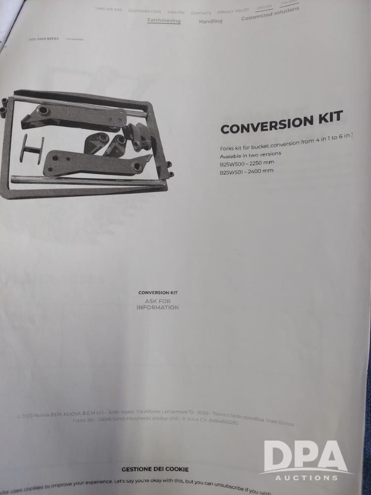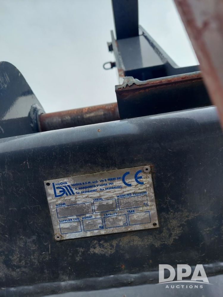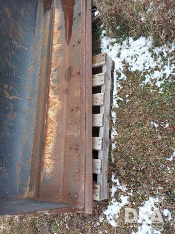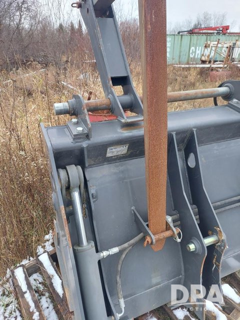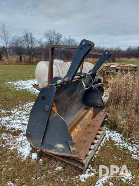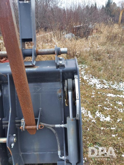 Multifunction 6-in-1 Loader Bucket (JM677), 98in wide bucket was removed from a New Holland LB95-B loader, forks that flip over, scoop with a grader blade, bulldozer blade, and includes clamps.