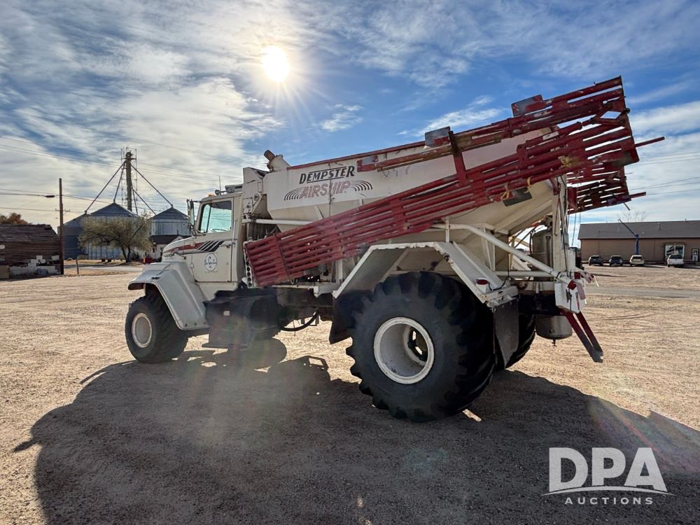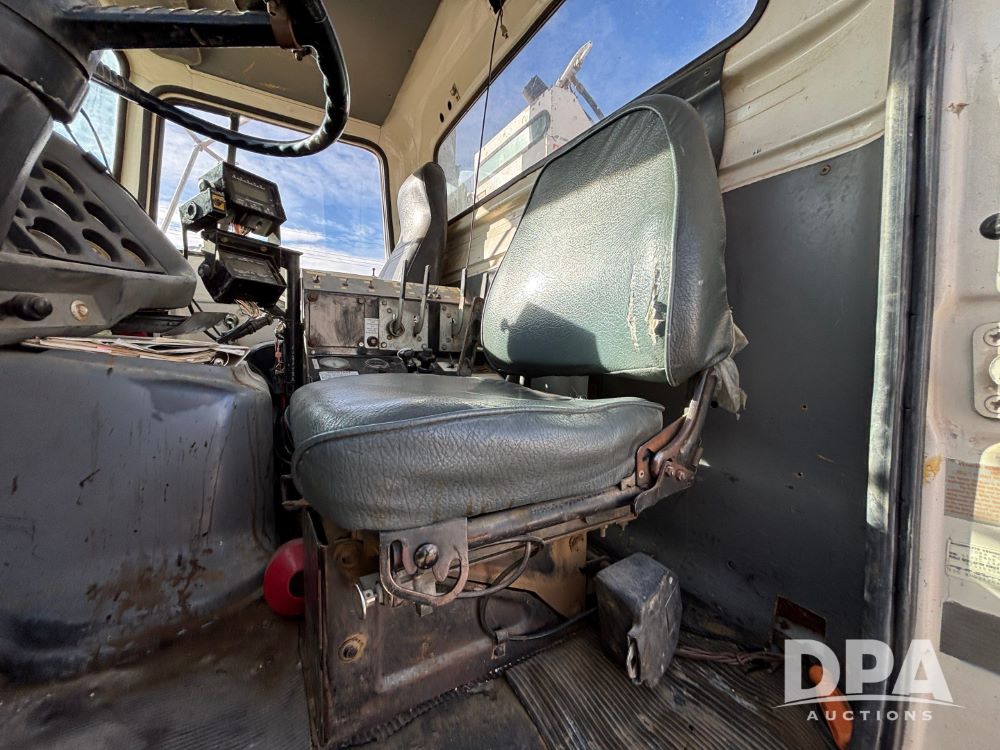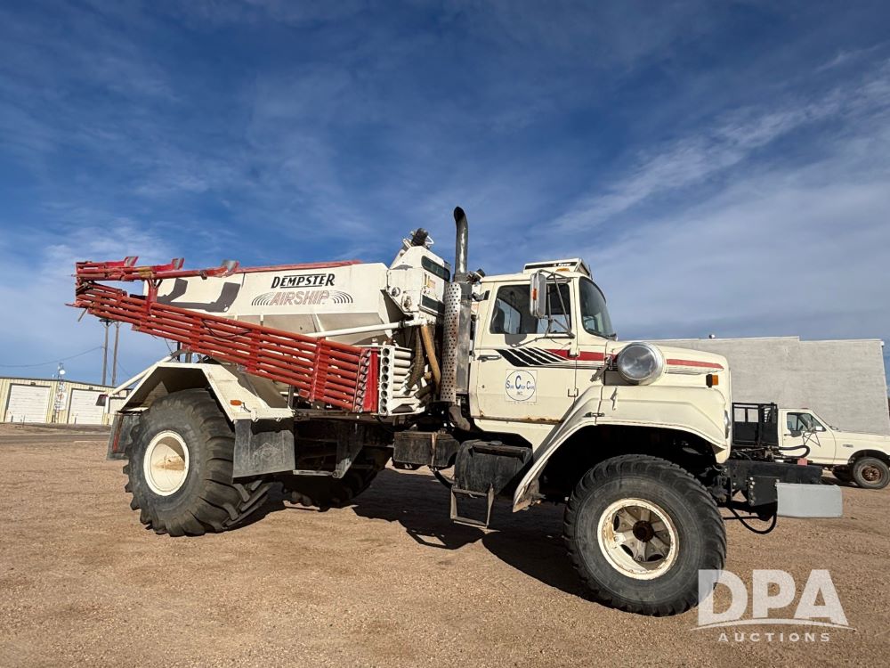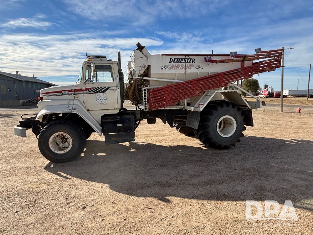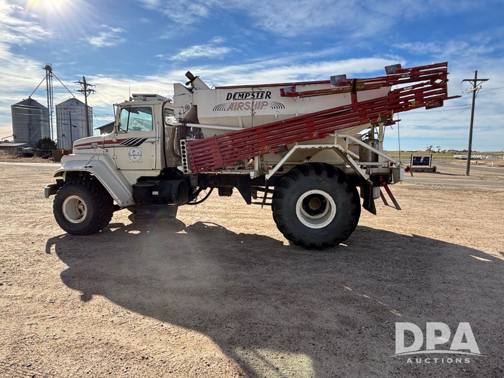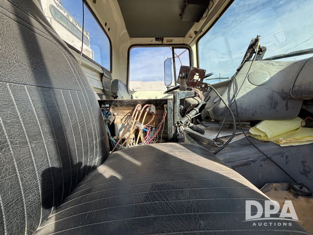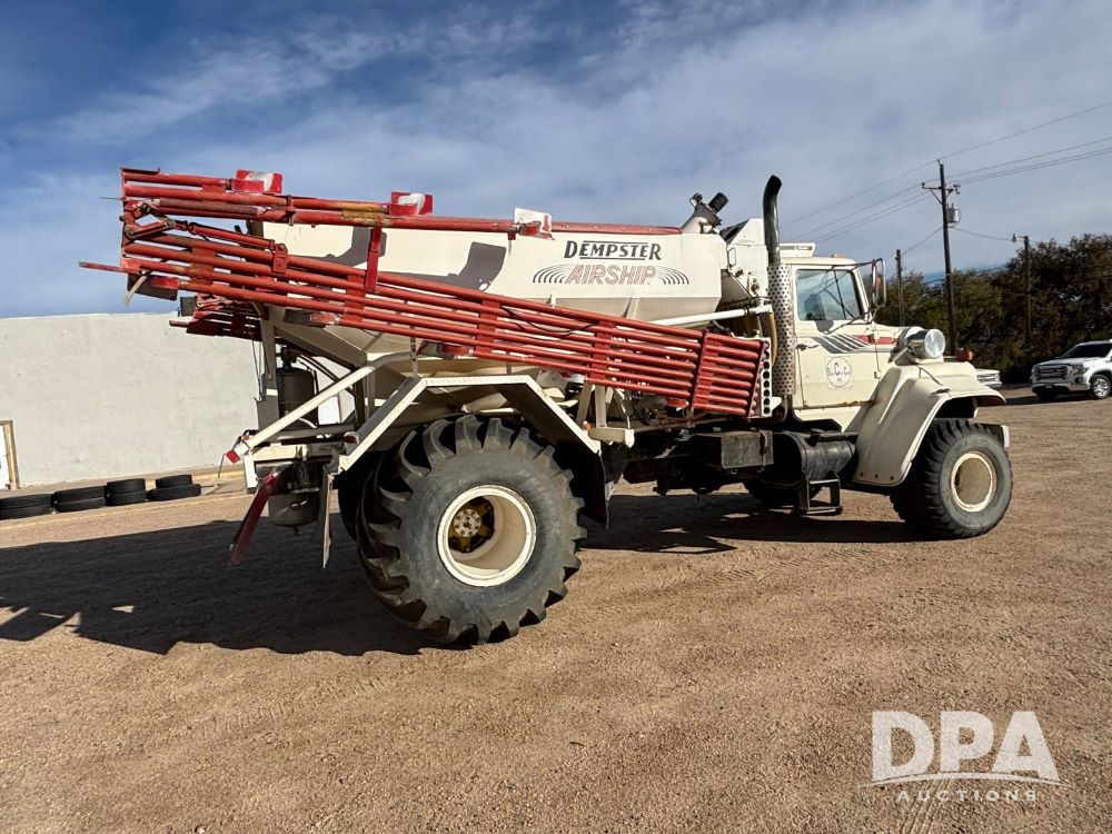 Ford Dempster Airship (GP11959), Cummins engine, automatic transmission, 60 foot boom, 75 gallon tank, single hopper box, approx. 7 ton, shows 10,682 miles.