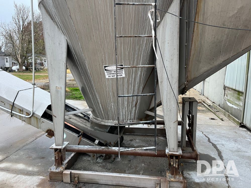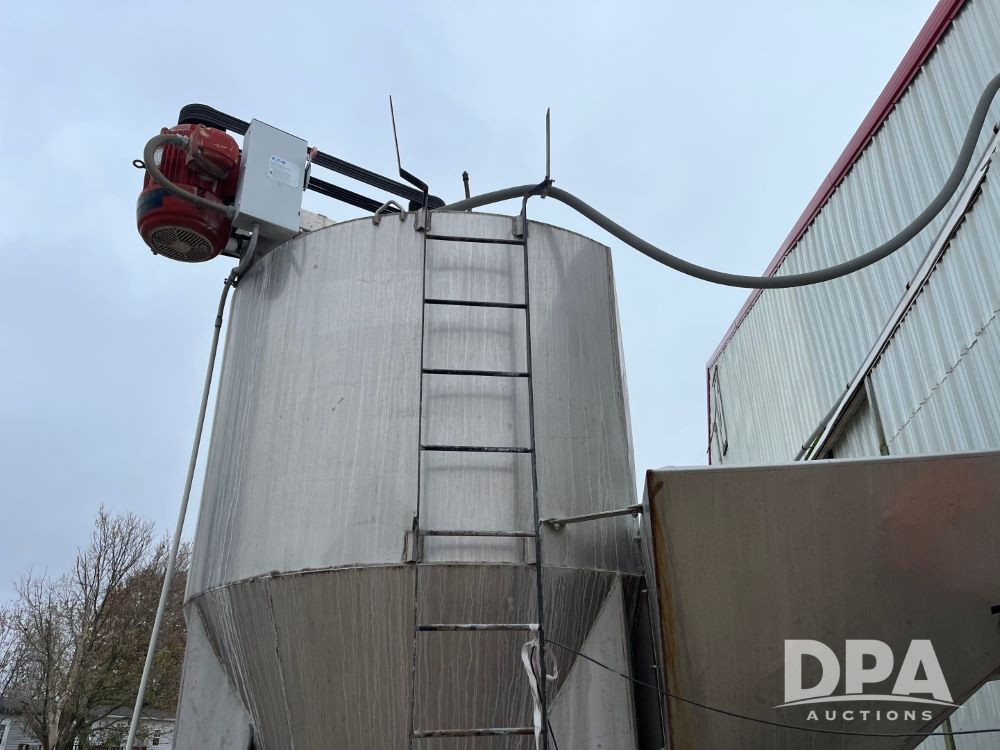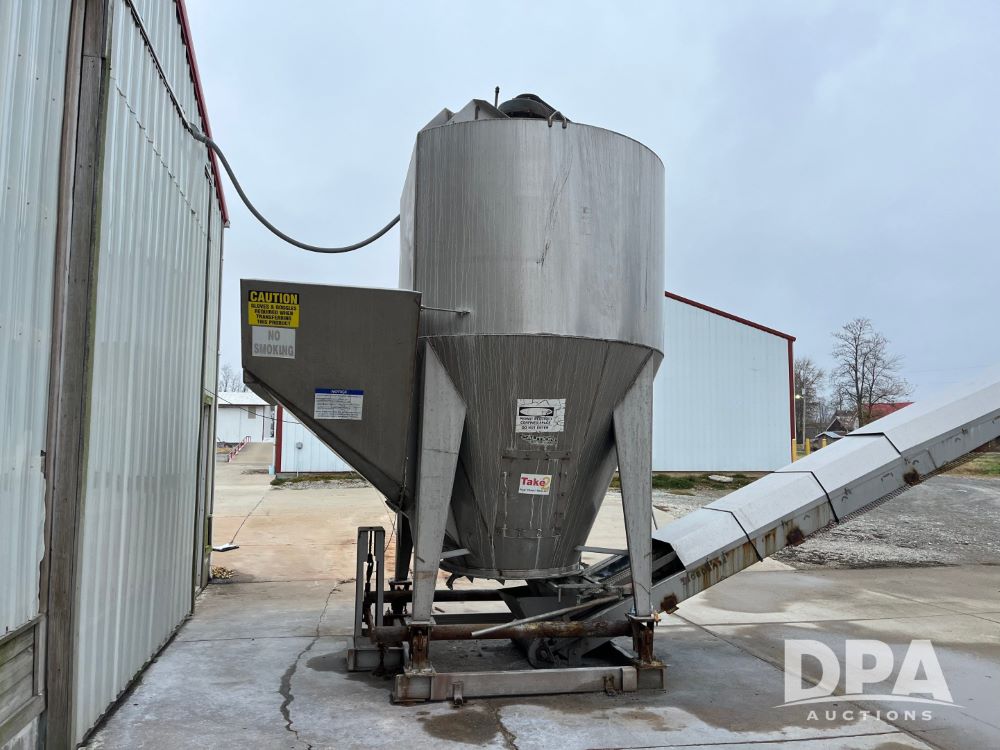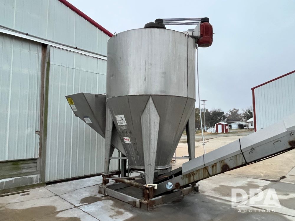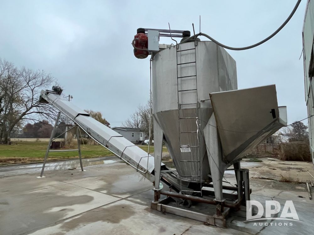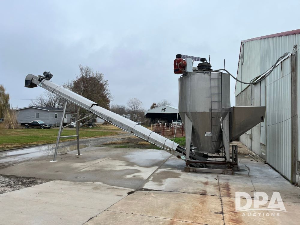 Stainless Steel Blender (JN3497), 8 ton stainless steel vertical blender, stainless steel hopper, electric motor, Doyle stainless steel loadout conveyor, S/N 120808A32, scales, control box, 420HE digital readout.