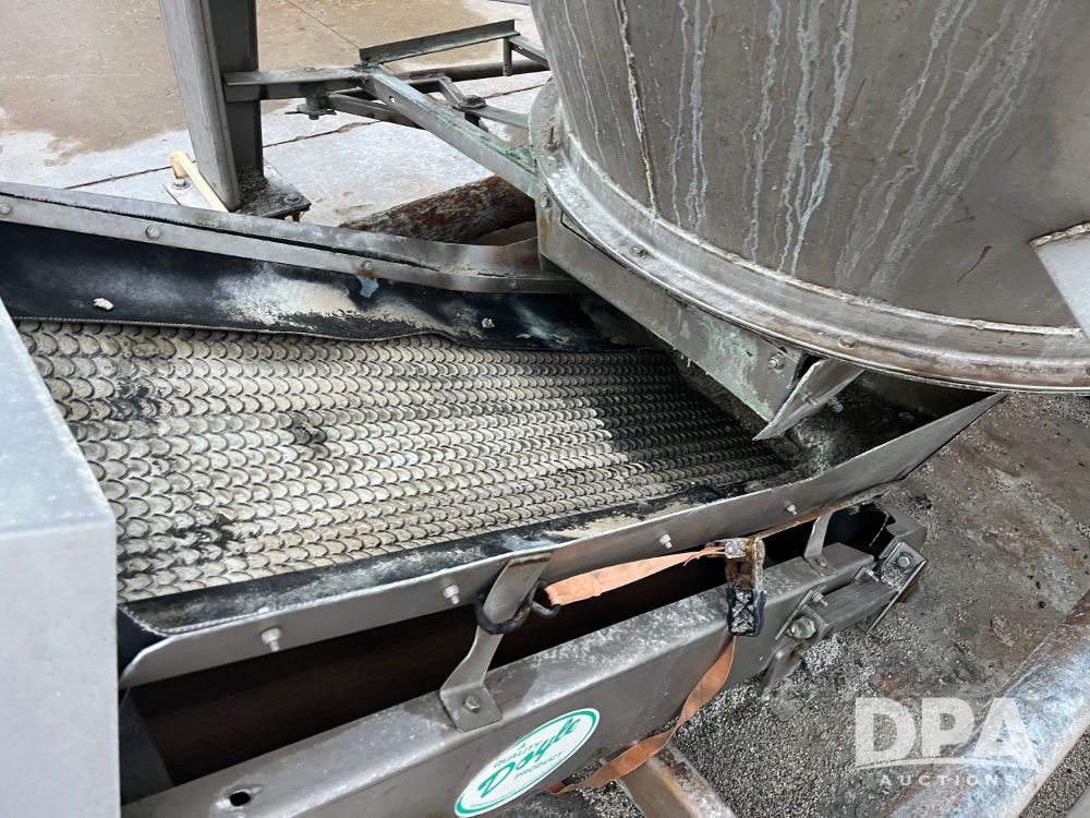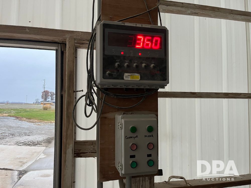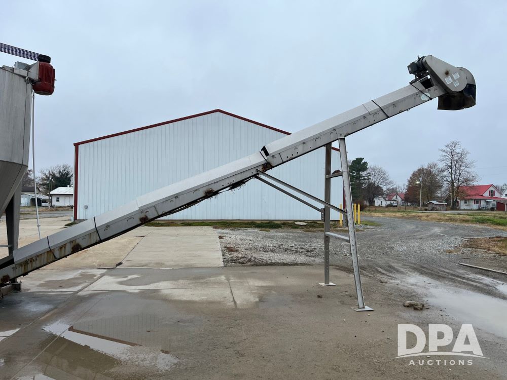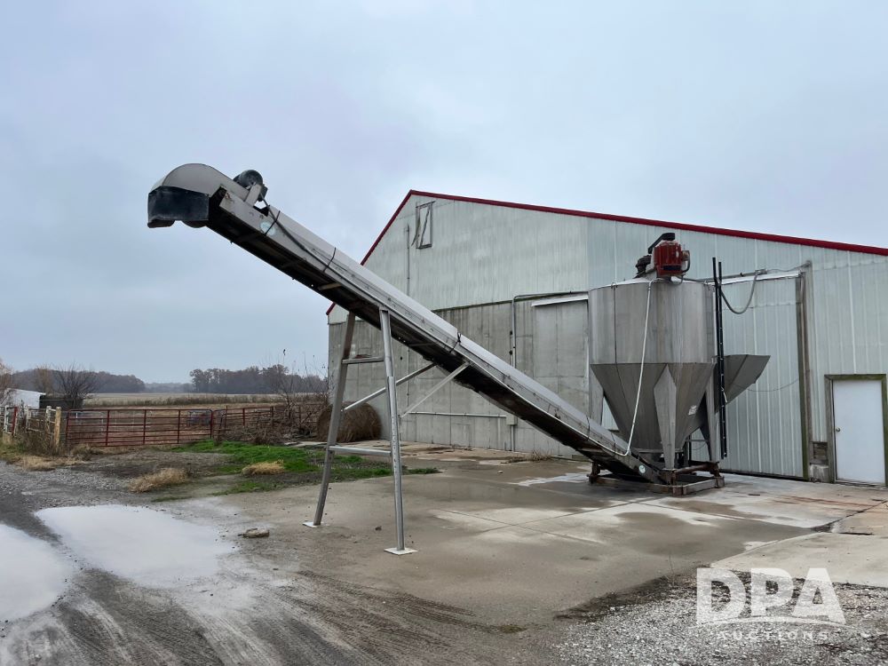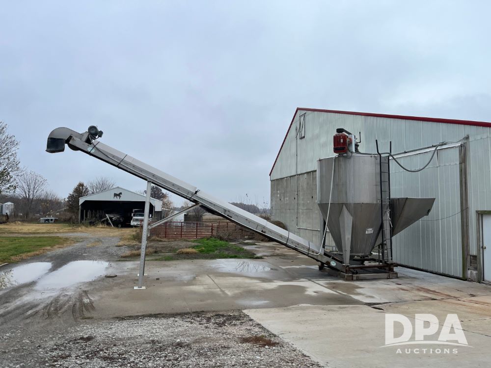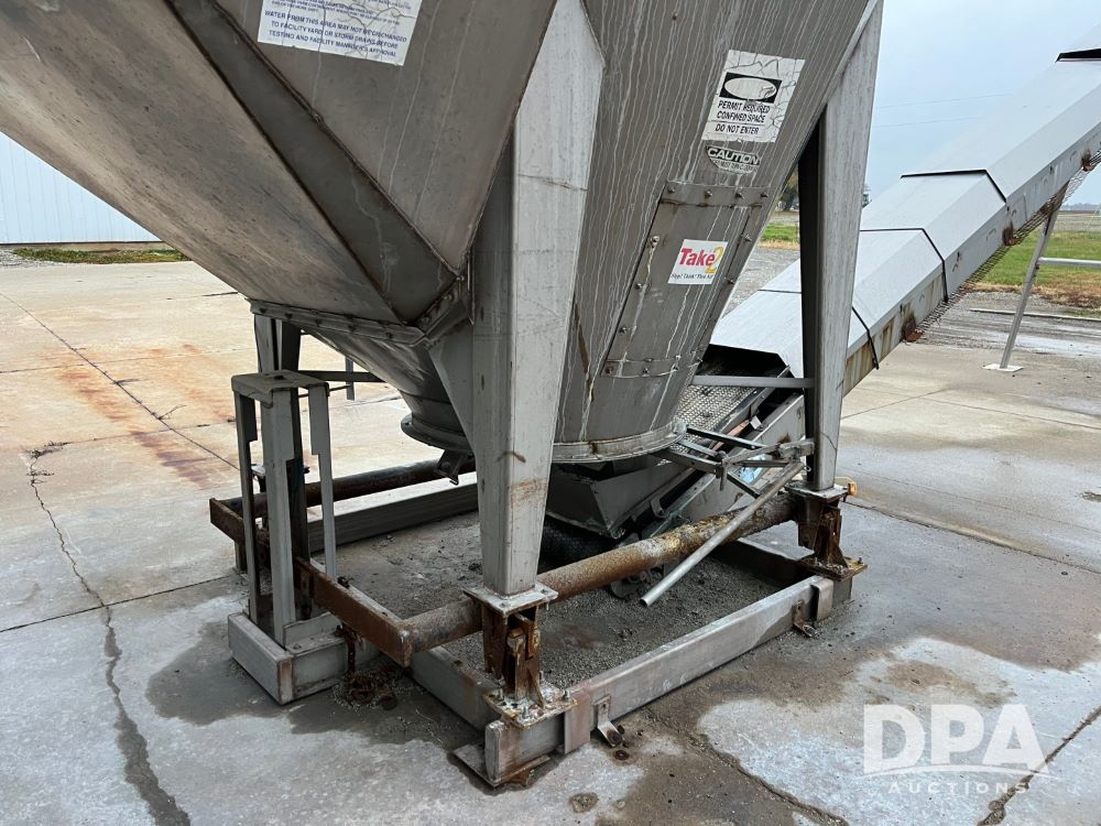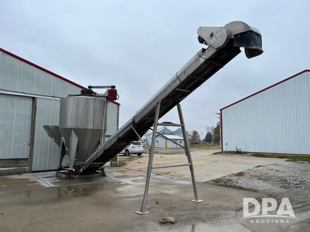 Stainless Steel Blender (JN3497), 8 ton stainless steel vertical blender, stainless steel hopper, electric motor, Doyle stainless steel loadout conveyor, S/N 120808A32, scales, control box, 420HE digital readout.