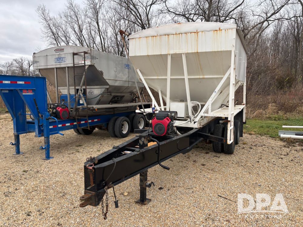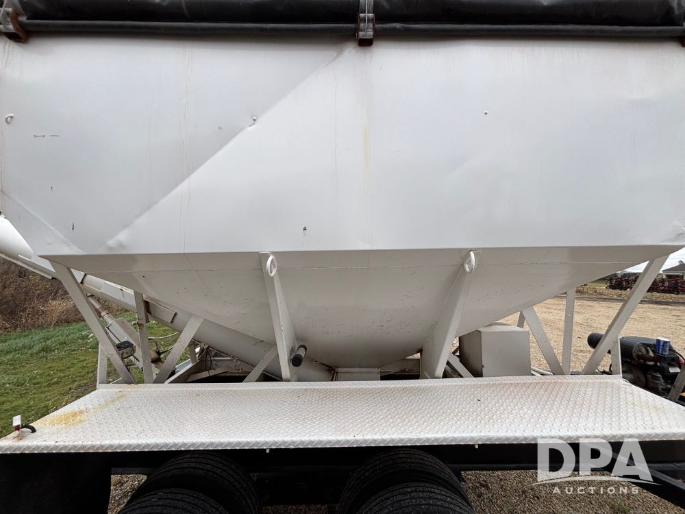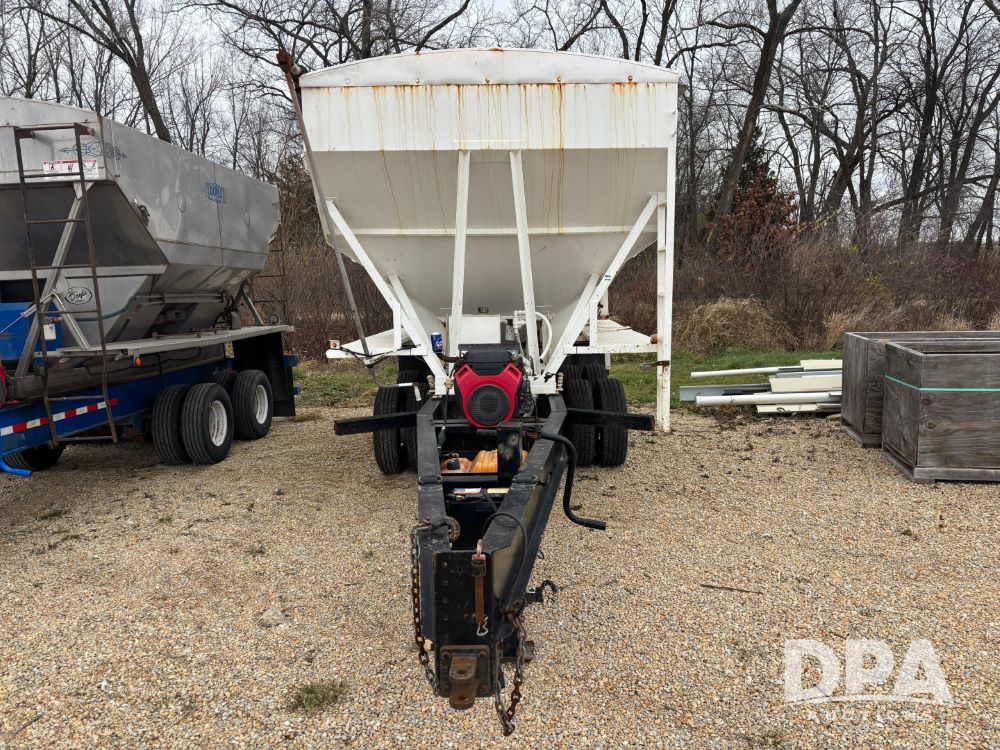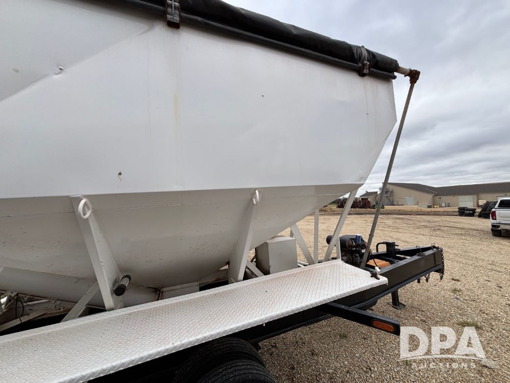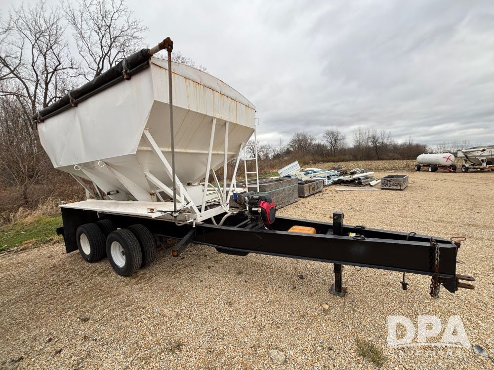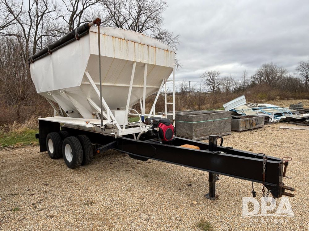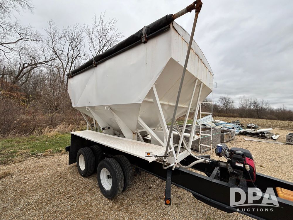 2009 B-B Dry Tender Trailer (GP12136), 10 ton 2 compartment dry tender box, rear discharge auger, roll over tarp, Honda electric start gas engine, 2009 B-B trailer, tandem axle, ST235/85R16 tires.