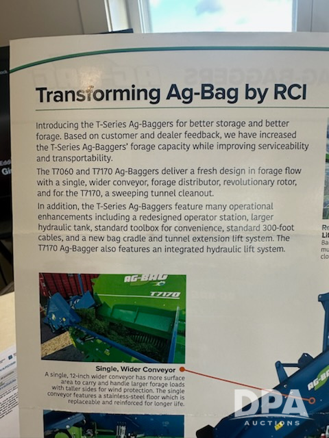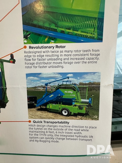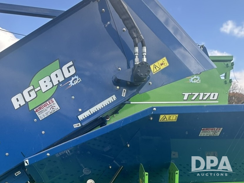 2022 Ag-Bag T7170 Silage Bagger (MN1155), 10ft tunnel, self contained hydraulics, 1000 PTO, single wide infeed conveyor, hydraulic conveyor lift, 300ft cables, cable rewind, hydraulic tunnel cleanout, bag boom and cradle, hydraulic jacks (to move from transport to bagging position), steel back stop, 235/75R17.5 tires.