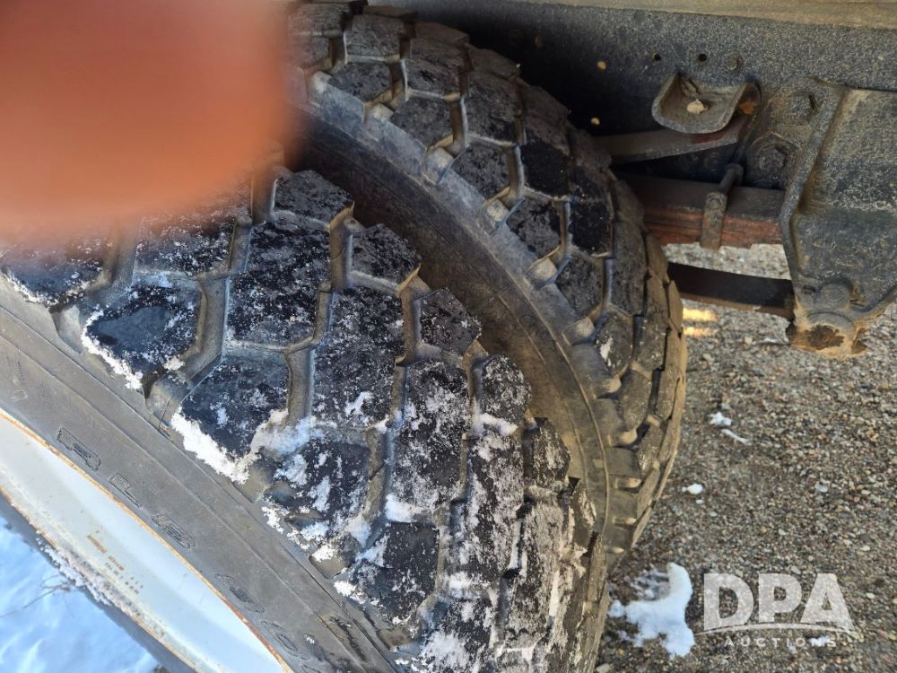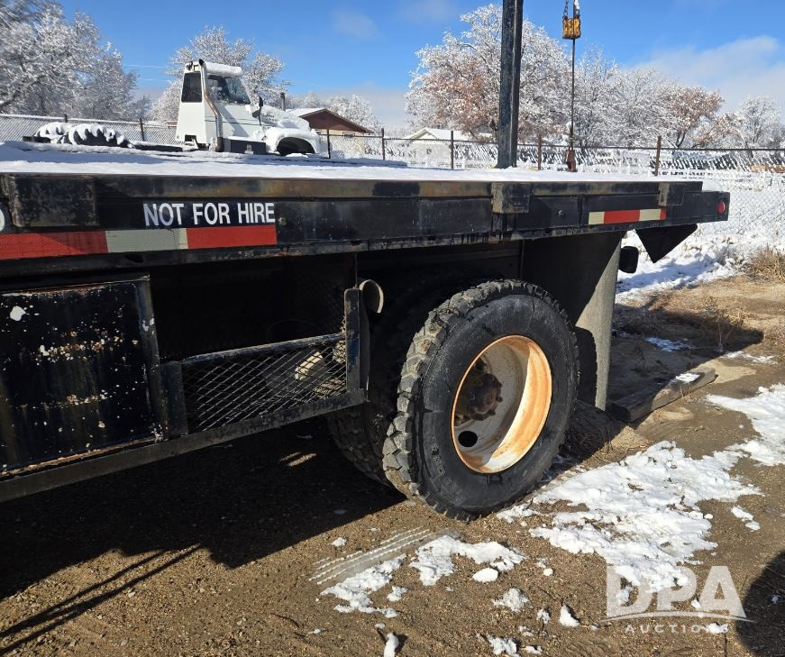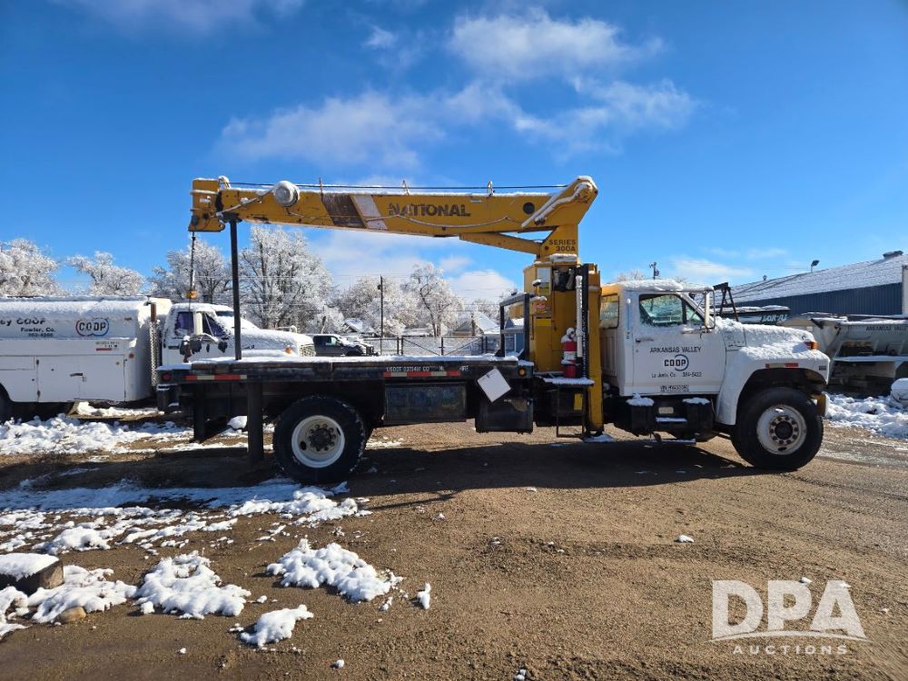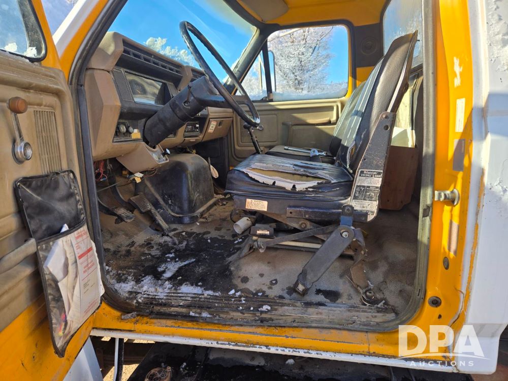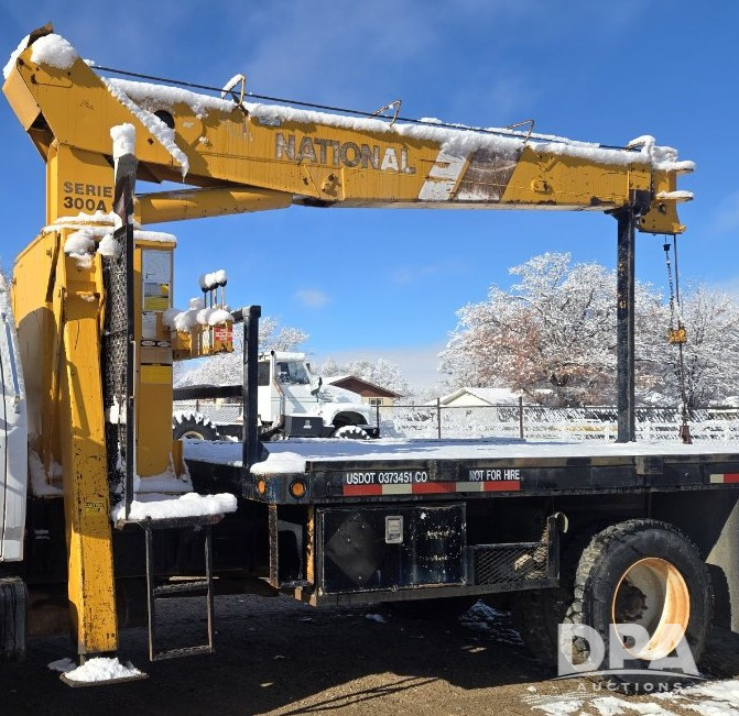 1987 Ford F800 Boom Truck (ED5346), 7.8L inline 6 engine, 5 speed with 2 speed rearend transmission, heat, boom crane, 11R22.5 tires, shows 134,384 miles.