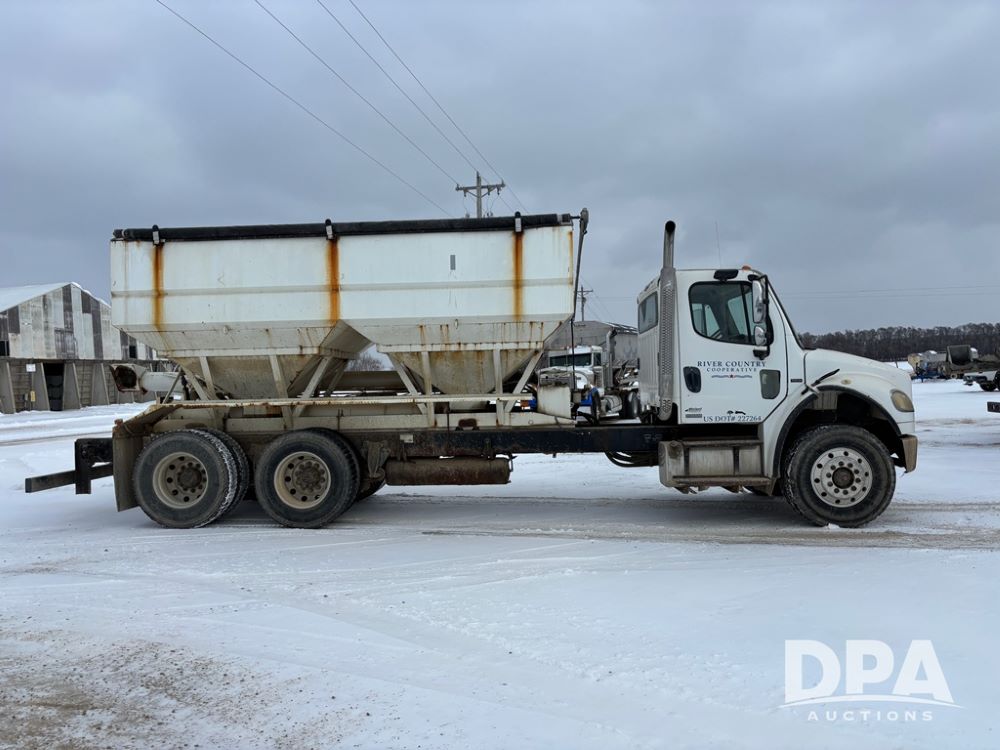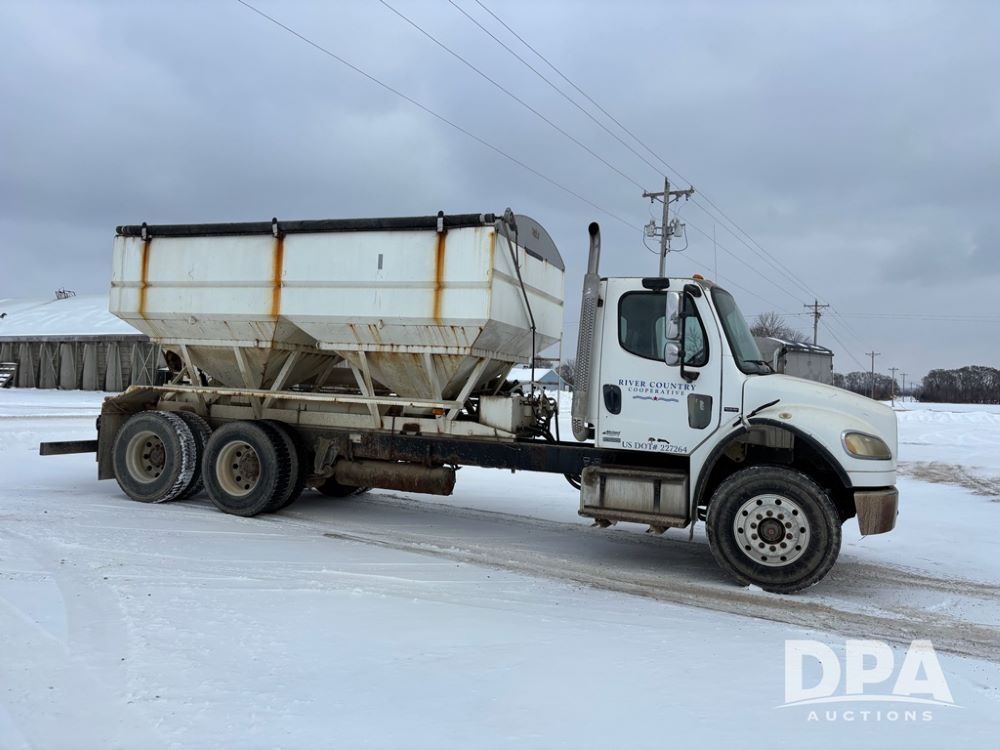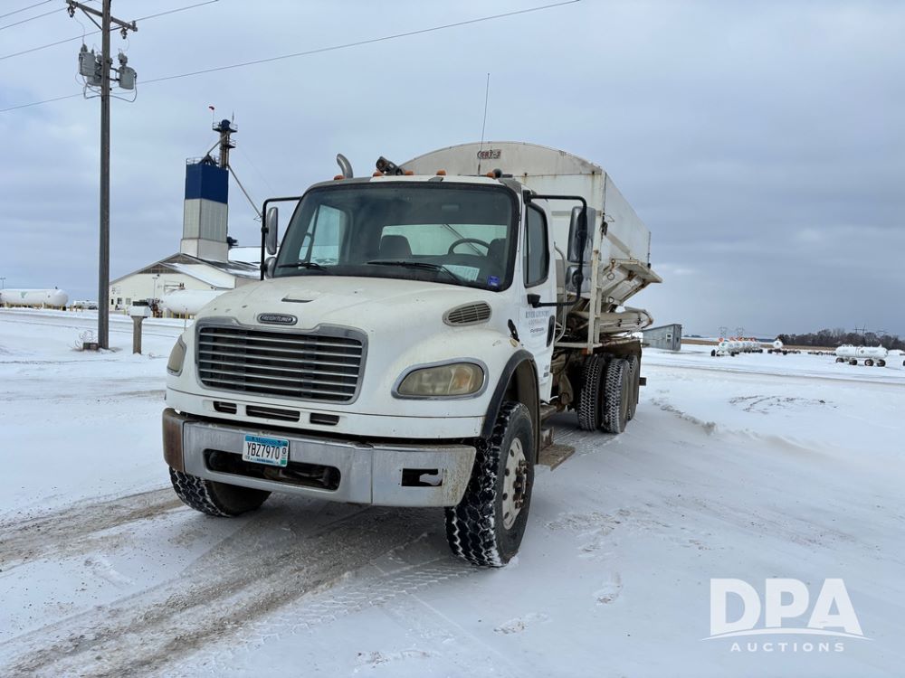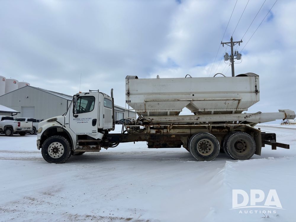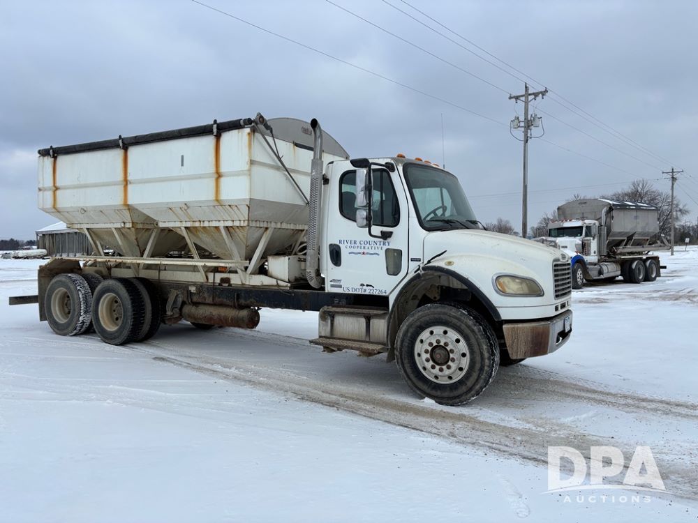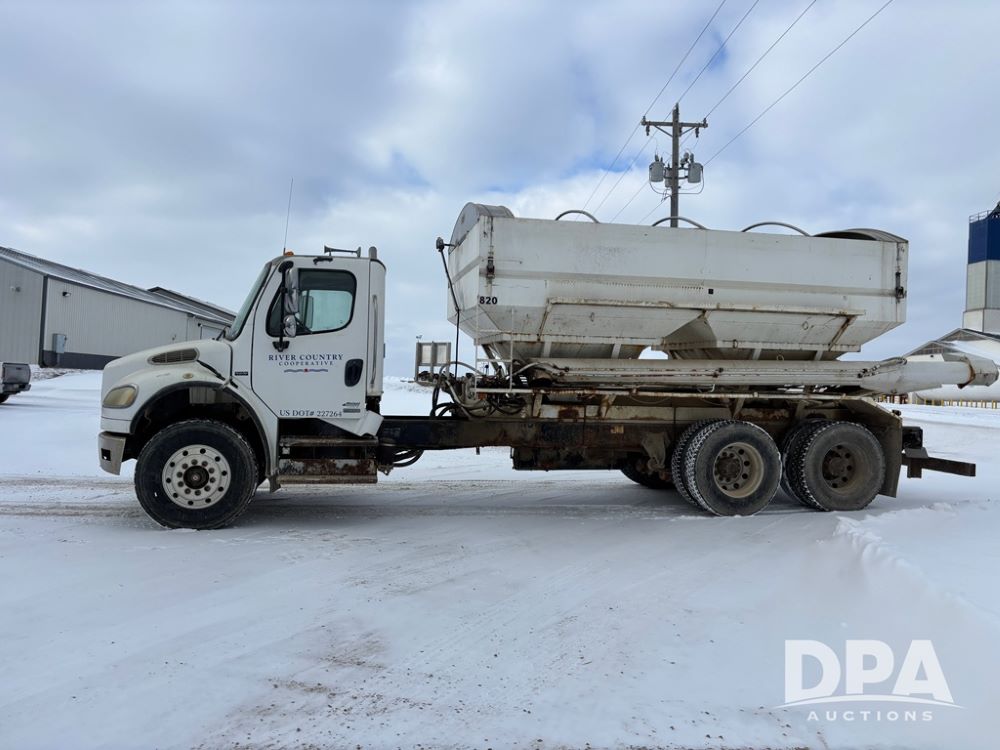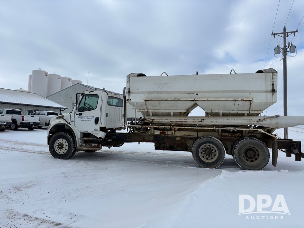 2006 Freightliner Dry Truck (DR12807 Unit 820), Mercedes diesel engine, Allison automatic transmission, tandem axle full screw, air ride suspension, 26,000LB front axle, w/power slave, 2 compartment hydraulic stainless steel dry tender box, side discharge auger, electric roll tarp, engine brake, 22.5 tires, all aluminum wheels.