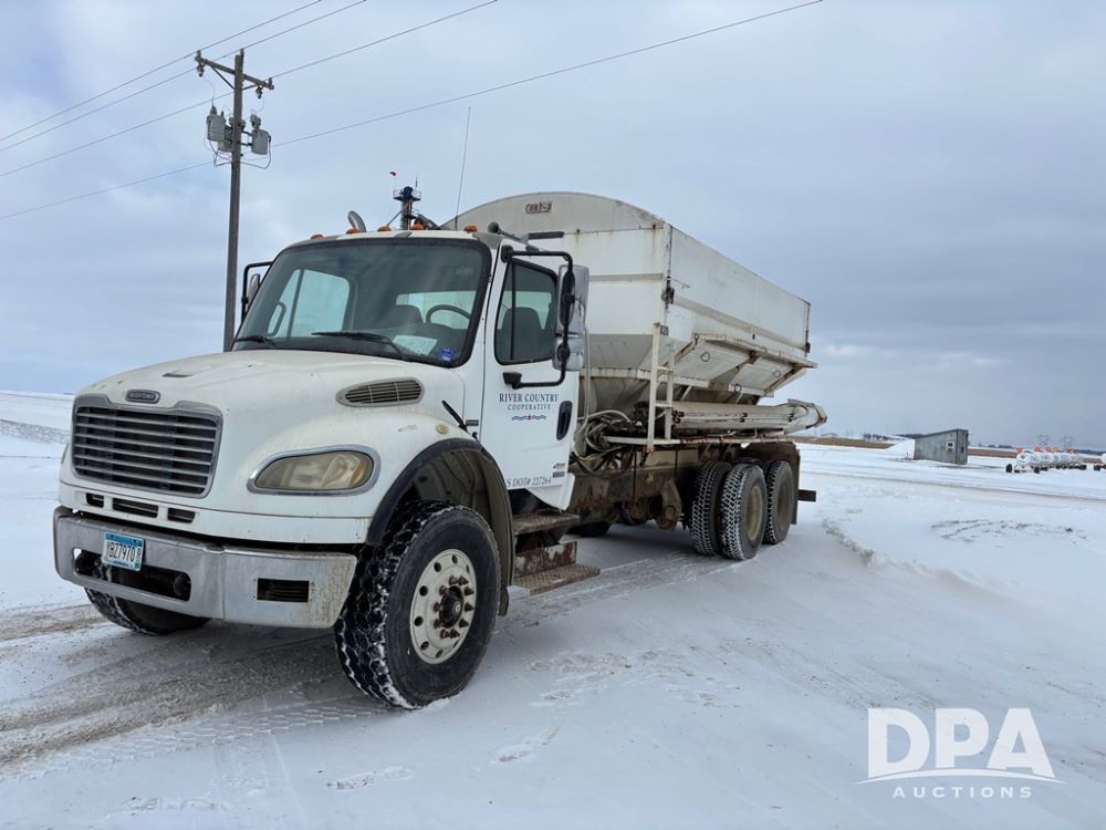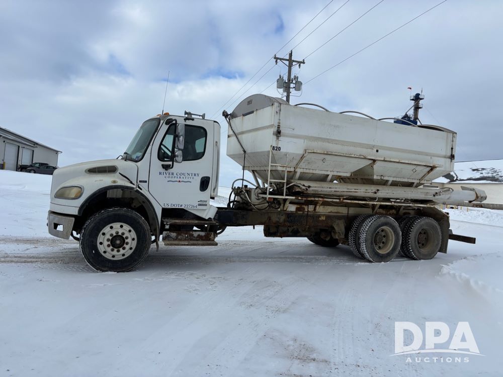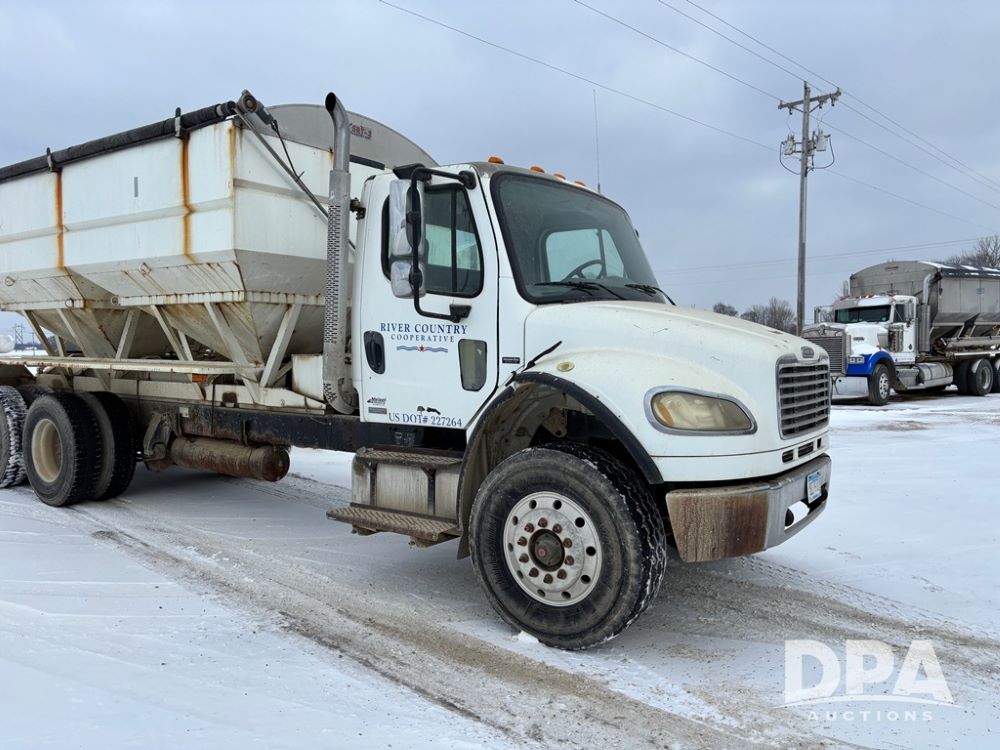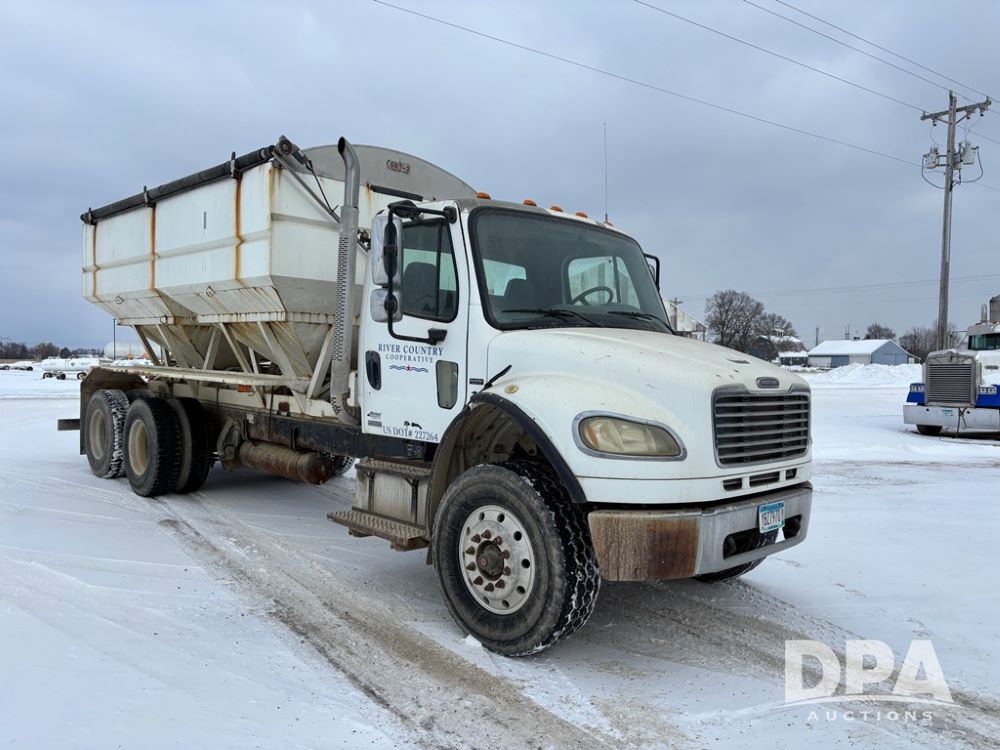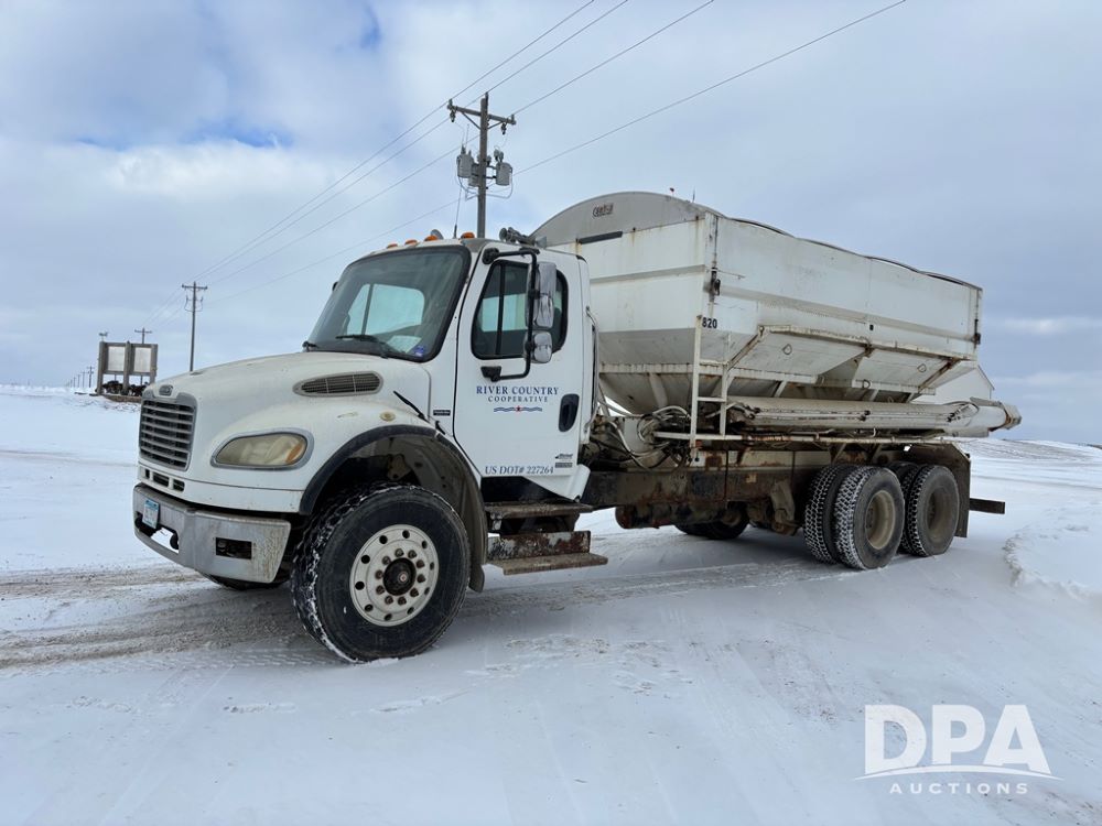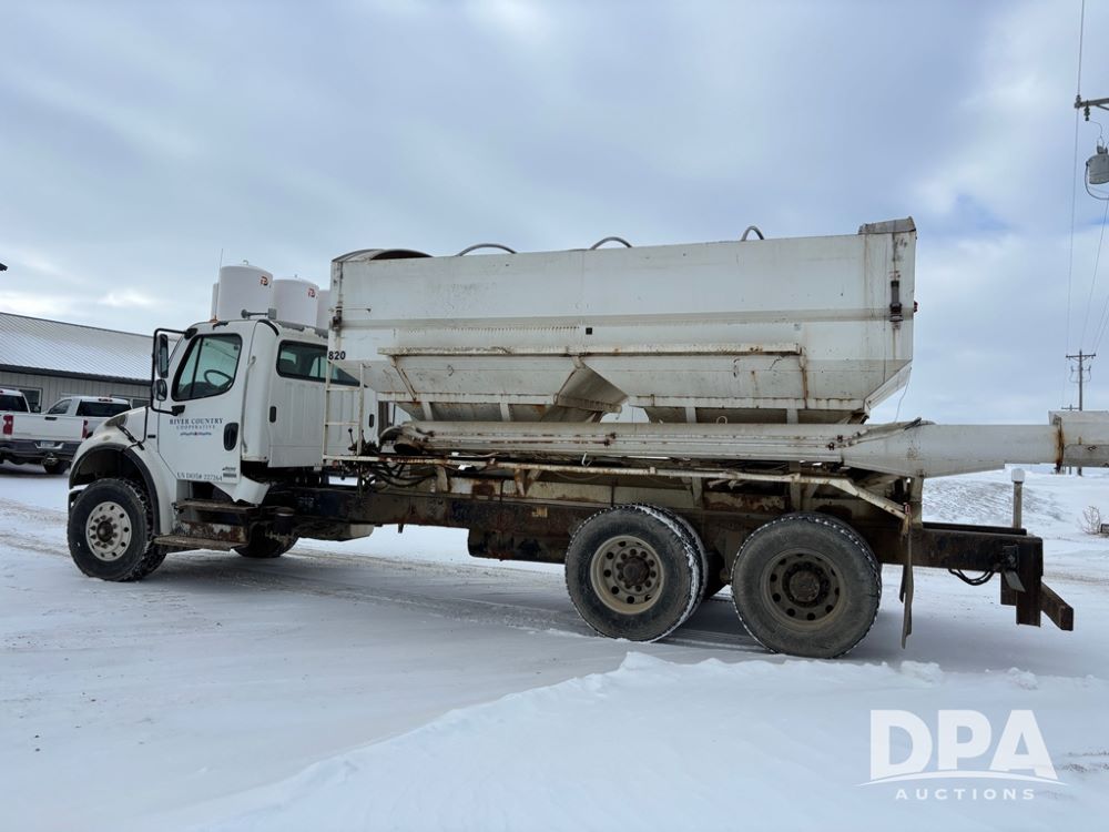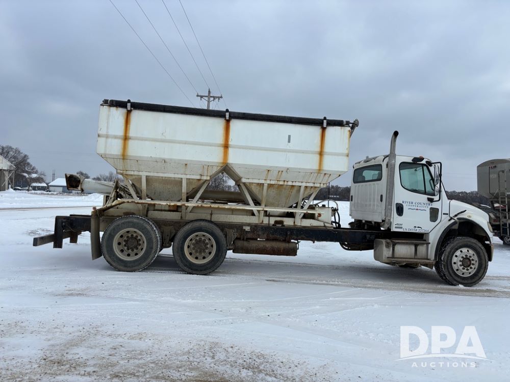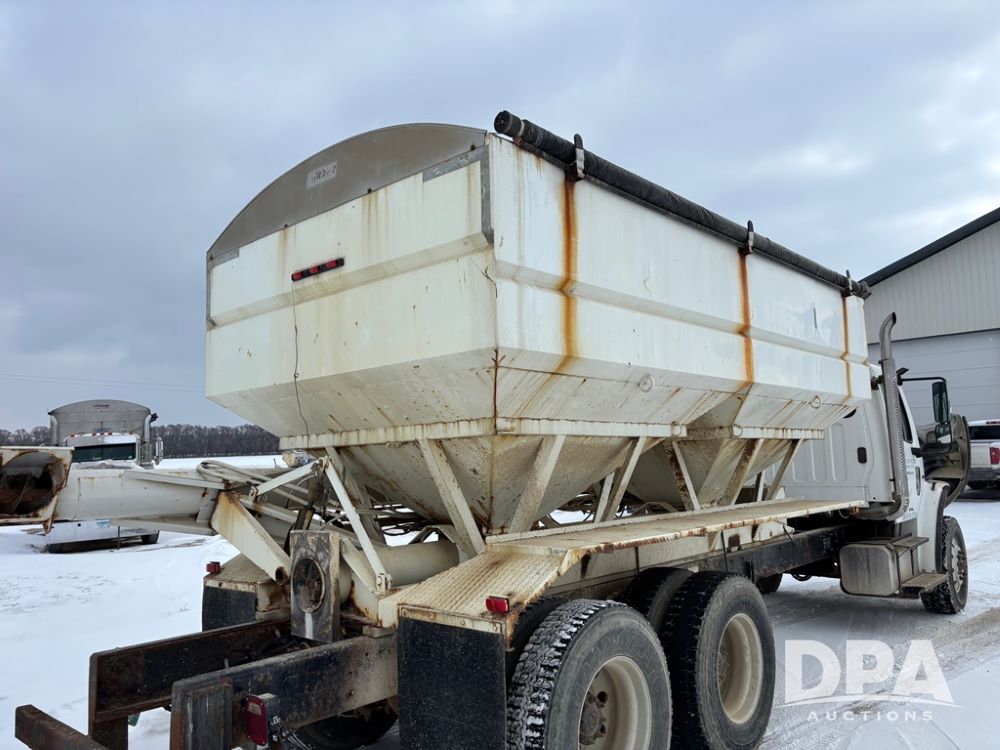 2006 Freightliner Dry Truck (DR12807 Unit 820), Mercedes diesel engine, Allison automatic transmission, tandem axle full screw, air ride suspension, 26,000LB front axle, w/power slave, 2 compartment hydraulic stainless steel dry tender box, side discharge auger, electric roll tarp, engine brake, 22.5 tires, all aluminum wheels.