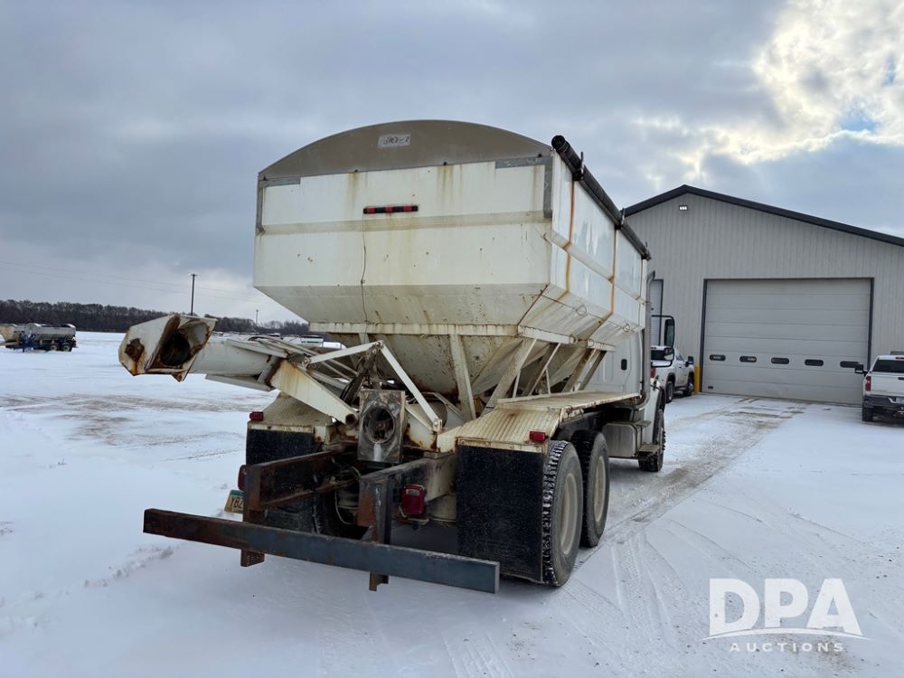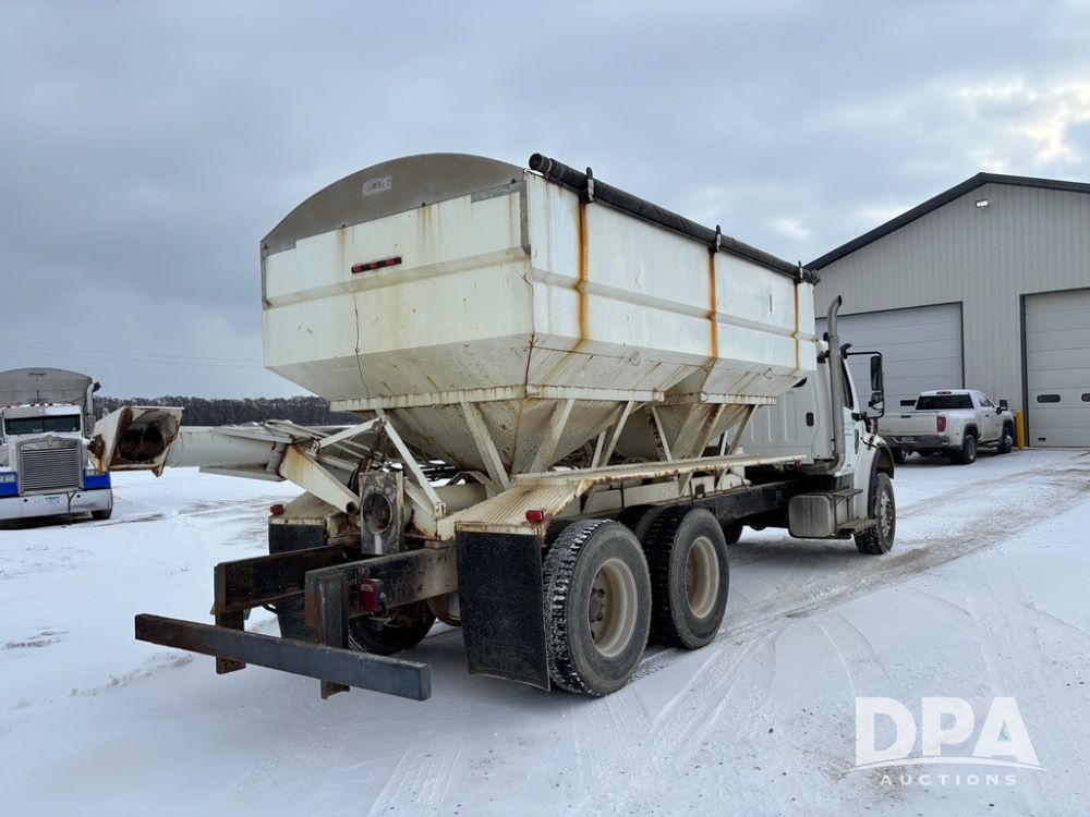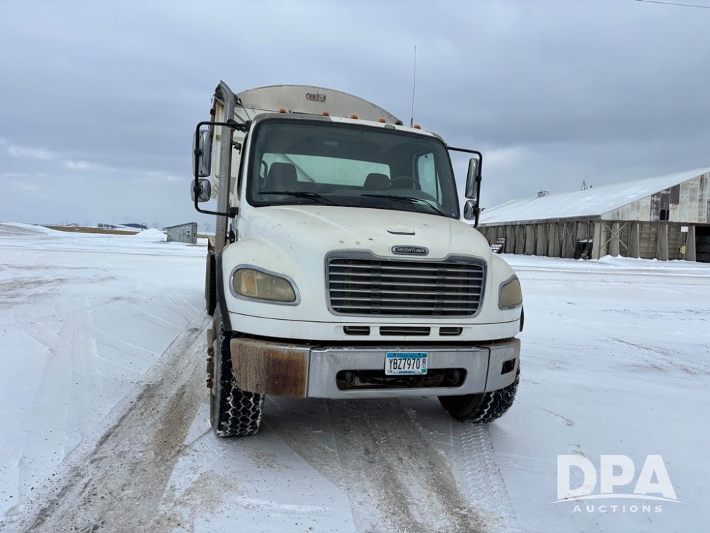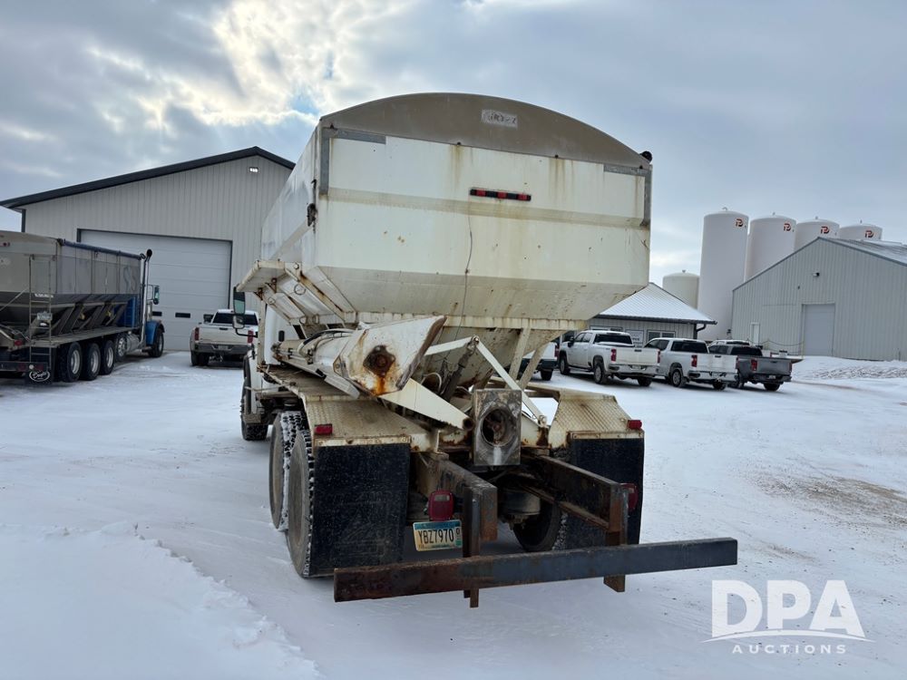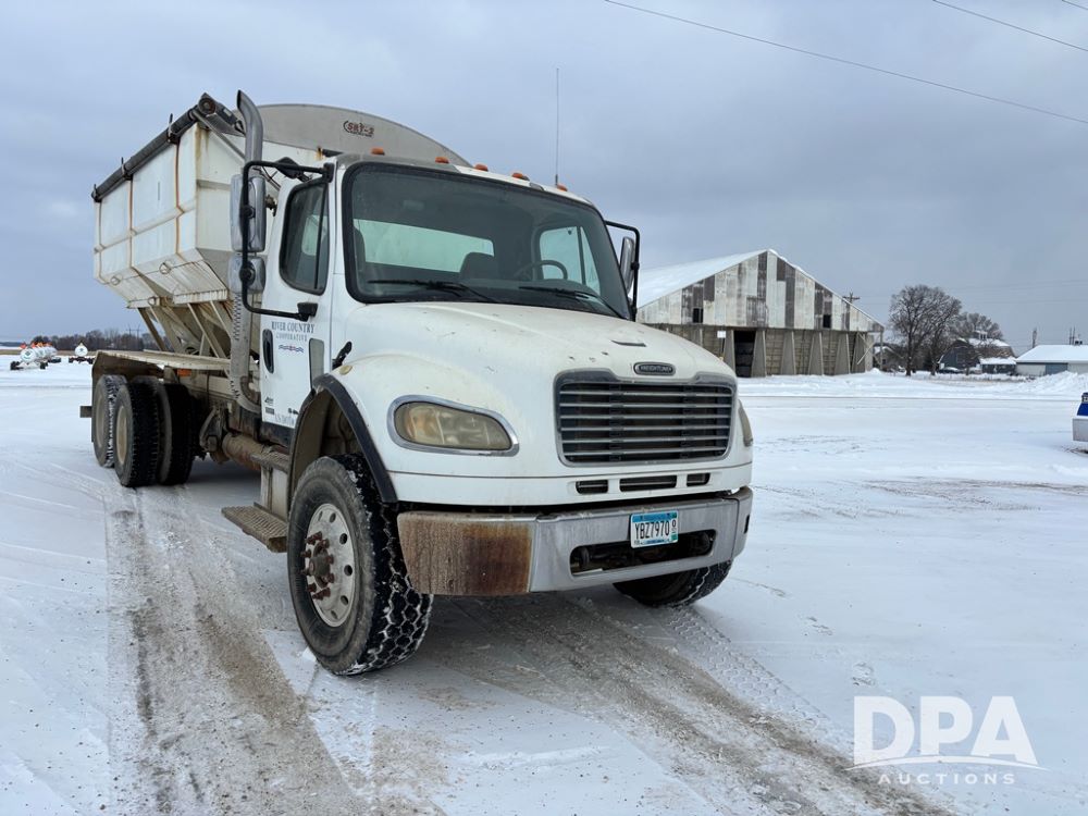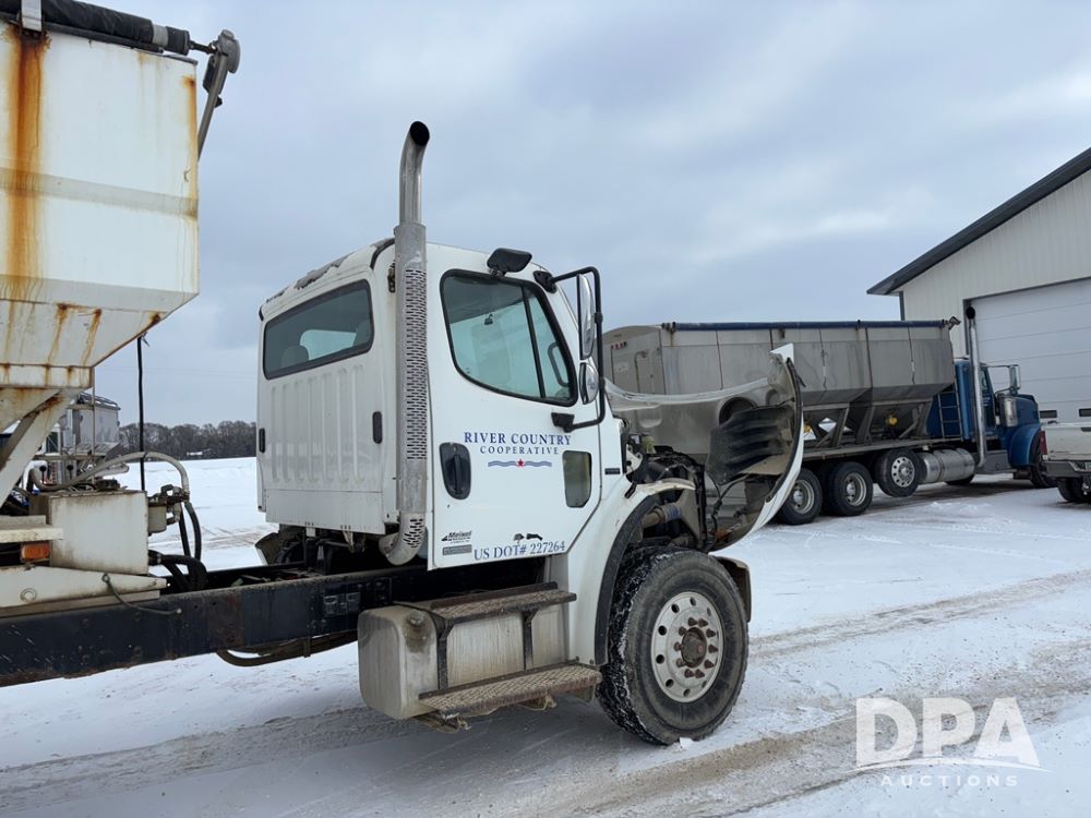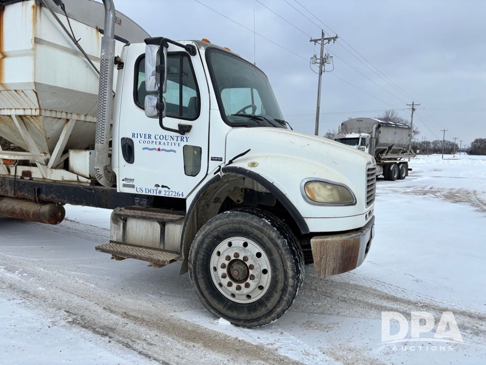 2006 Freightliner Dry Truck (DR12807 Unit 820), Mercedes diesel engine, Allison automatic transmission, tandem axle full screw, air ride suspension, 26,000LB front axle, w/power slave, 2 compartment hydraulic stainless steel dry tender box, side discharge auger, electric roll tarp, engine brake, 22.5 tires, all aluminum wheels.