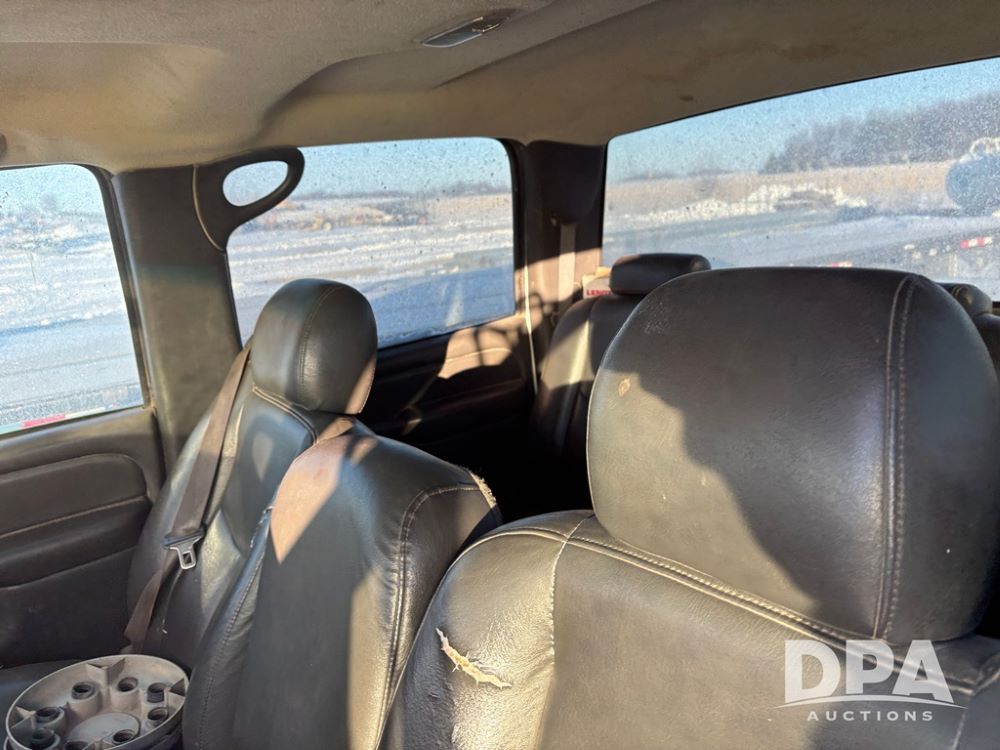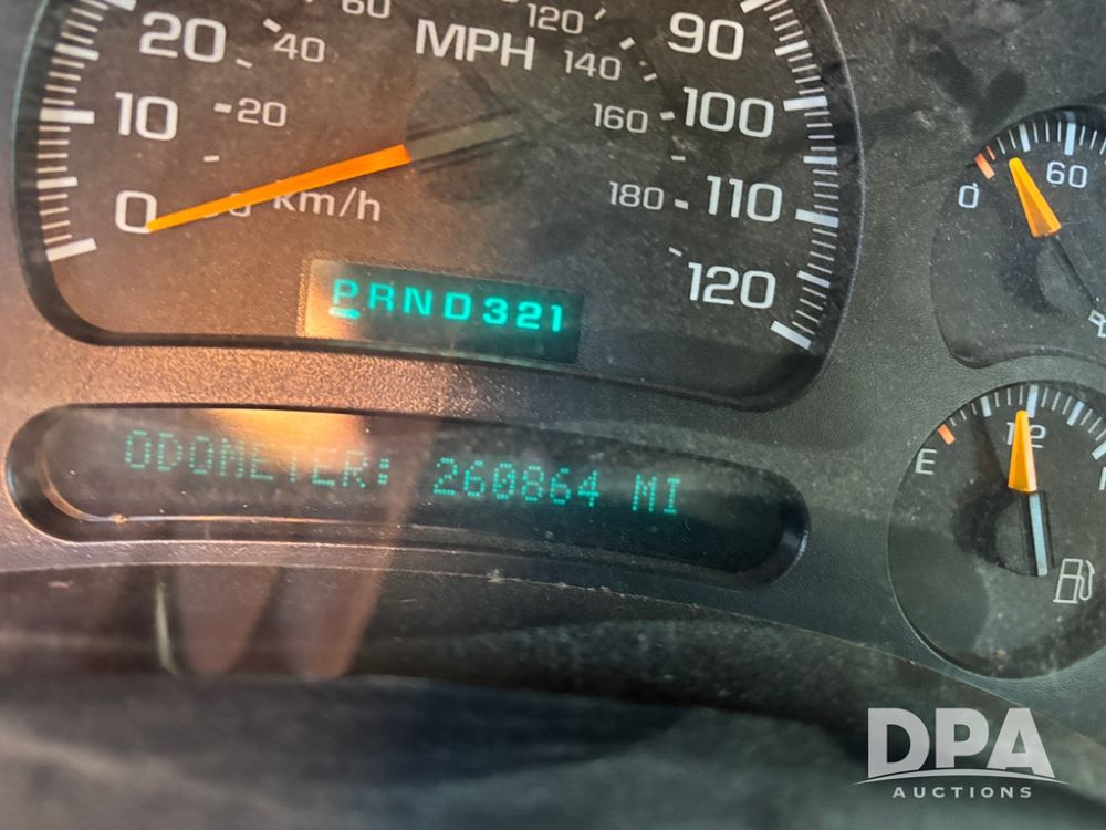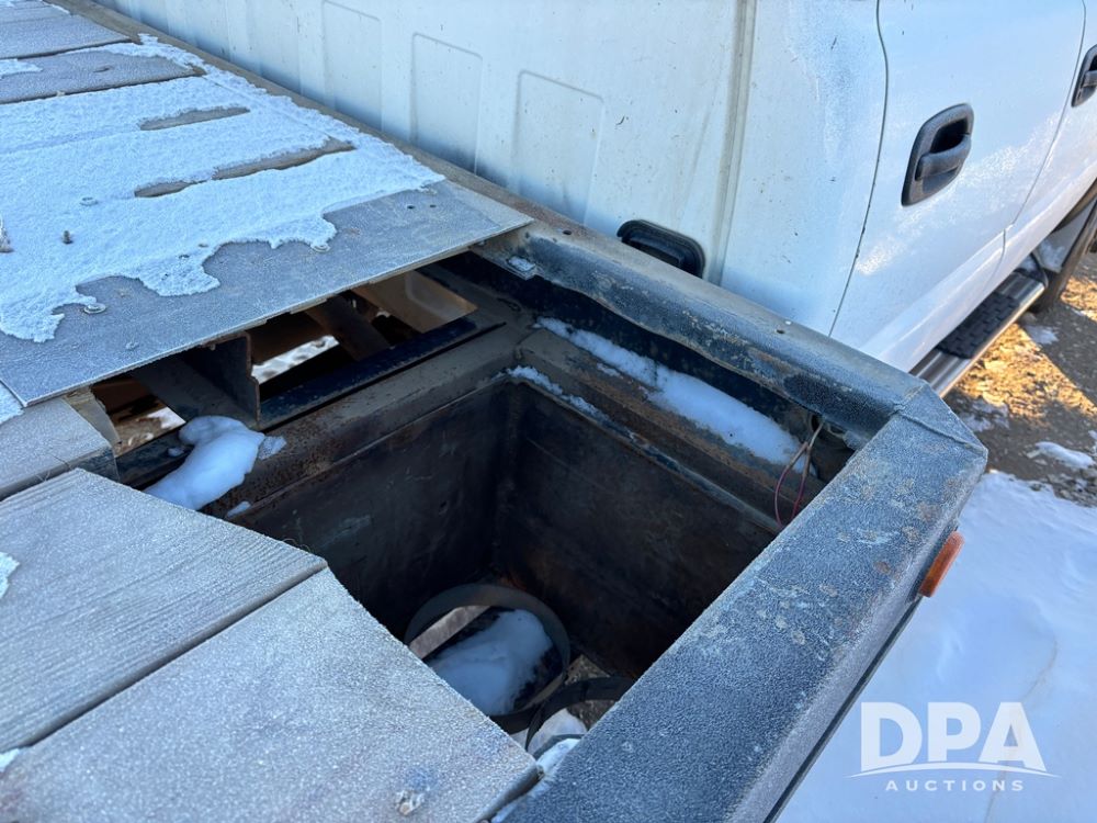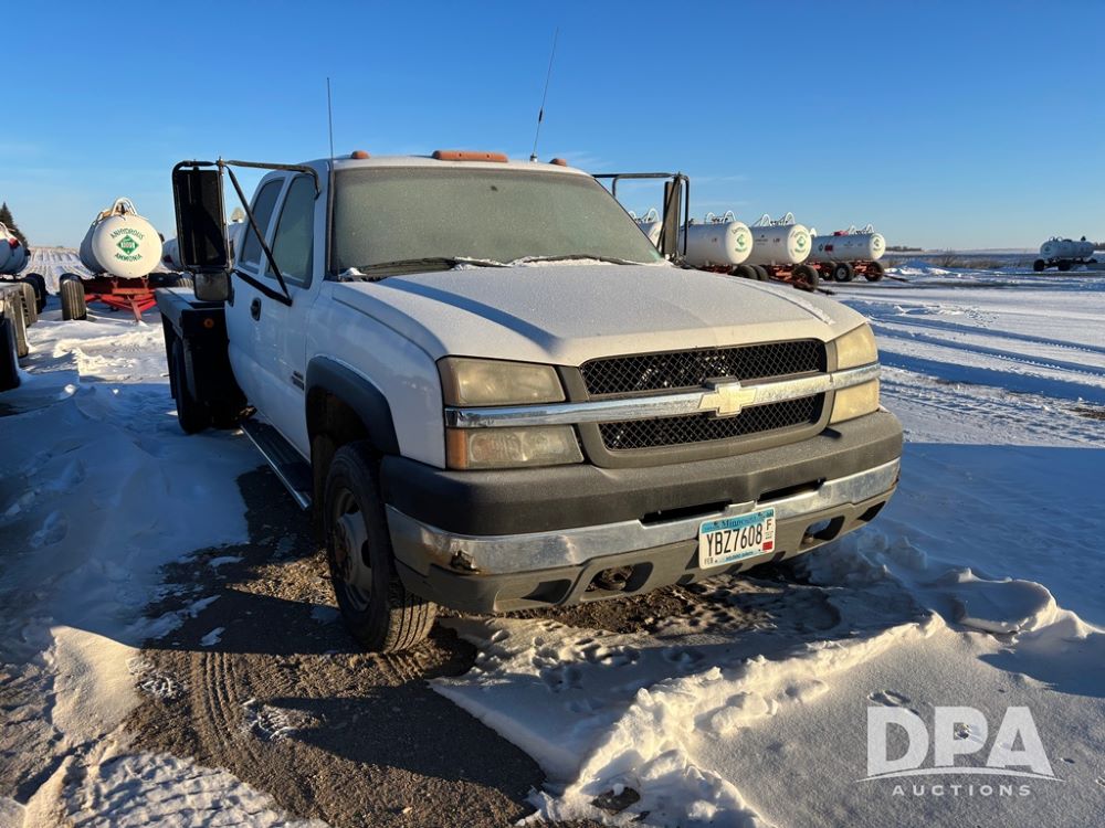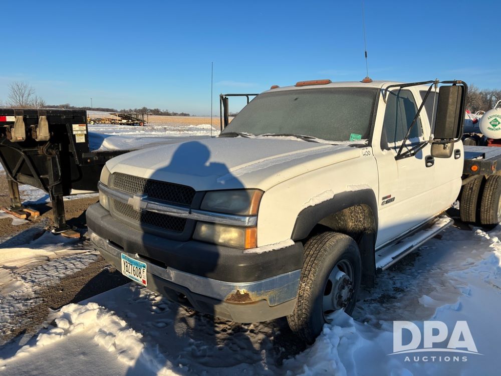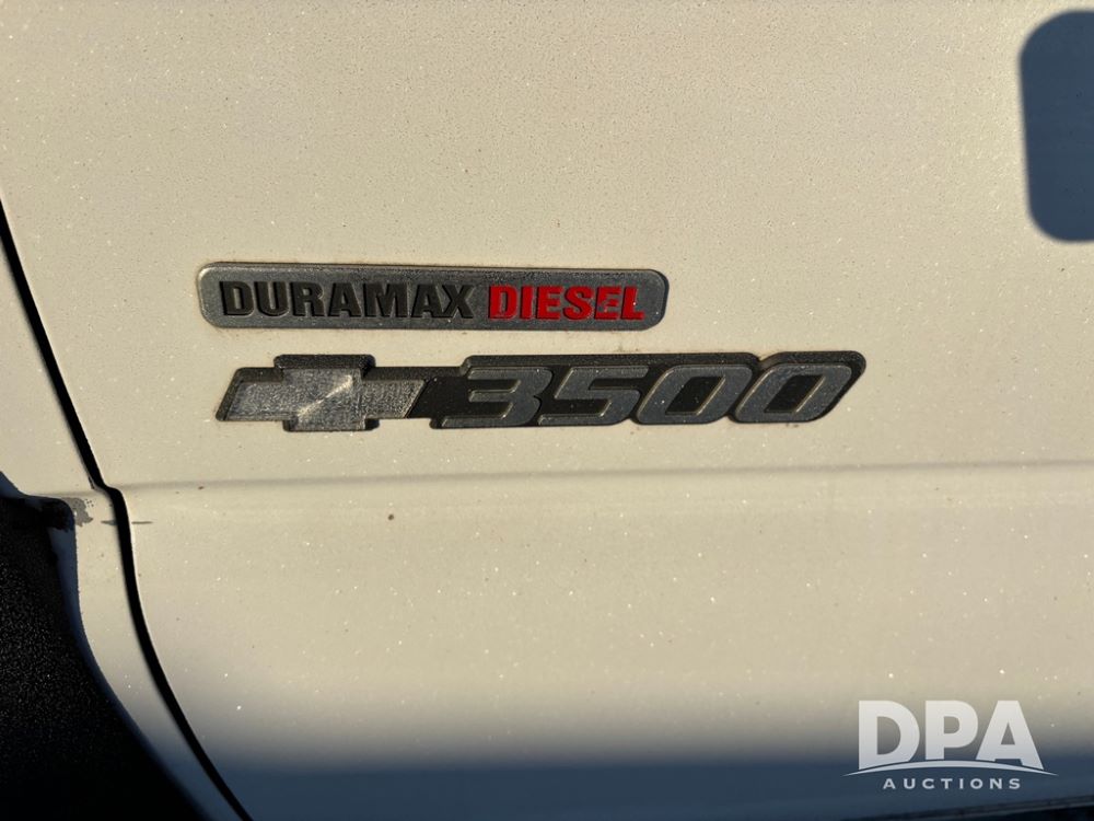 2003 Chevy 3500 Flatbed Truck (DR12821 Unit 400), Duramax diesel engine, automatic transmission, 4X4, 8' wood deck flatbed, rear ag bumper, 215/85R16 tires, odometer reads 260,864 miles.