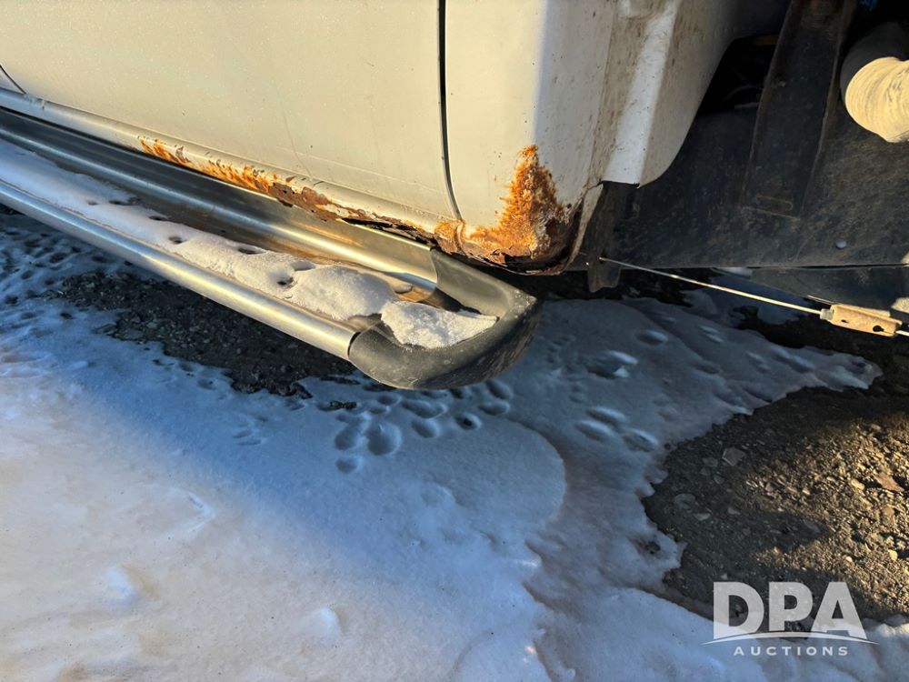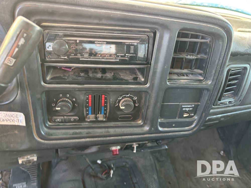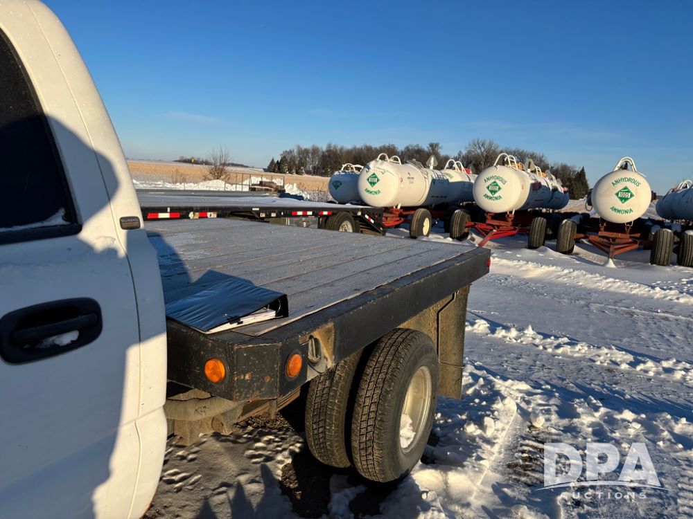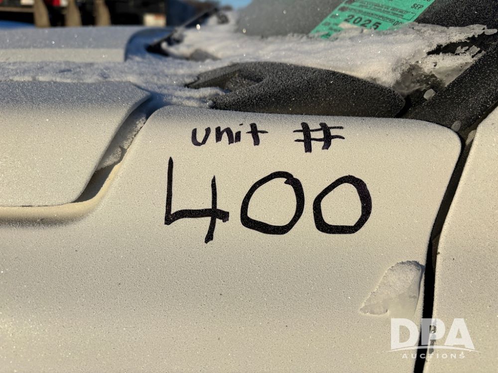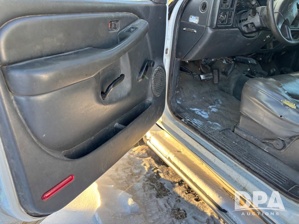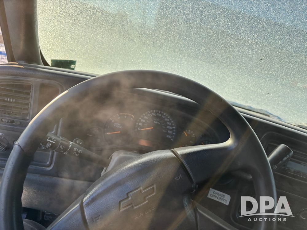 2003 Chevy 3500 Flatbed Truck (DR12821 Unit 400), Duramax diesel engine, automatic transmission, 4X4, 8' wood deck flatbed, rear ag bumper, 215/85R16 tires, odometer reads 260,864 miles.