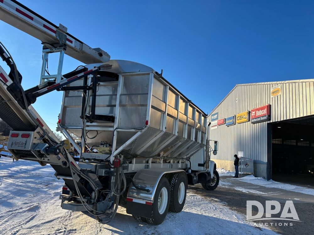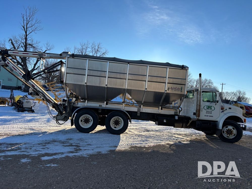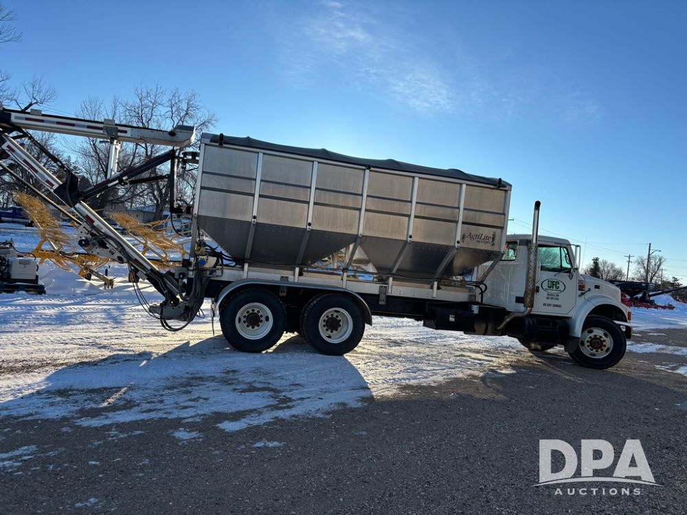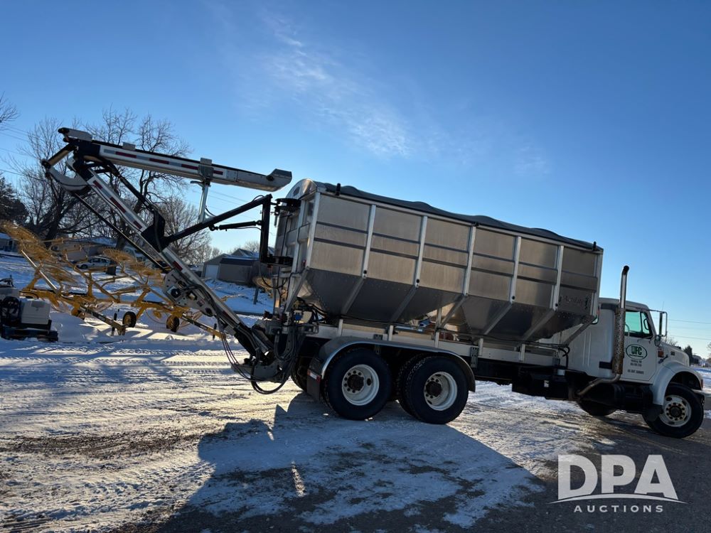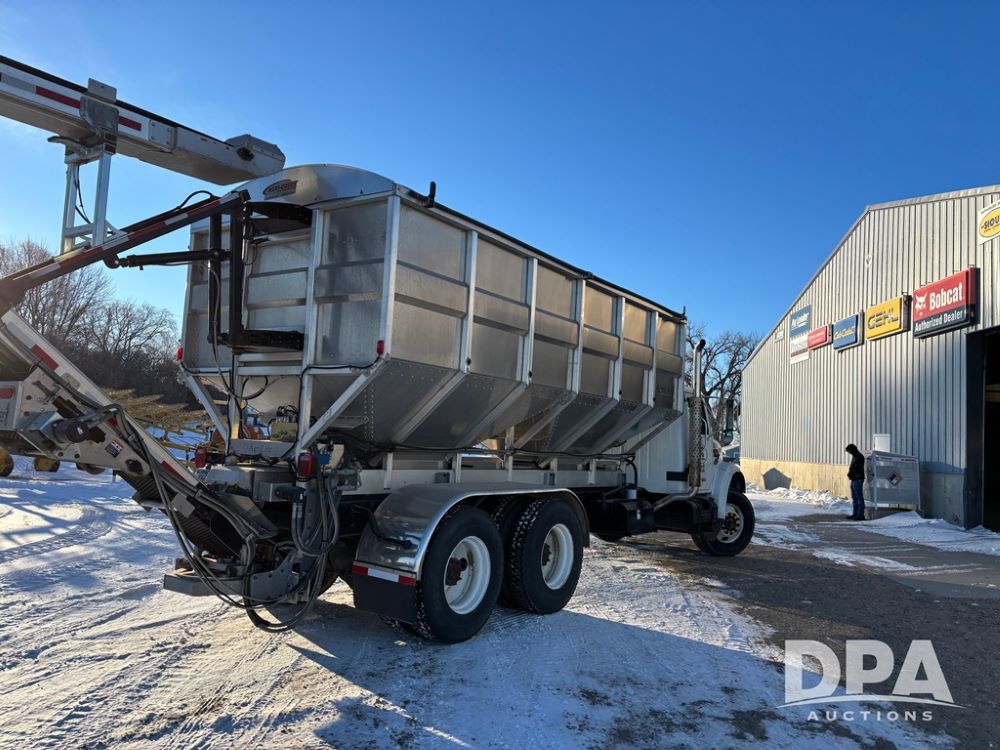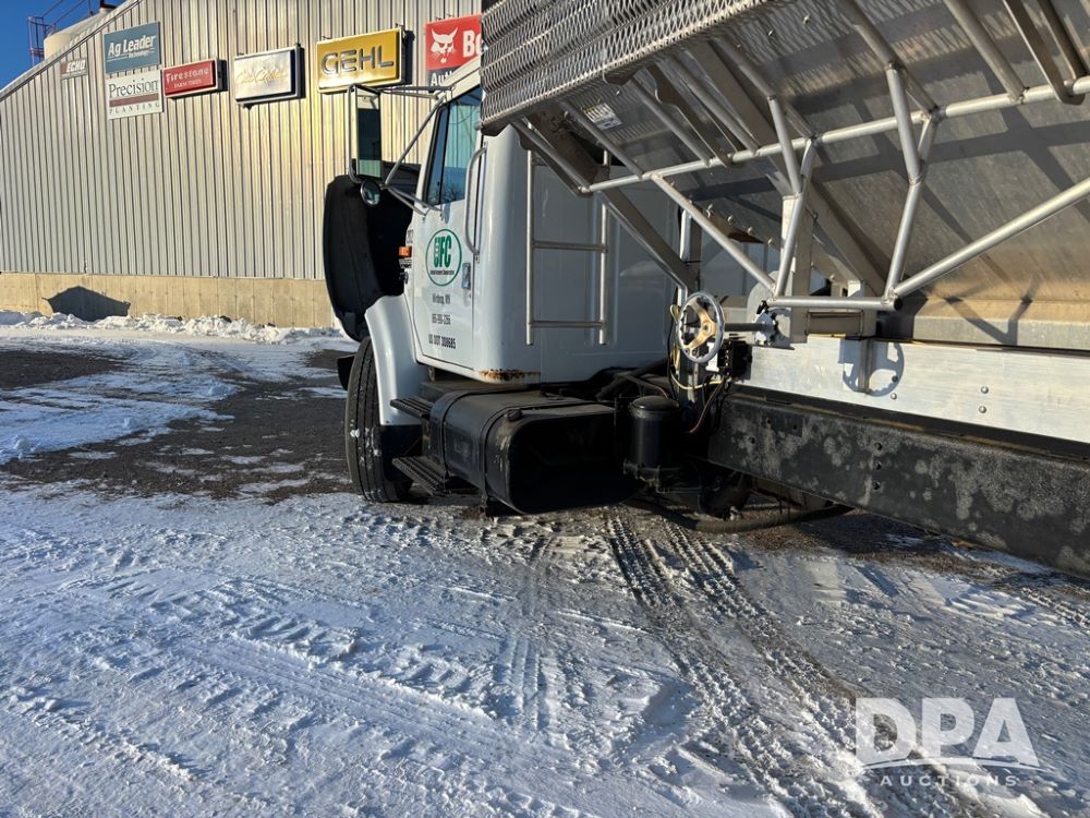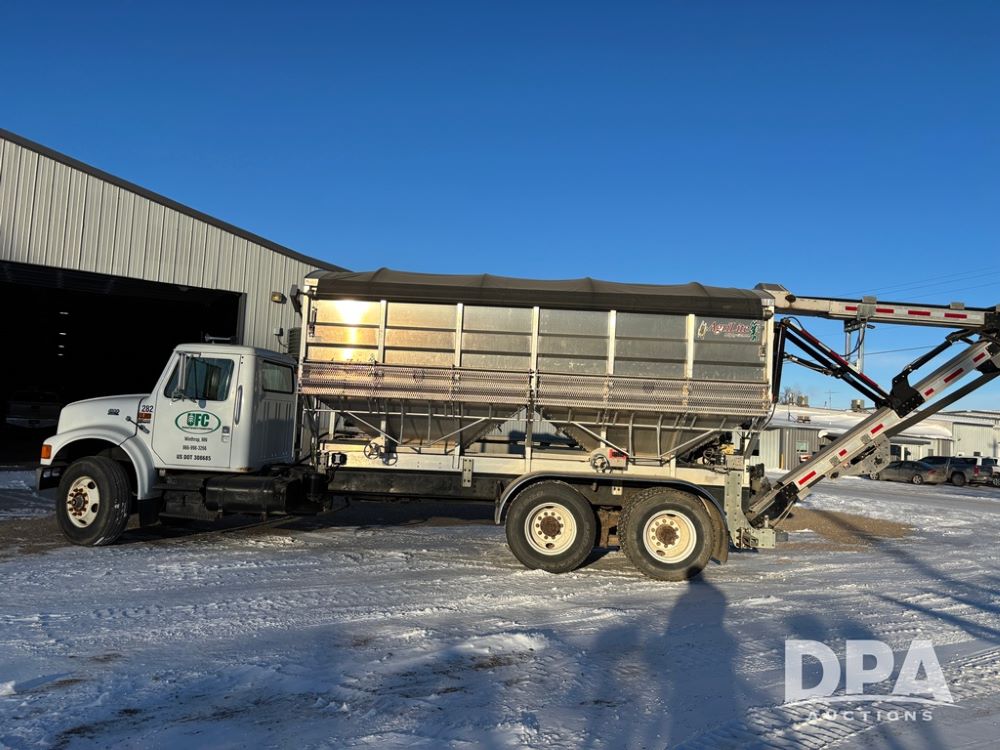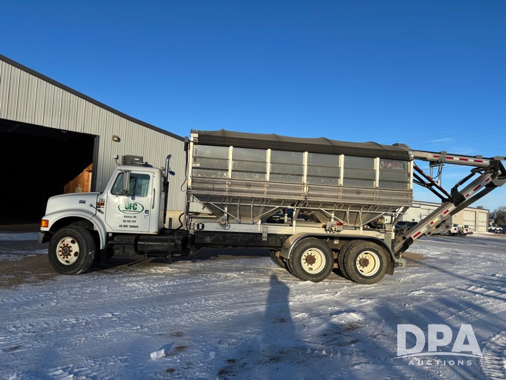 1999 International 4900 (DR12823 Unit 282), DT530 diesel engine, 10 speed transmission, tandem axle full screw, heavy front axle w/dual power steering, Agri Lite stainless steel 2 compartment hydraulic box, rear discharge folding conveyor, full 180 degree swing, hand held remote, electric roll tarp, stainless steel full fenders, 22.5 drive tires are near new.