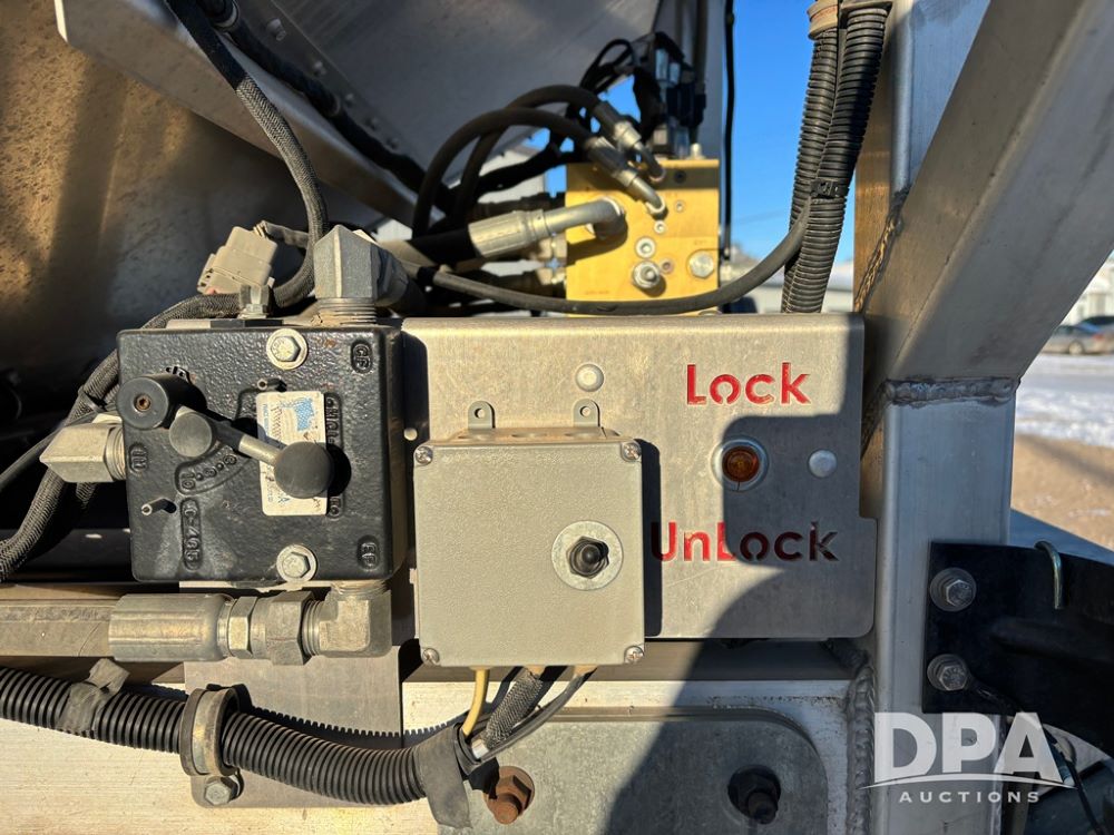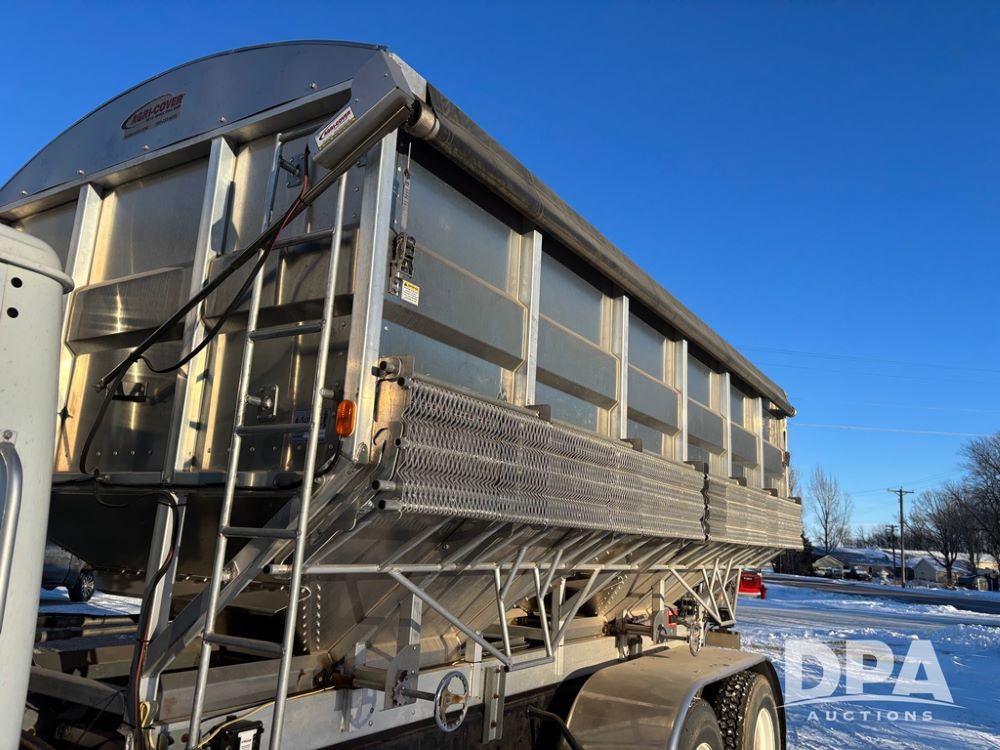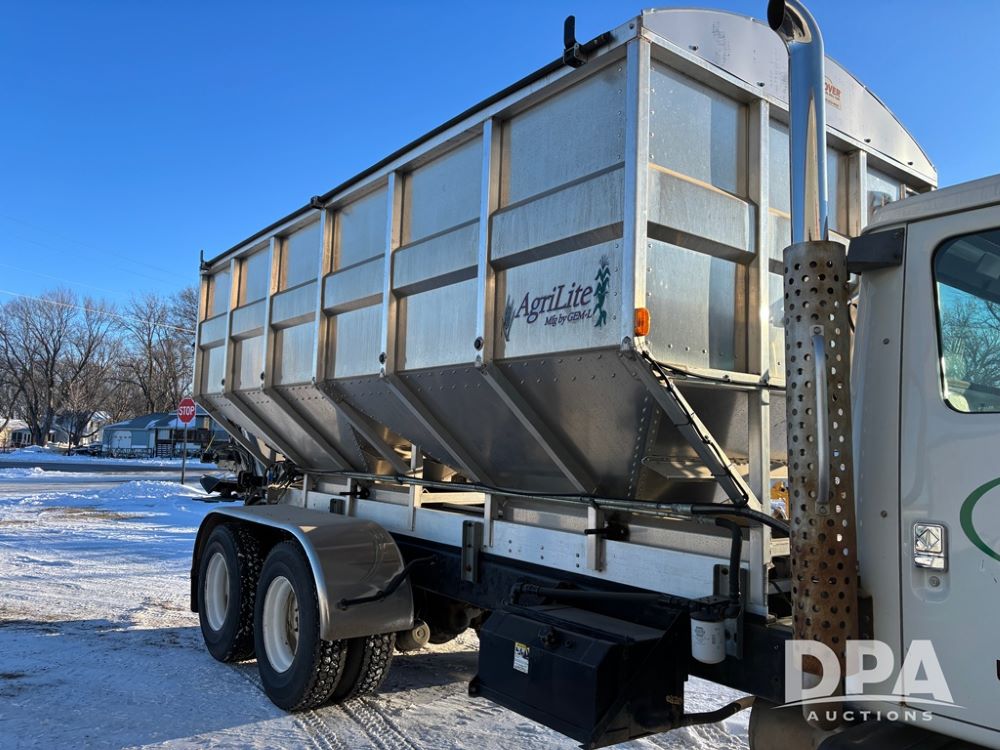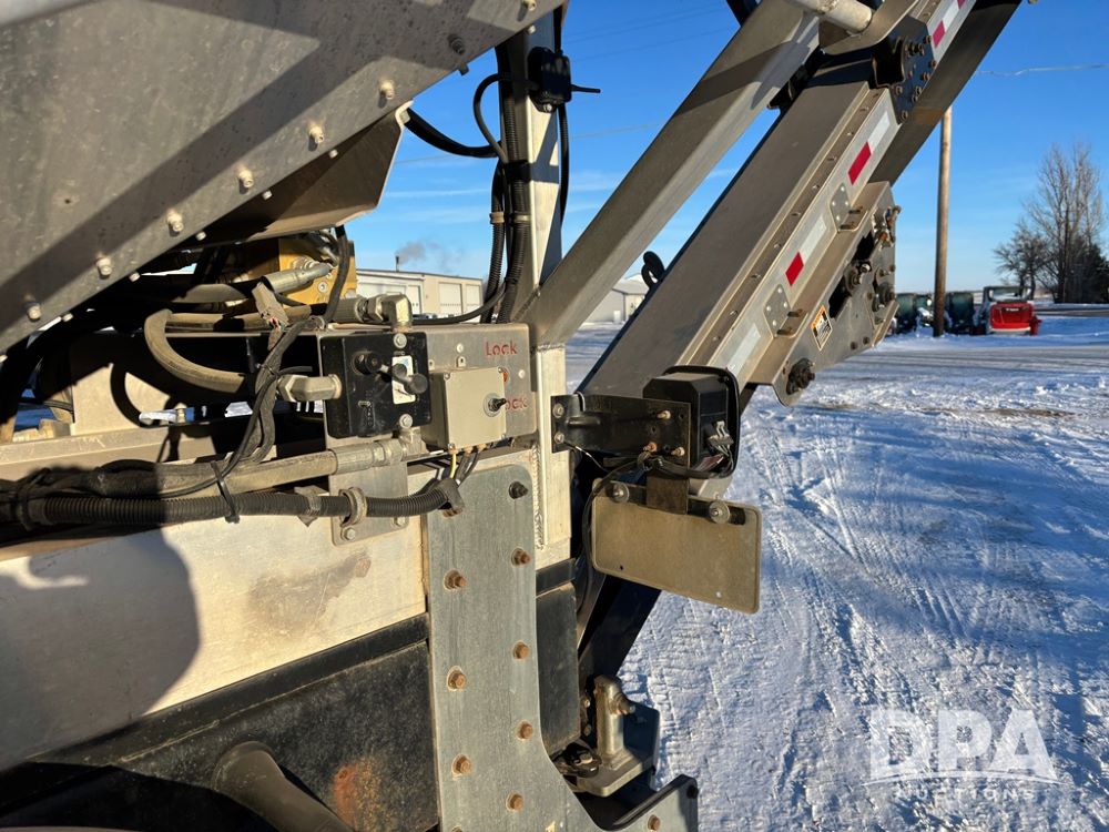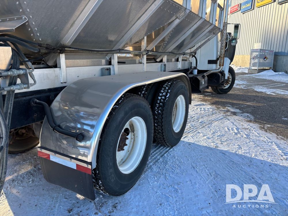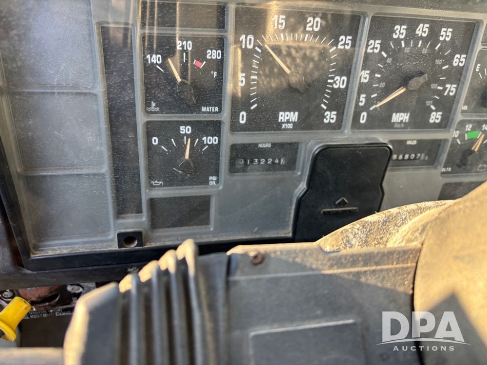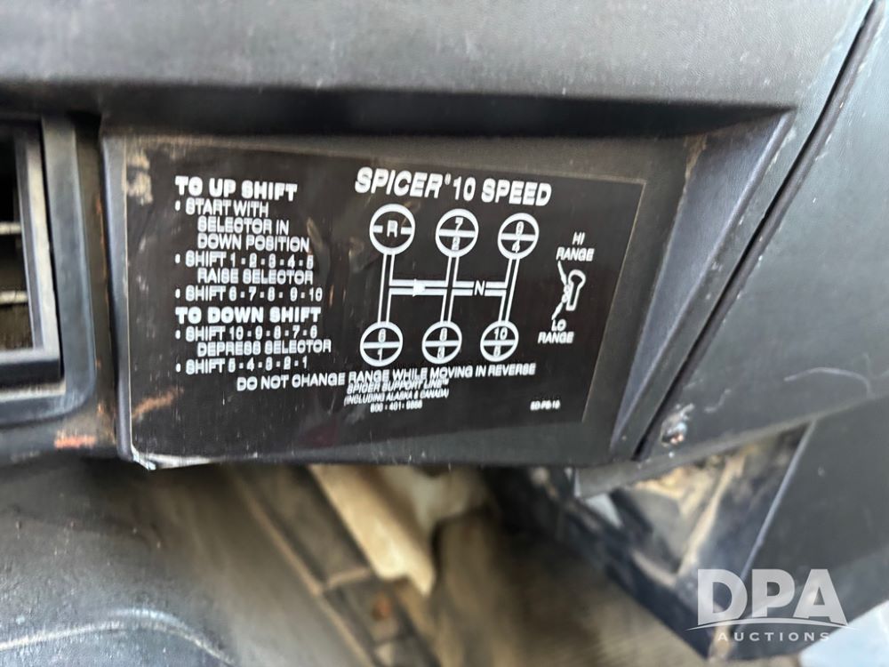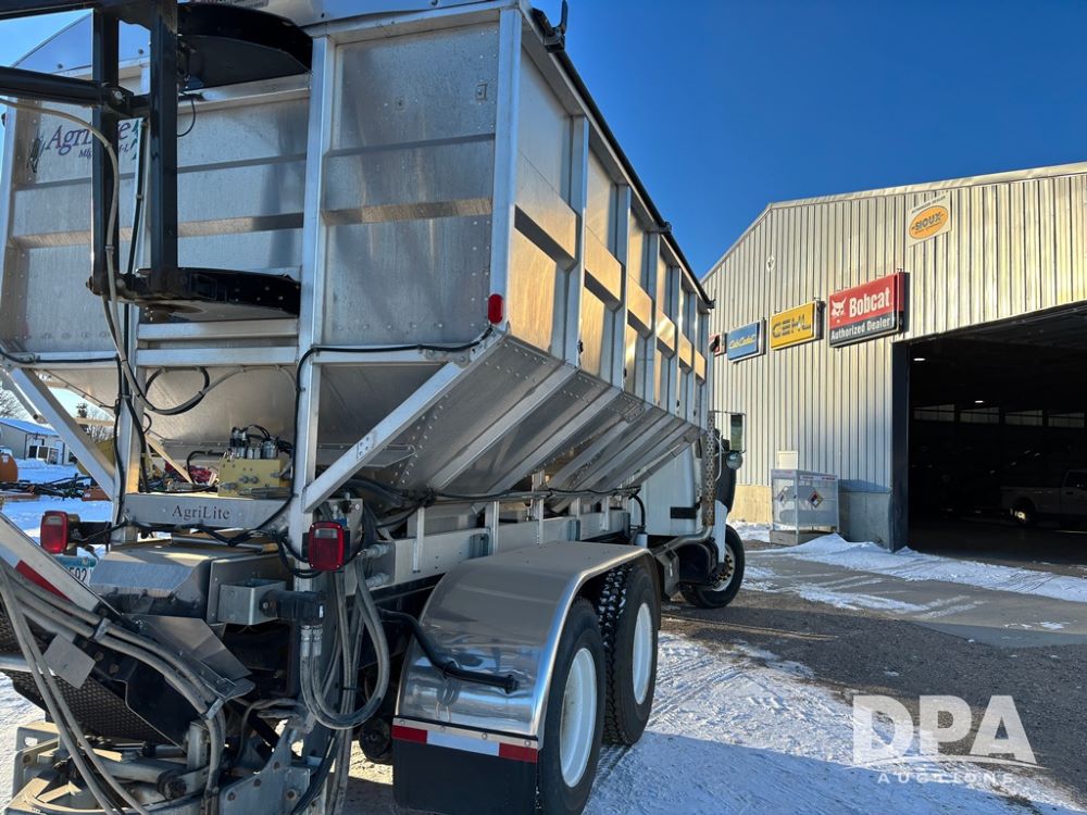 1999 International 4900 (DR12823 Unit 282), DT530 diesel engine, 10 speed transmission, tandem axle full screw, heavy front axle w/dual power steering, Agri Lite stainless steel 2 compartment hydraulic box, rear discharge folding conveyor, full 180 degree swing, hand held remote, electric roll tarp, stainless steel full fenders, 22.5 drive tires are near new.