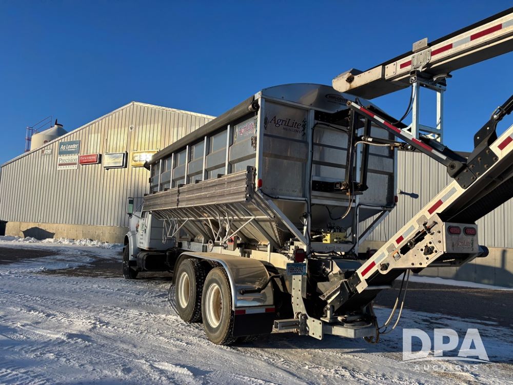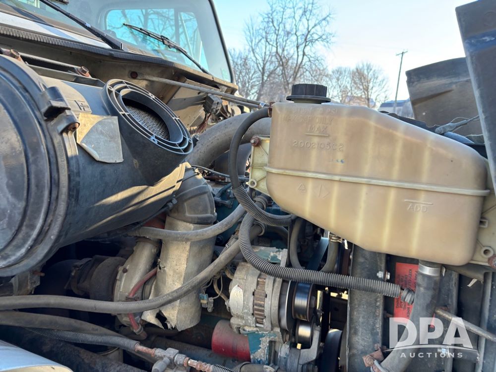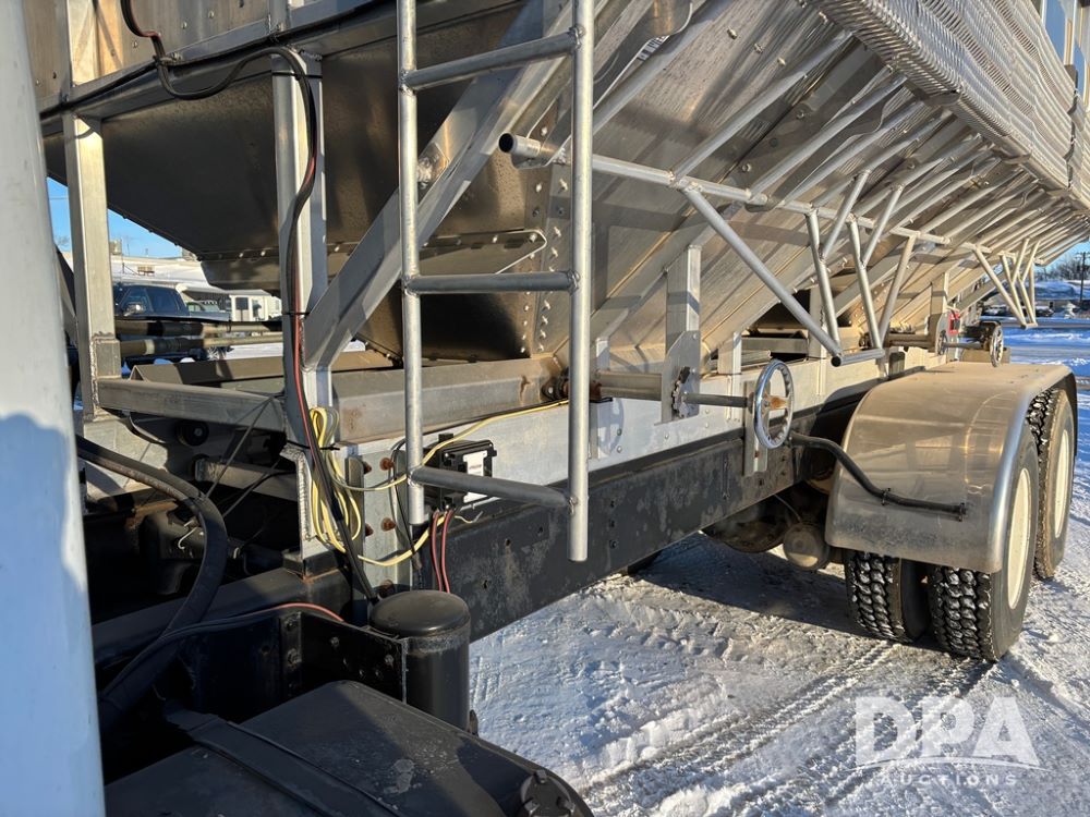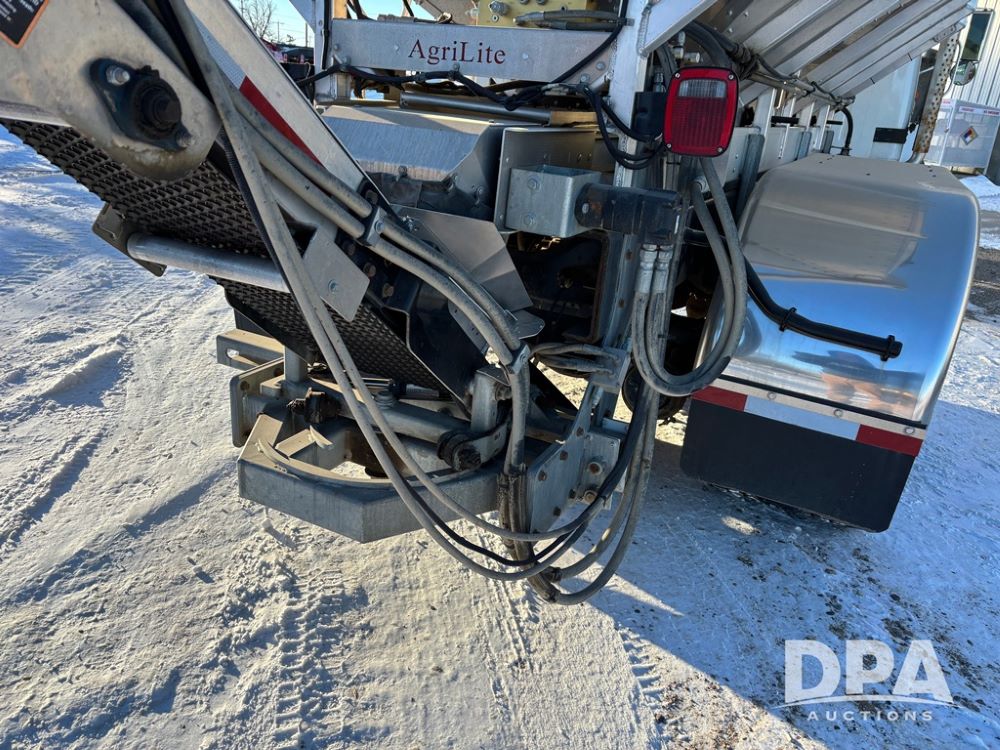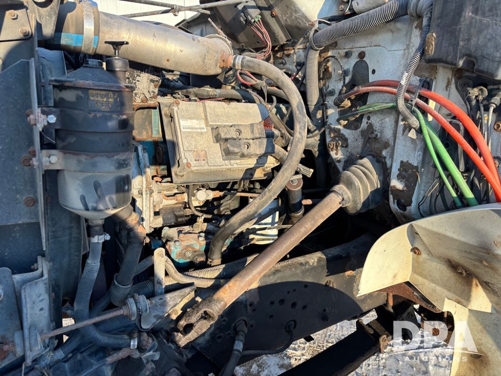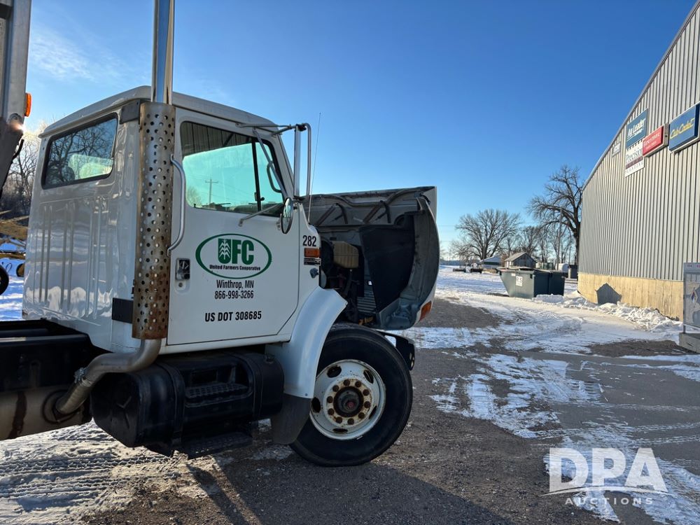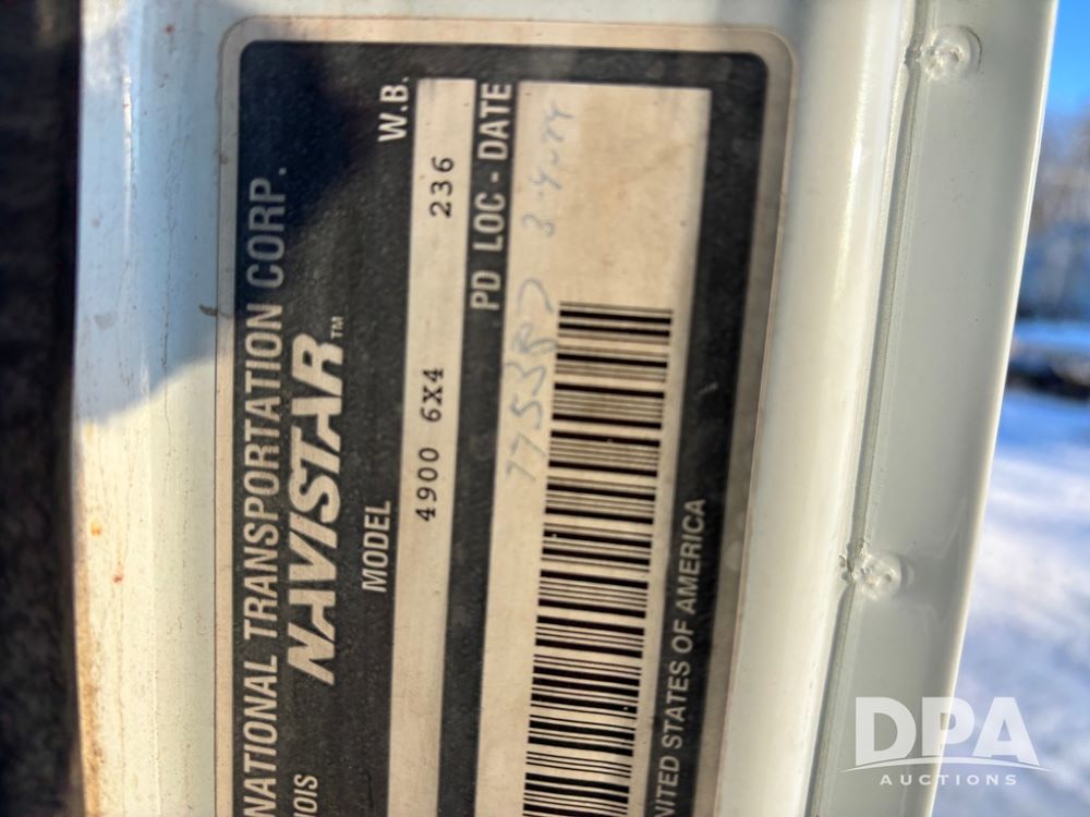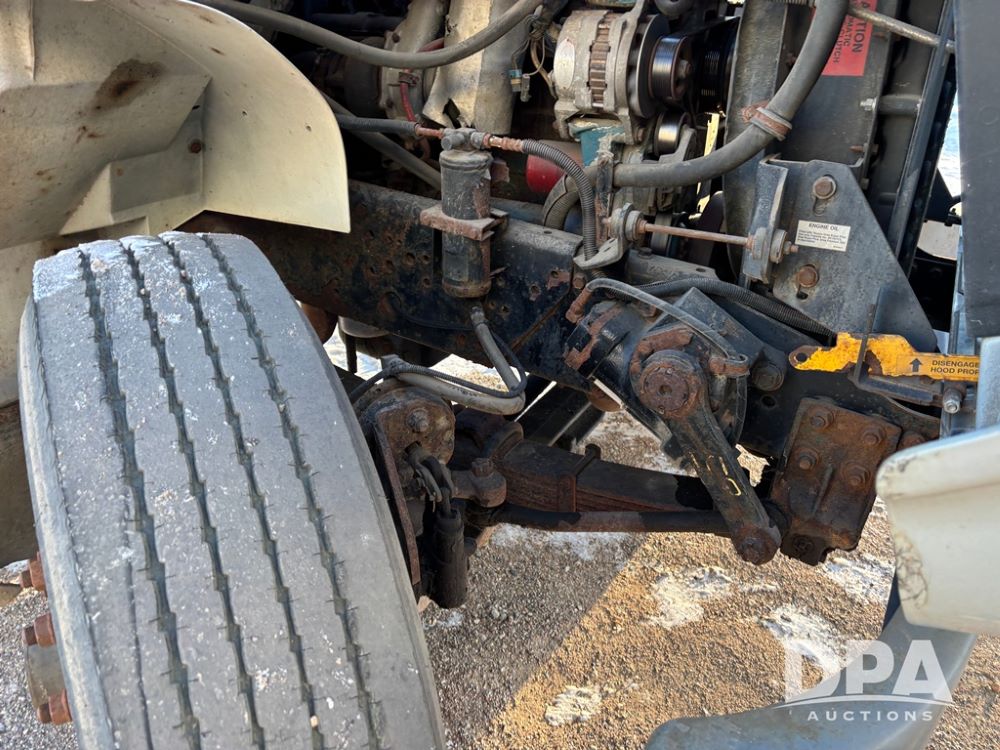 1999 International 4900 (DR12823 Unit 282), DT530 diesel engine, 10 speed transmission, tandem axle full screw, heavy front axle w/dual power steering, Agri Lite stainless steel 2 compartment hydraulic box, rear discharge folding conveyor, full 180 degree swing, hand held remote, electric roll tarp, stainless steel full fenders, 22.5 drive tires are near new.