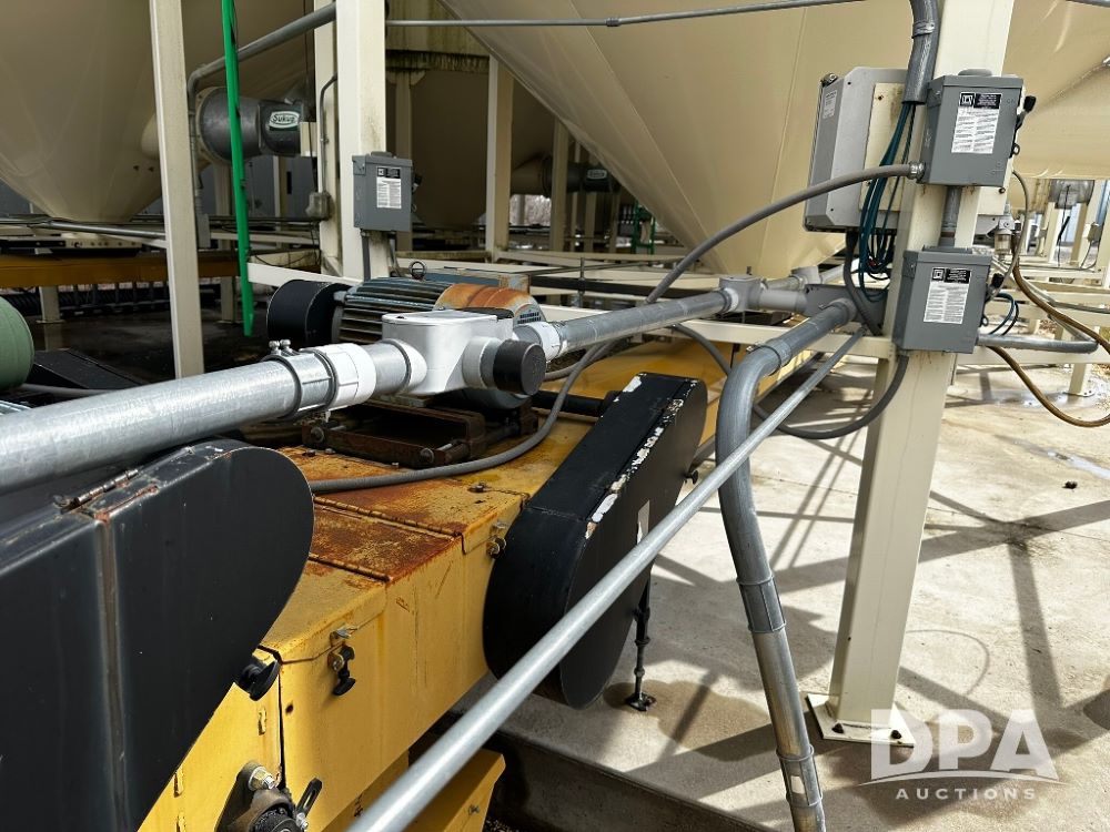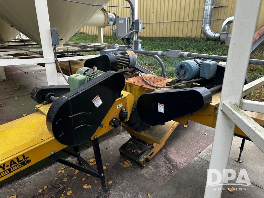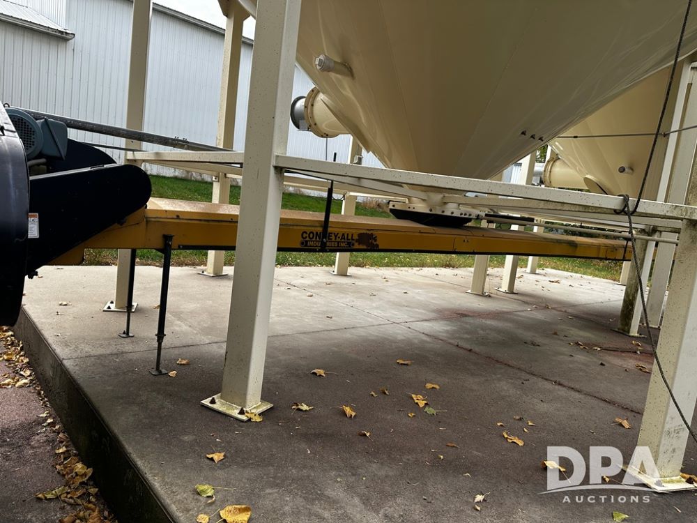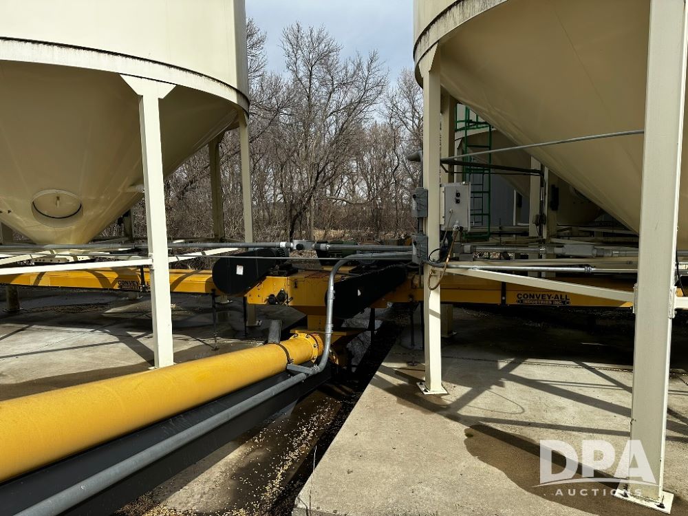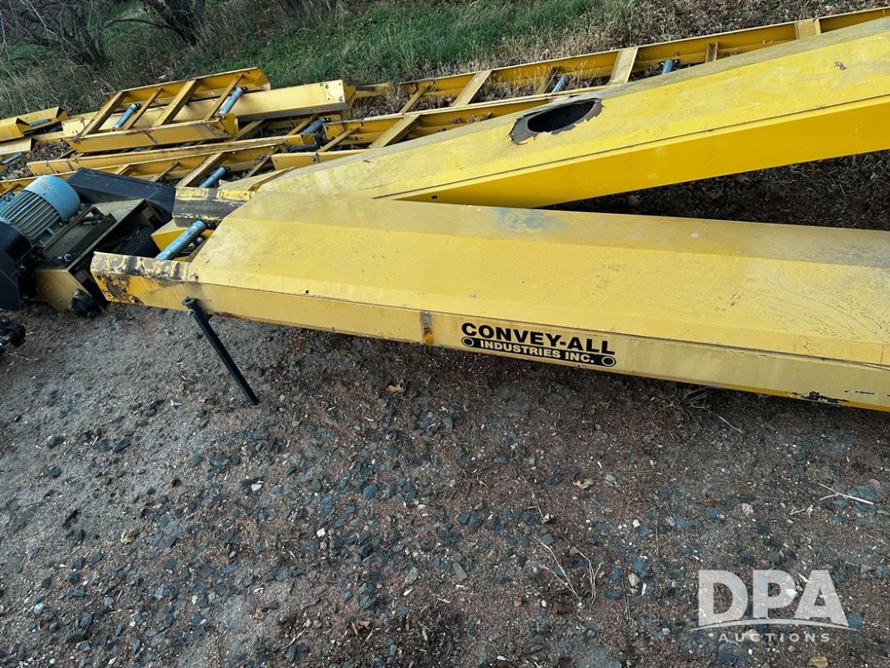 105' Convey-All Conveyor (NJP457), approx. 105', 18in wide belt, 2 drive ends with 10hp and 5hp single phase electric motors, center collection transition and two trail sections, brackets to hand under hopper bins, 6 transitions from meridian hopper bin gates, air cylinders and mounting to open bin gates and gate stops.