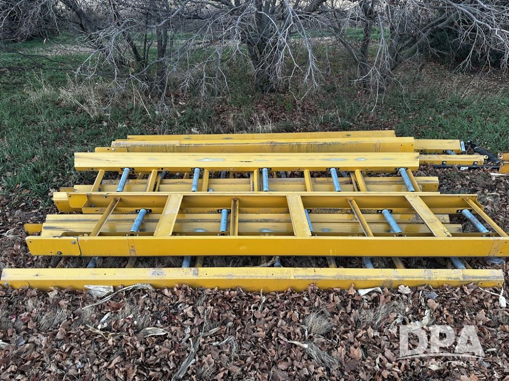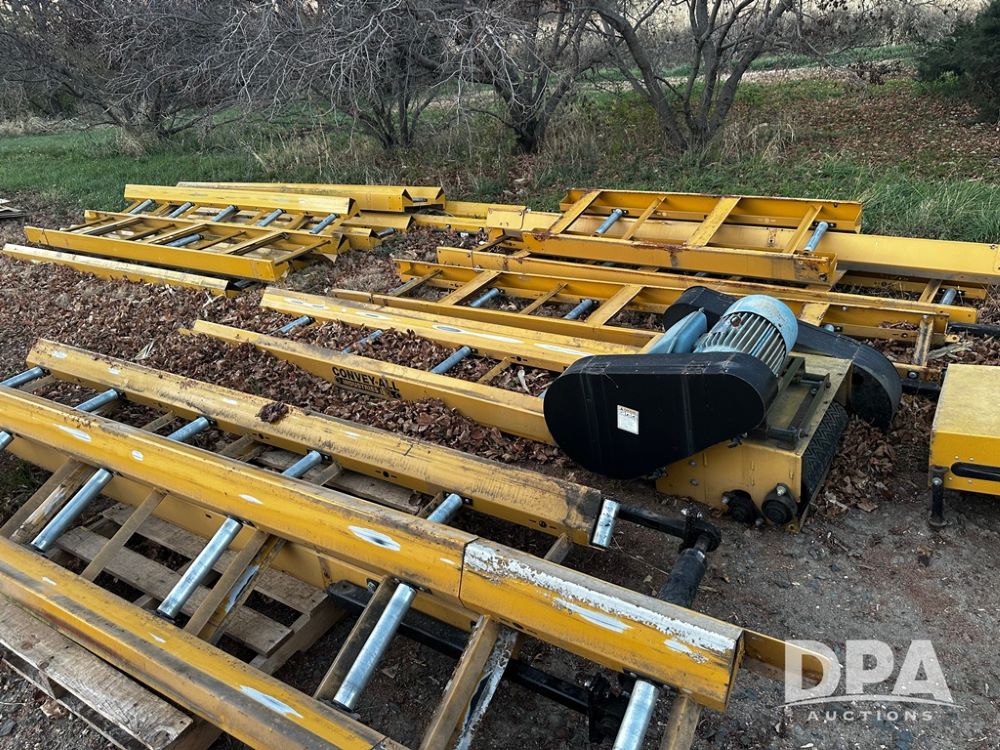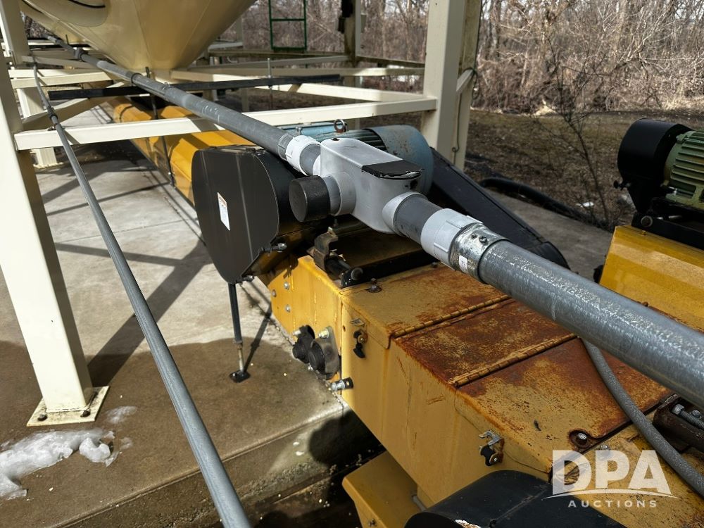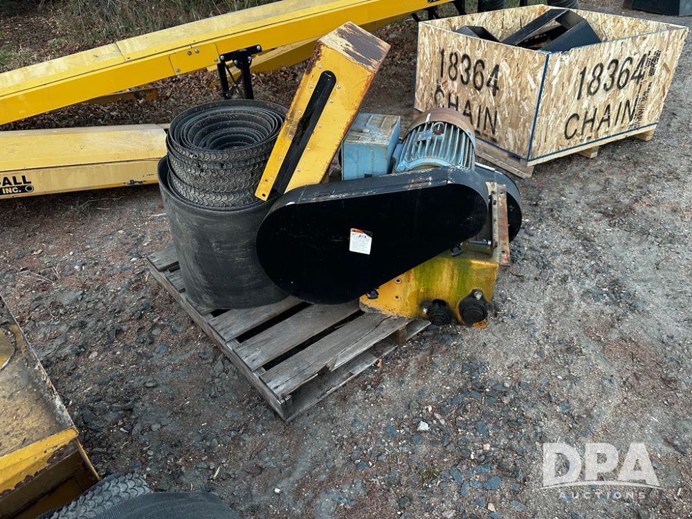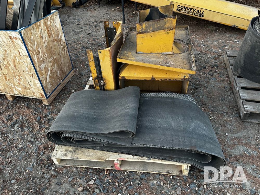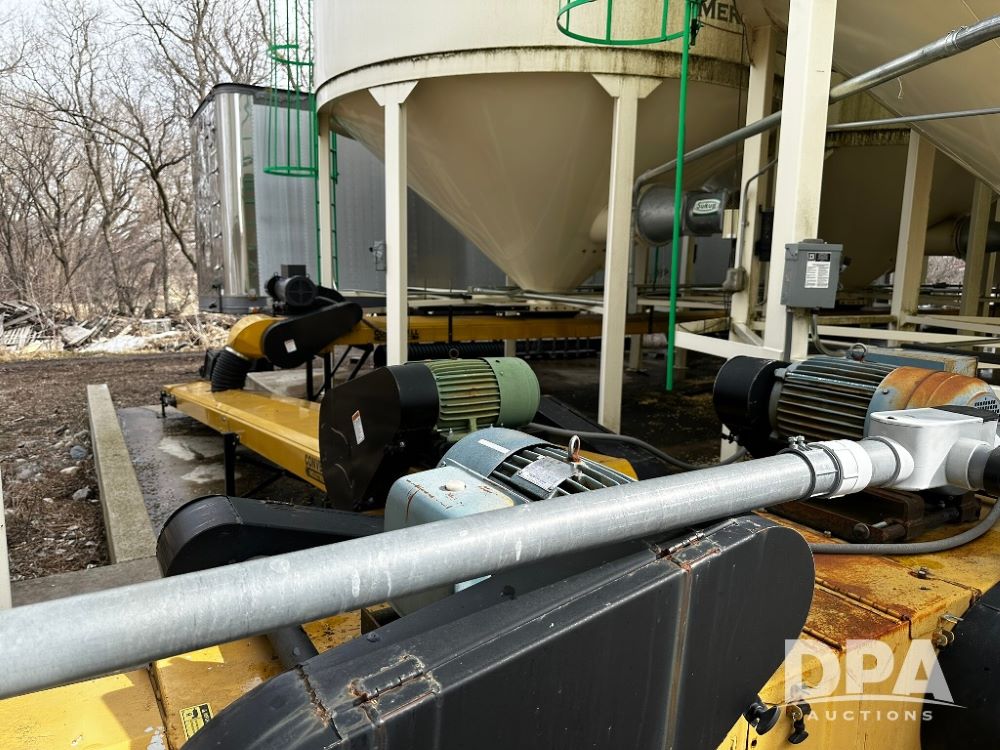 105' Convey-All Conveyor (NJP457), approx. 105', 18in wide belt, 2 drive ends with 10hp and 5hp single phase electric motors, center collection transition and two trail sections, brackets to hand under hopper bins, 6 transitions from meridian hopper bin gates, air cylinders and mounting to open bin gates and gate stops.