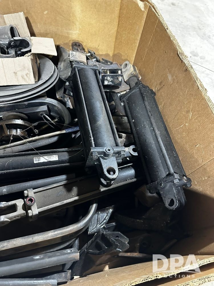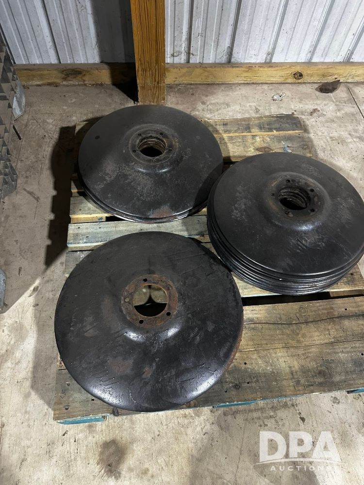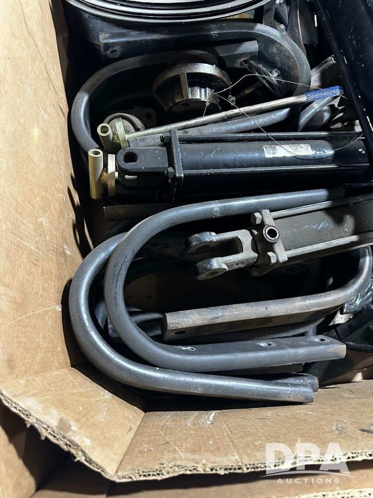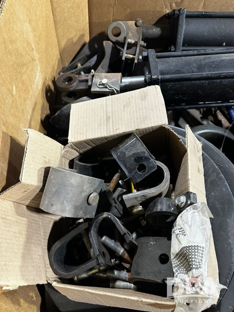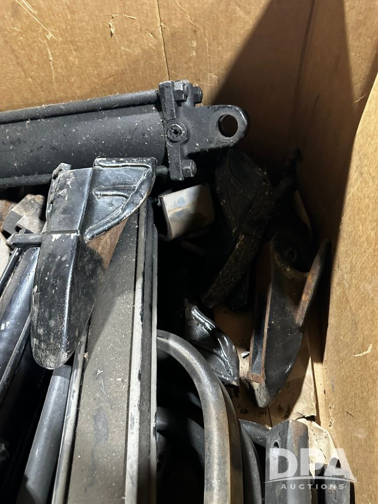 Case Ripper Parts (NJP458), box contains: 2-main frame hydraulic lift cylinders off 11 shank 870 ripper, 2 wing fold hydraulic cylinders for leveler on 11 shank 870-875 ripper, many front disk c-shank mounts from 875 ripper, T-bolts for 870 disc levelers, 870-875 front disk hubs and bearings, hydraulic cylinder stops, 11 covering boards for 870-875 ripper, 2in to 7in Case IH/DMI paints, pallet contains: 25 front disk blades from 11 shank 875 ripper, disk measure from 21in to 23.5in diameter.