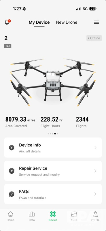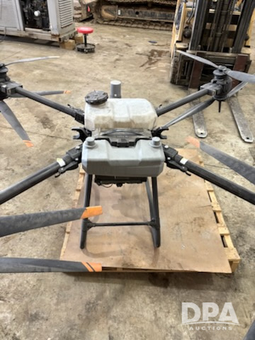 DJI Agras T40 Drone (JM698), T40 drone with RC plus controller, three (3) batteries, low cycle counts, one (1) C8000 charger, cooling station, FAA N Number, 228 flight hours.
