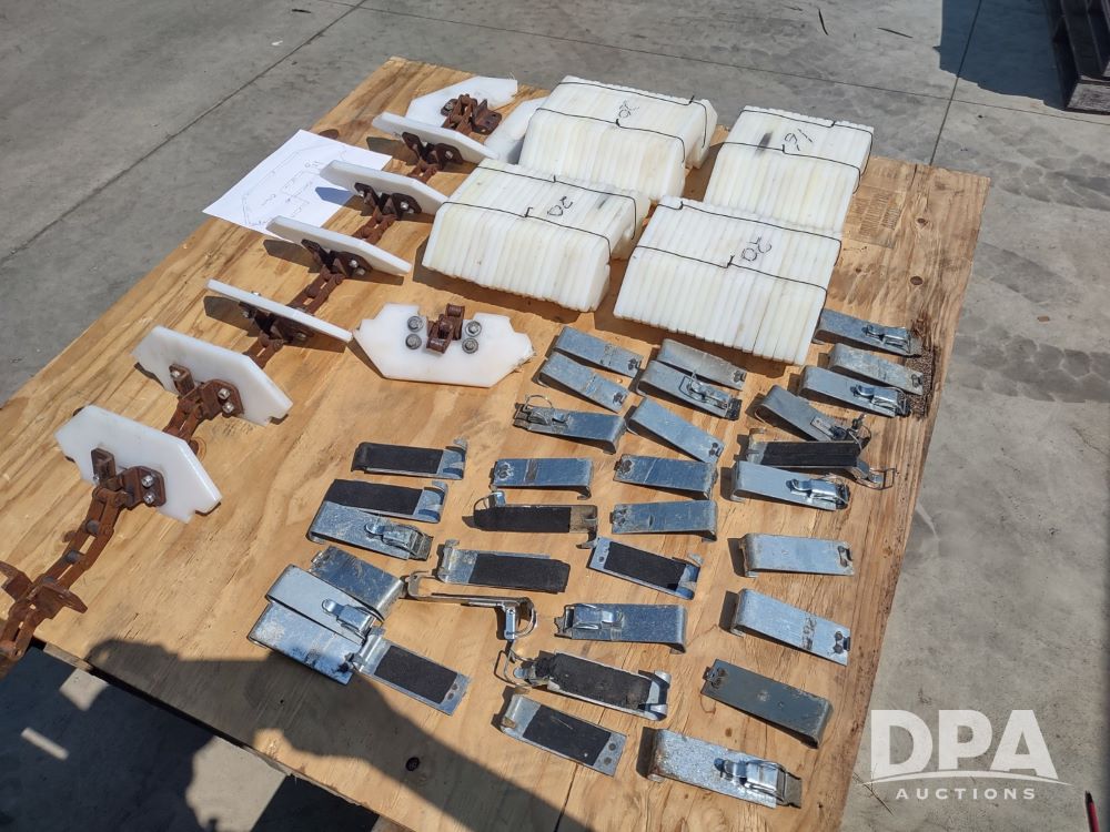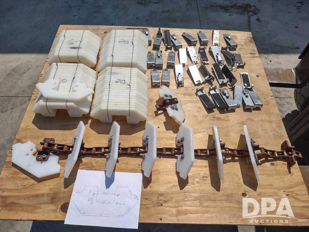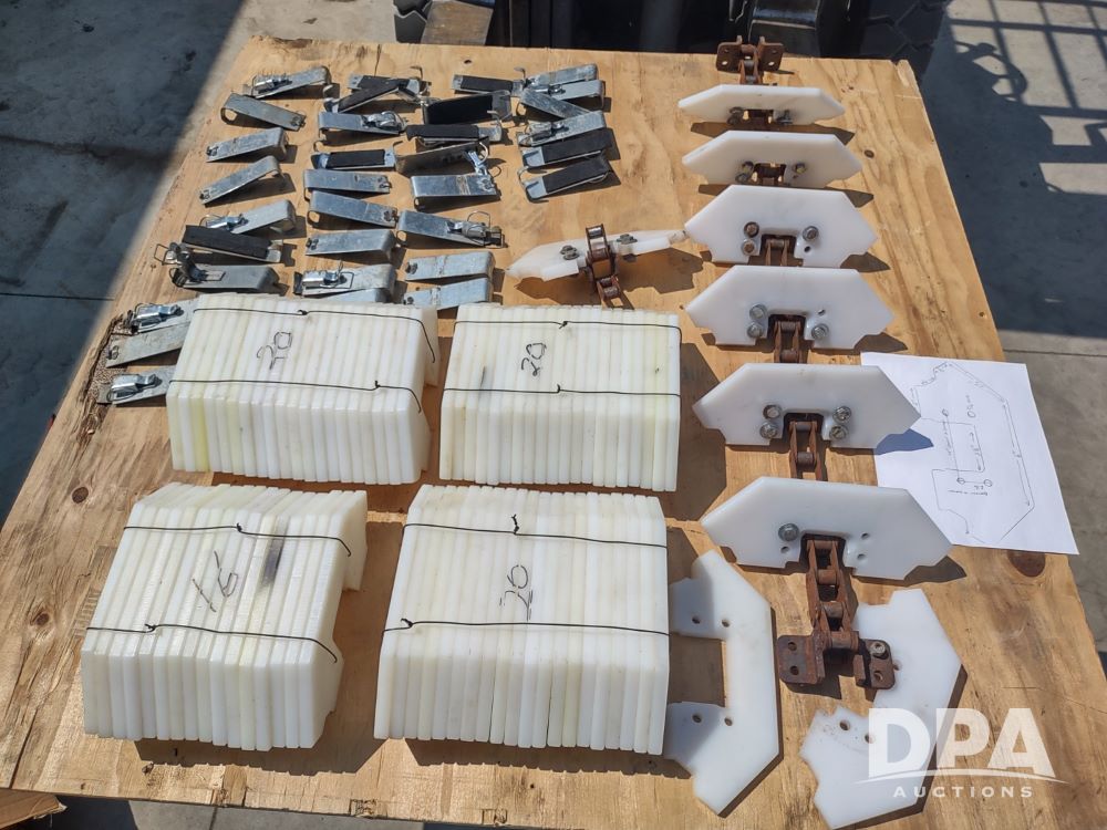 Sidney Sidewall Return Drag Conveyor Parts (NP6325, Unit 008), (77) paddles and 3' of chain with paddles, come with several metal cover clamps, please see pictures for a drawing that shows the measurements of the paddles.