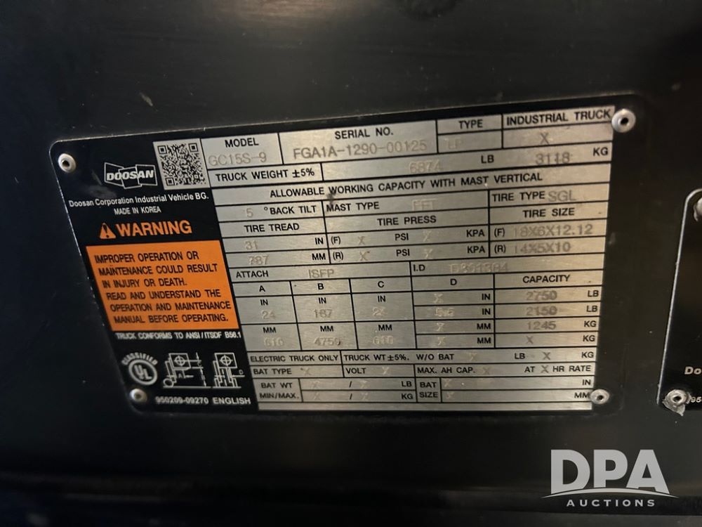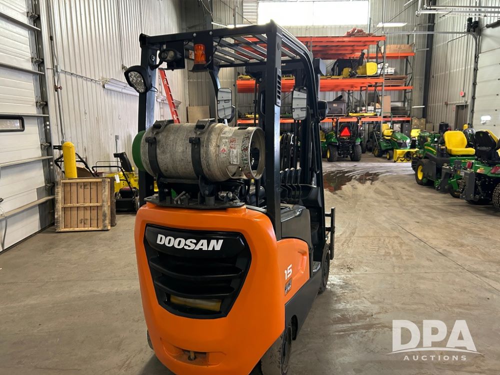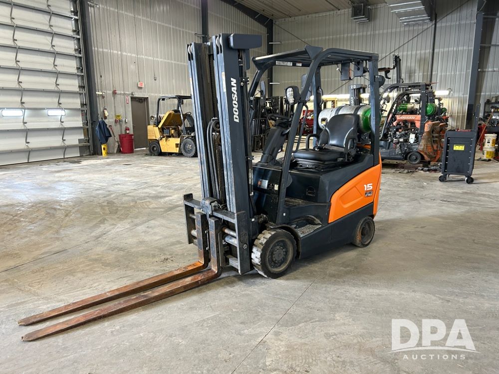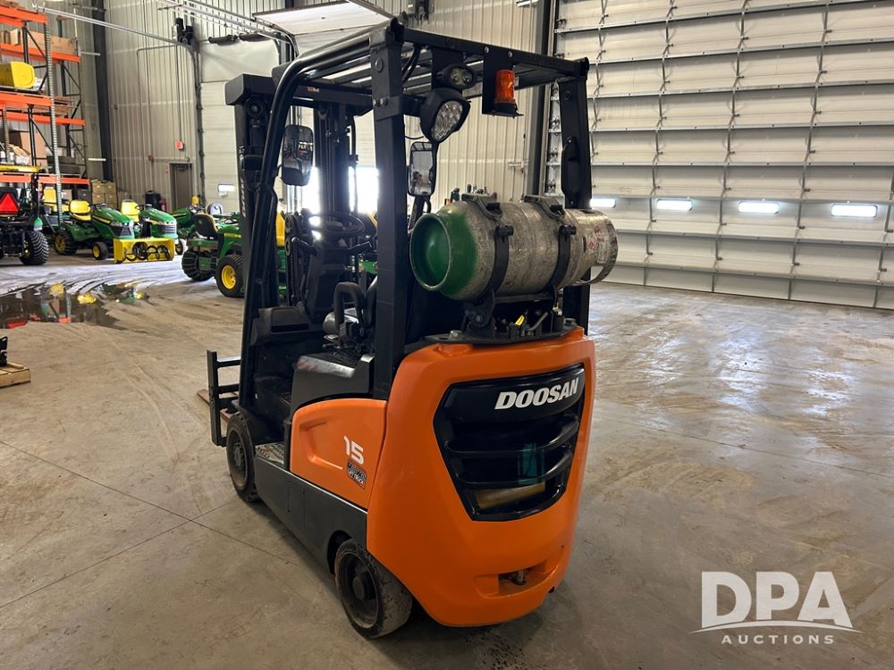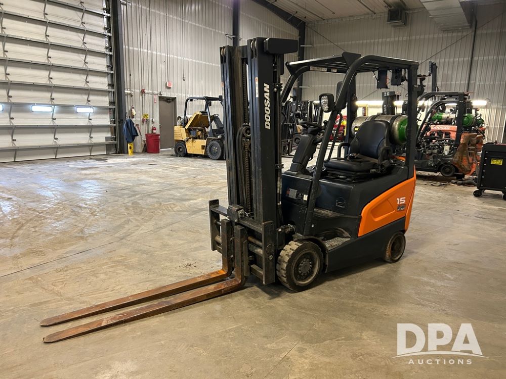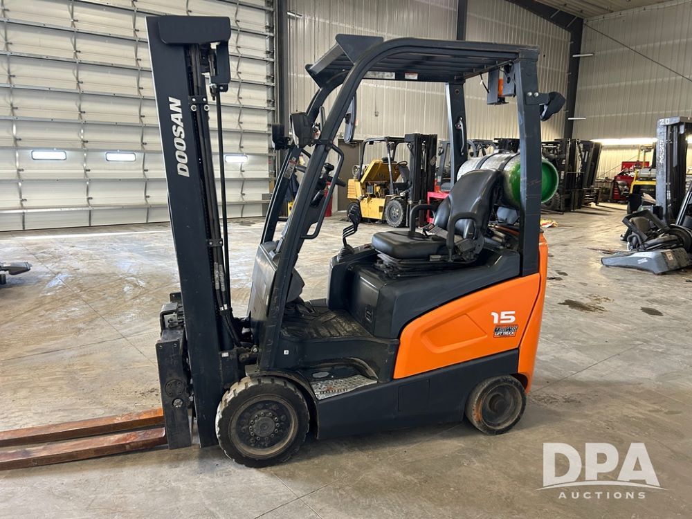 2020 Doosan GC15S-9 Forklift (CP1394), 2750lbs capacity, cushion/solid tires, 5 degree tilt, FFT mast, side shift, fork positioner, oil cooled disk brakes, steer wheeling adjustment, steering knob, seat, position adjustment, adjustable seat cushioning, rear grab bar with horn, two front LED lights, one rear LED light, two wide angle side, strobe light, back up alarm, LP tank mount swing down, fuel, coolant, oil, and speed gauges, low fuel alarm, anti-slip step plate, tool-less vented side panel and floor plate, wide hood open angle, shows 2,100 hours.