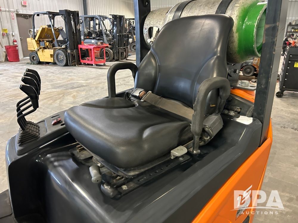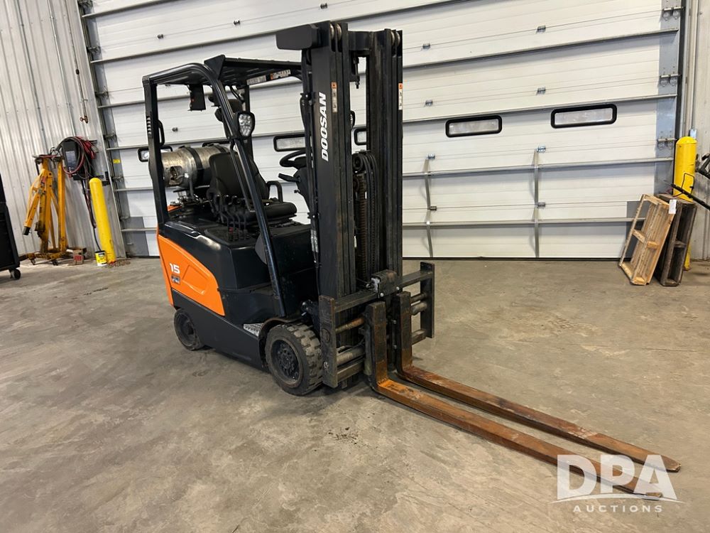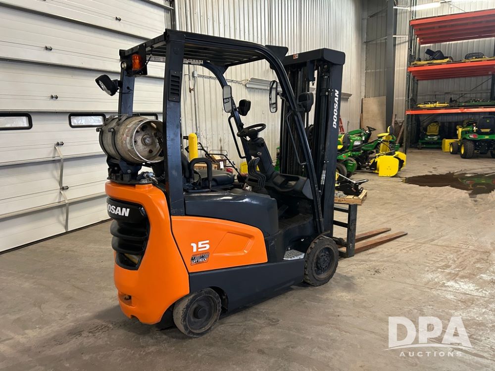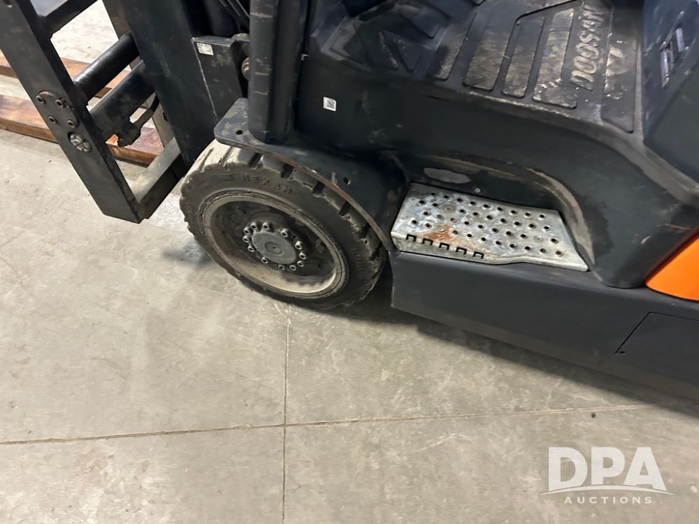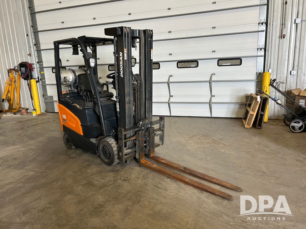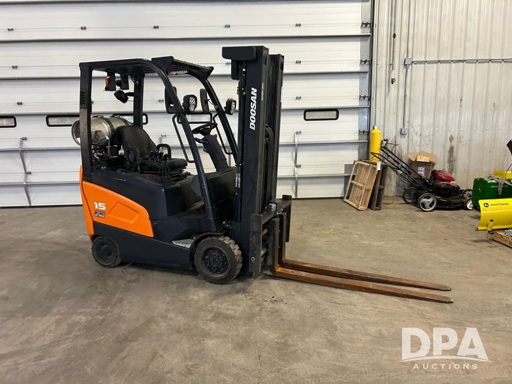 2020 Doosan GC15S-9 Forklift (CP1394), 2750lbs capacity, cushion/solid tires, 5 degree tilt, FFT mast, side shift, fork positioner, oil cooled disk brakes, steer wheeling adjustment, steering knob, seat, position adjustment, adjustable seat cushioning, rear grab bar with horn, two front LED lights, one rear LED light, two wide angle side, strobe light, back up alarm, LP tank mount swing down, fuel, coolant, oil, and speed gauges, low fuel alarm, anti-slip step plate, tool-less vented side panel and floor plate, wide hood open angle, shows 2,100 hours.