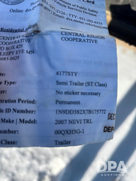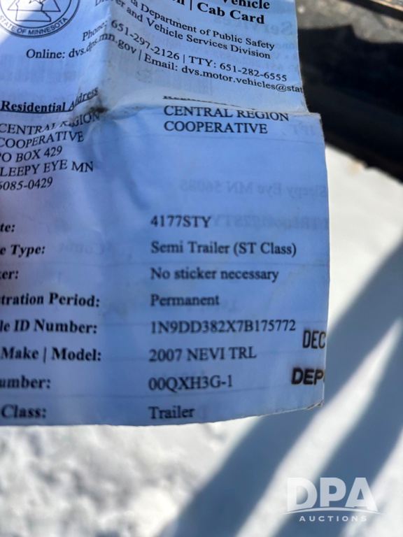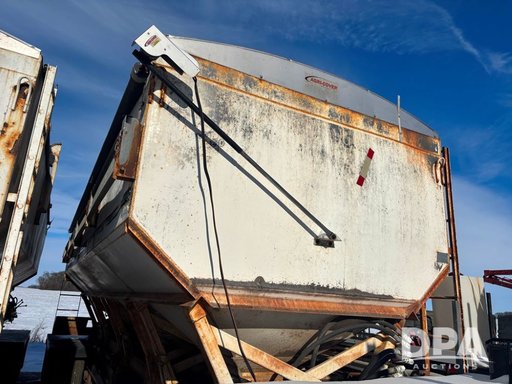 2007 Neville Dry trailer (DR12832 Unit T64), 3 compartment stainless steel hydraulic dry tender box, overhead discharge auger, electric roll over tarp, full length catwalk, off road fuel tank, 22.5 tires.
