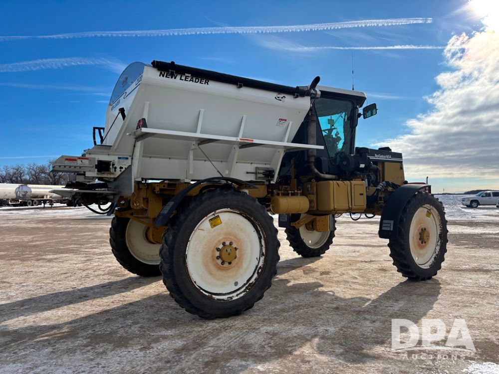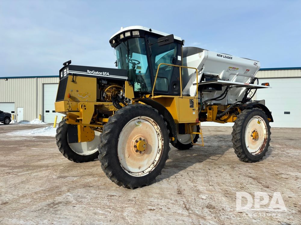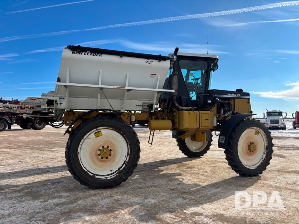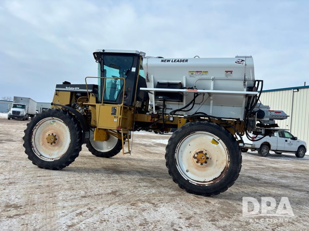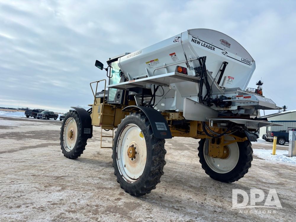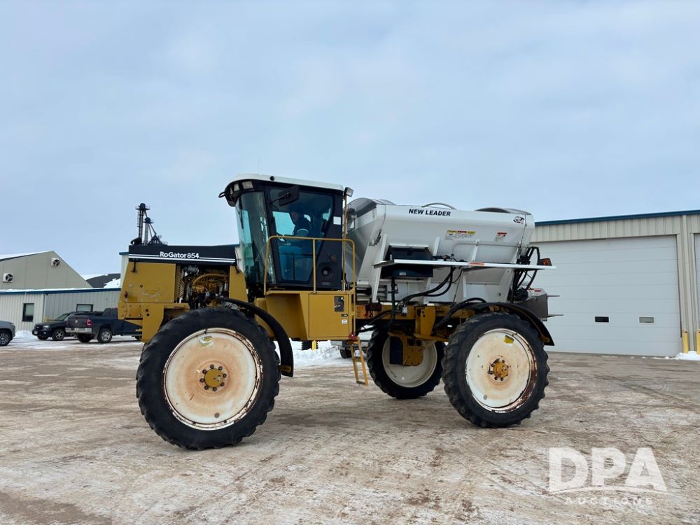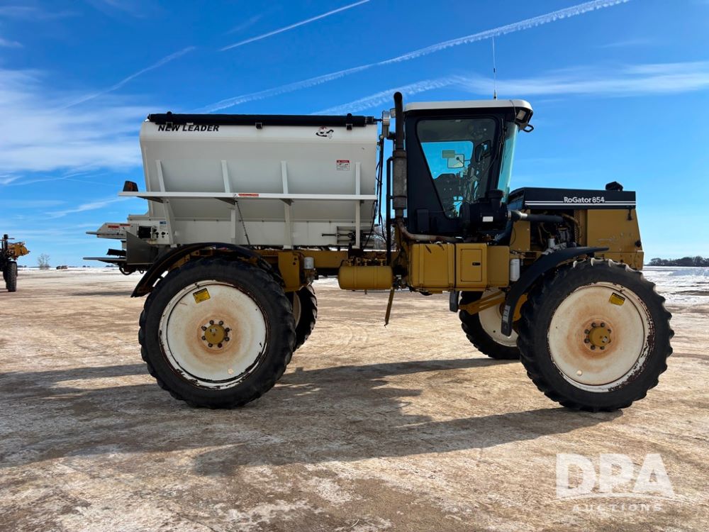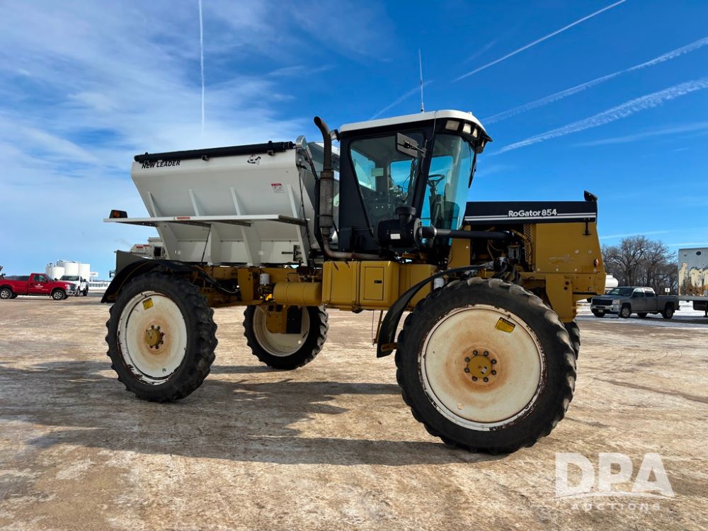 RoGator 854 Dry machine (DR12835), diesel engine, hydrostatic drive, New Leader L2020 G4 stainless steel hydraulic dry spinner box, Raven SCS controller, light bar, electric roll over tarp, cab cam, 320/90R46 row crop tires, shows 5,757 hours.