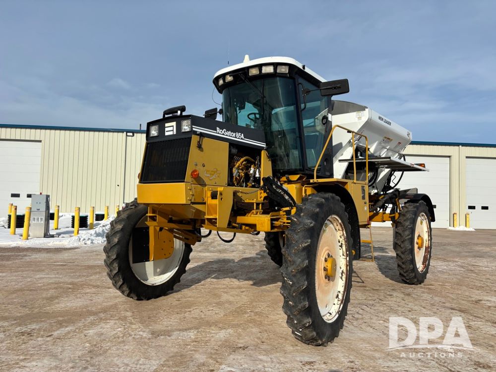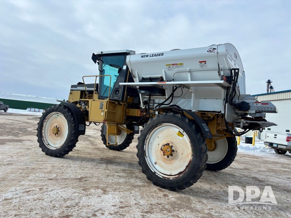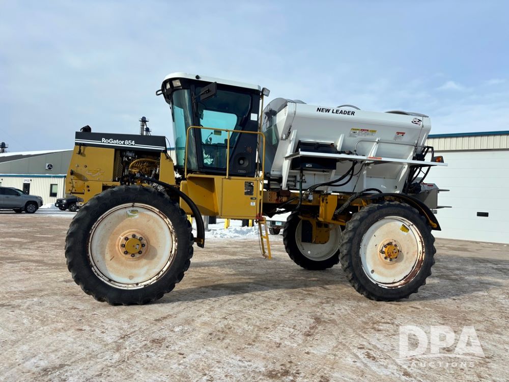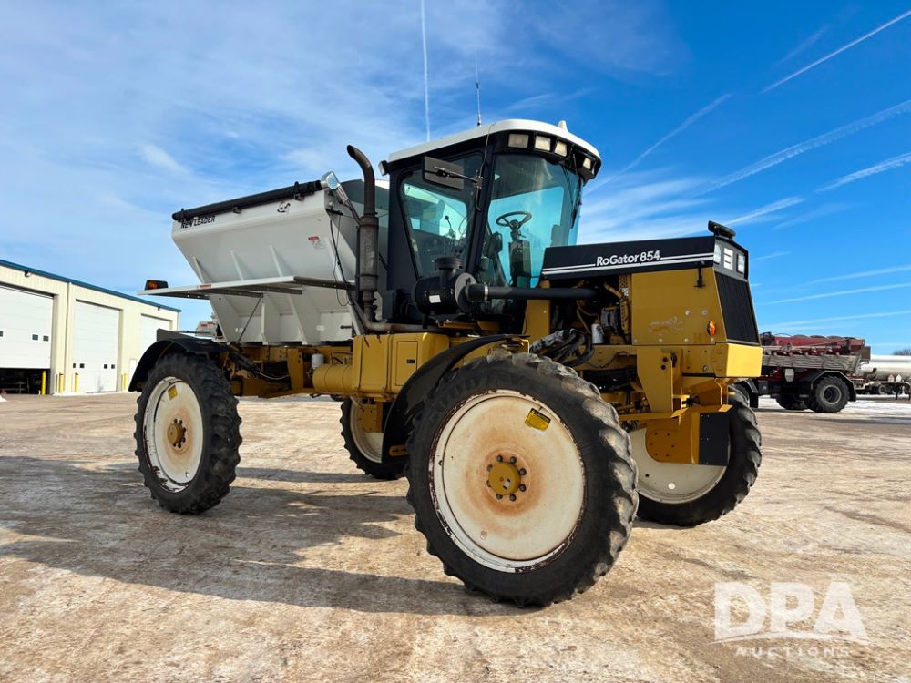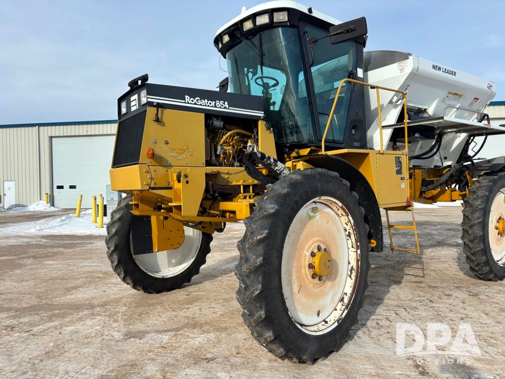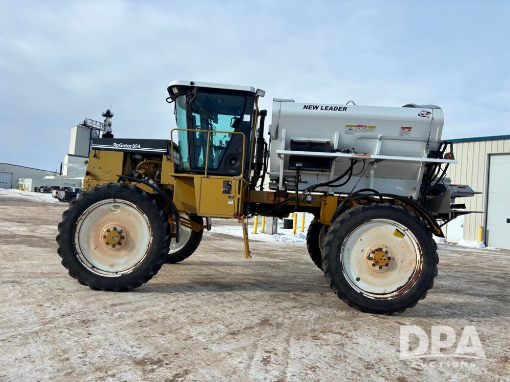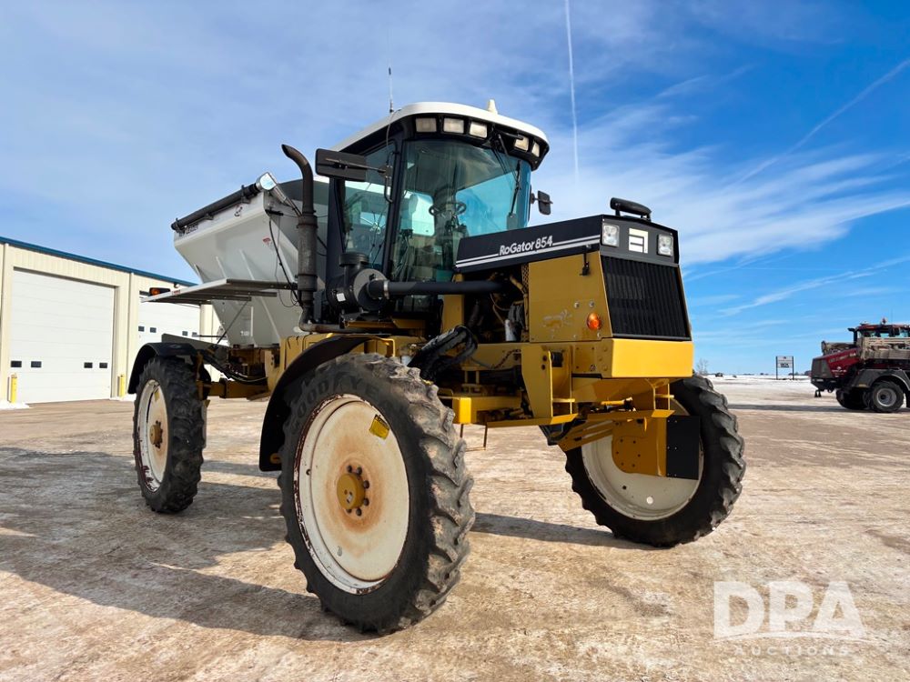 RoGator 854 Dry machine (DR12835), diesel engine, hydrostatic drive, New Leader L2020 G4 stainless steel hydraulic dry spinner box, Raven SCS controller, light bar, electric roll over tarp, cab cam, 320/90R46 row crop tires, shows 5,757 hours.