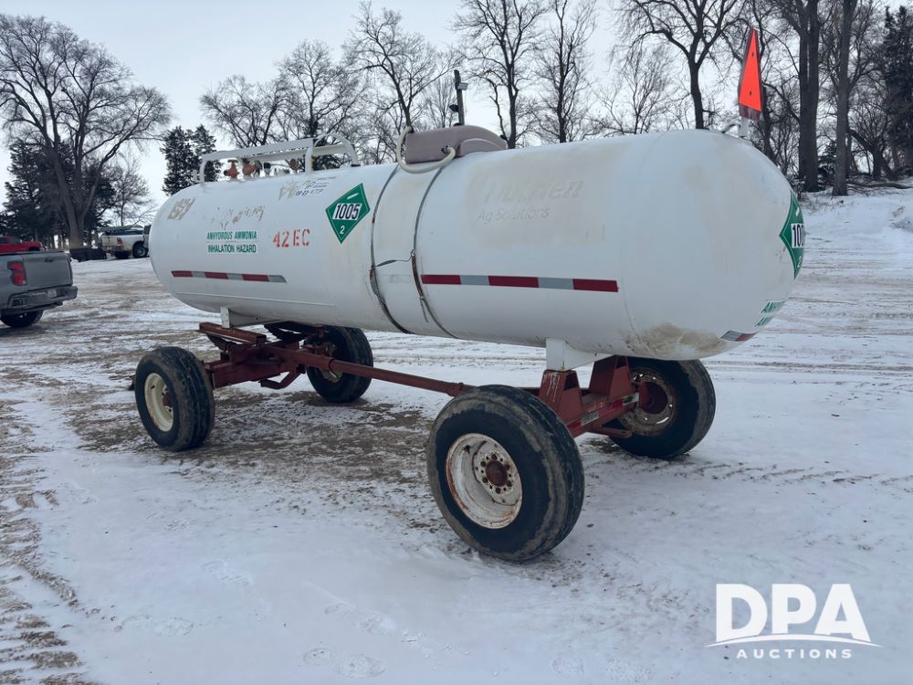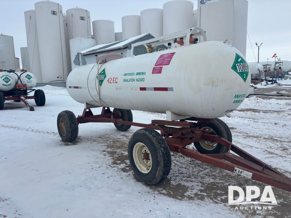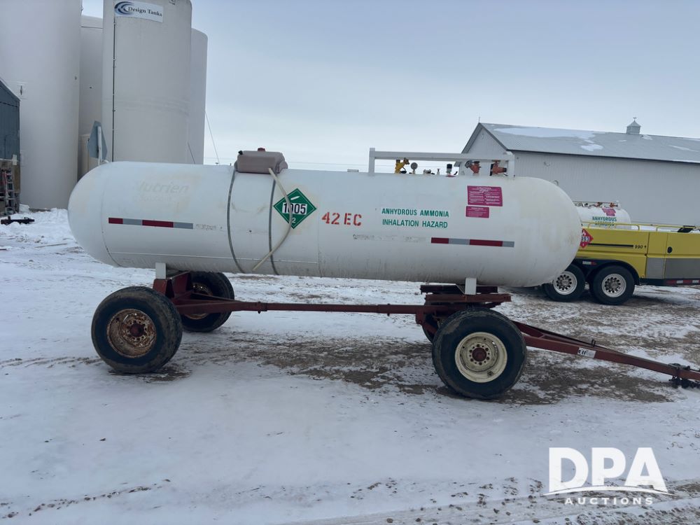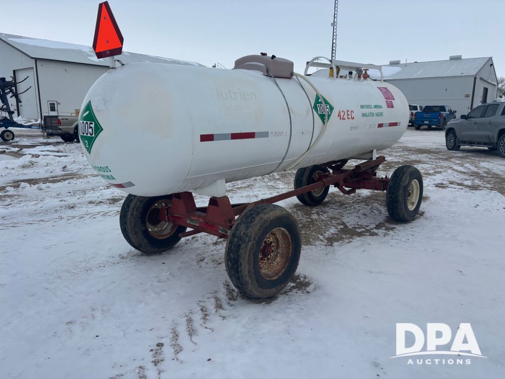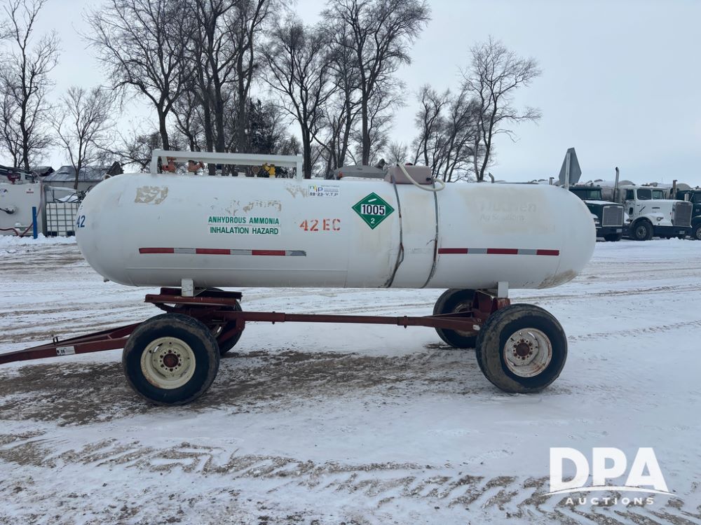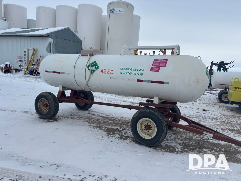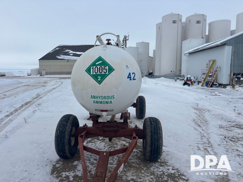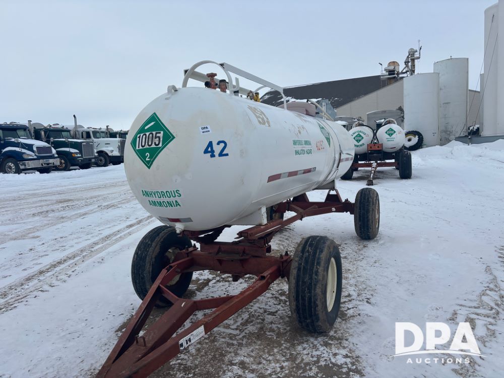 Nh3 Nurse Tank (DR12738 Unit 56002), 1,000 gallon top front fill Nh3 nurse tank, data tag, Tank 42, Demco 5th wheel style running gear, adjustable axles, 11L-15 tires.