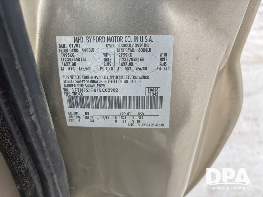 2001 Ford F250 Pickup (DR12843 Unit 42817), Power Stroke diesel engine, automatic transmission, 4X4, regular cab, long box, AM/FM CD radio, heat/air conditioning, trailer brake, power windows & locks, rear ag bumper, cast aluminum wheels, Firestone 265/75R16 tires, odometer reads 256,542 miles.