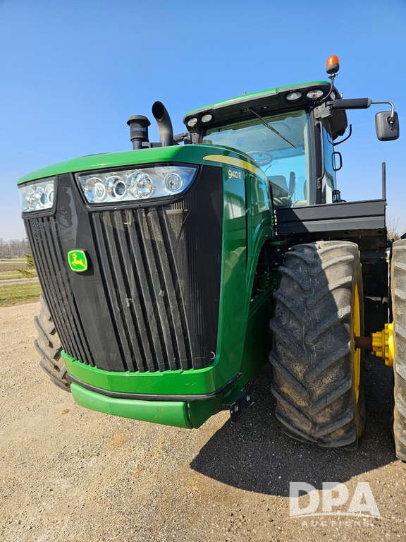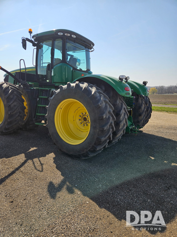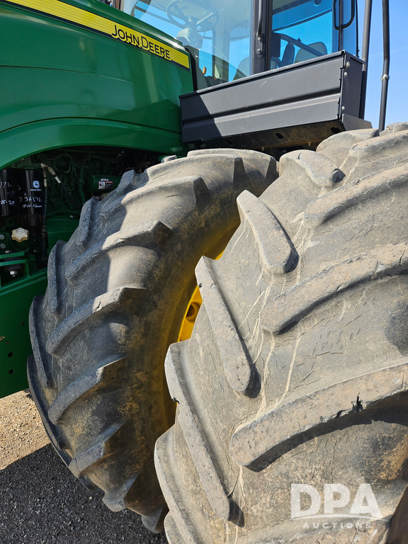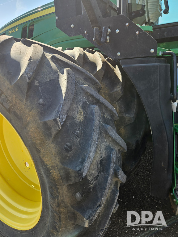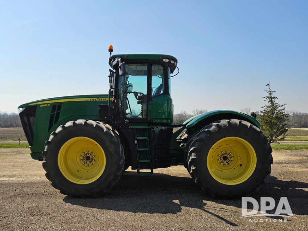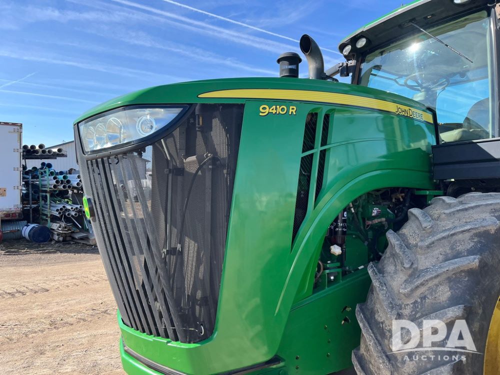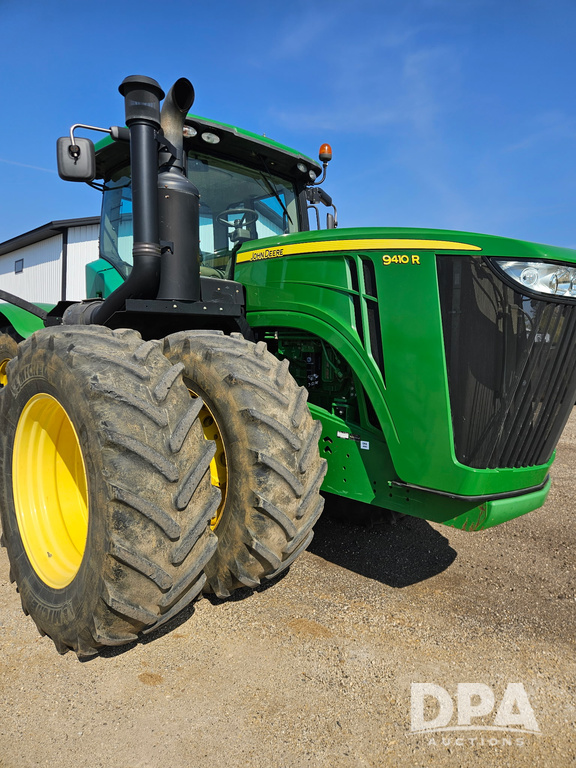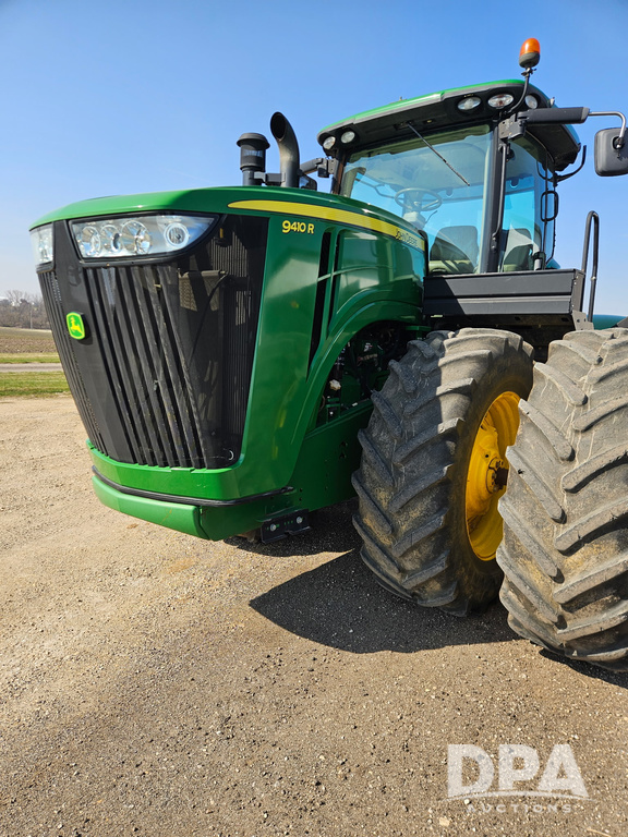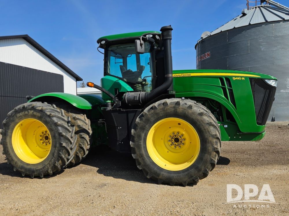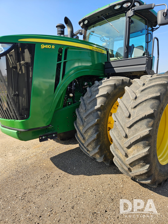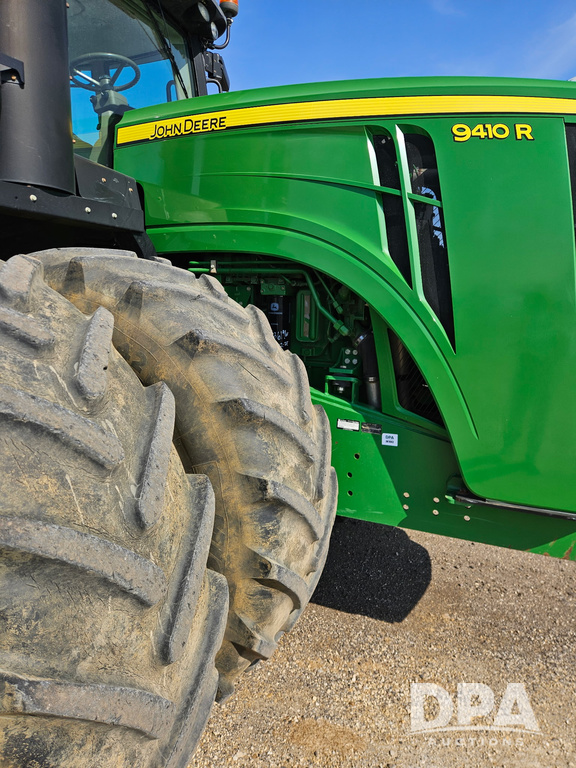 2014 John Deere 9410 Tractor (PD5395), 4WD, 13.5L turbocharged diesel engine, 410 hp, powershift transmission, 5 SVC ports, drawbar, CommandView II cab, leather seat, buddy seat, air conditioning, Delphi AM/FM stereo, 620/70R42 dual tires, John Deere monitor, shows 3,618 hours.