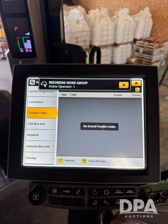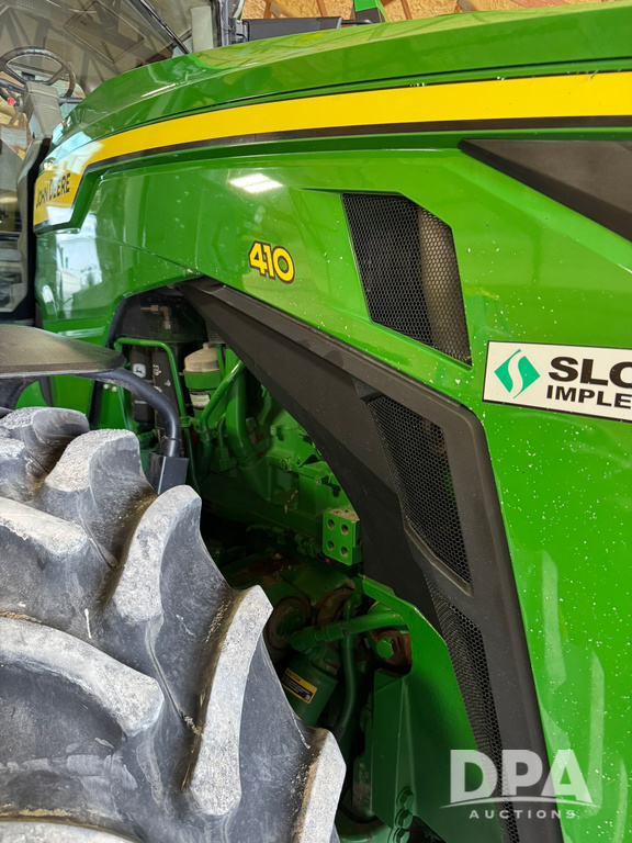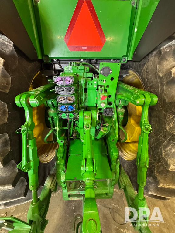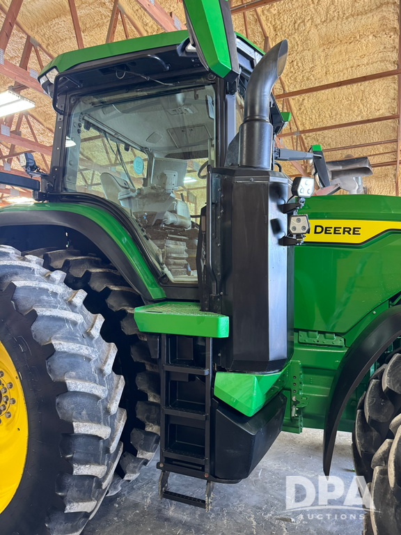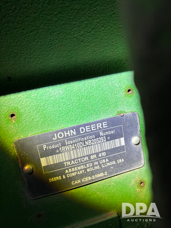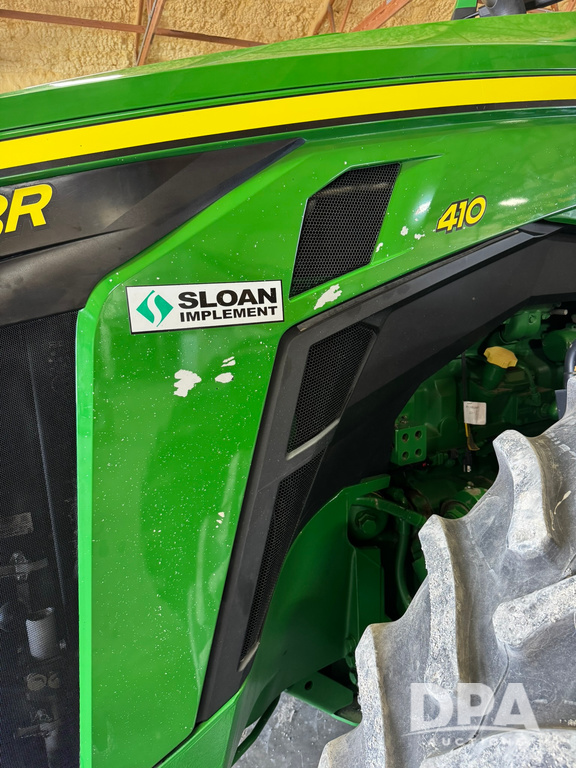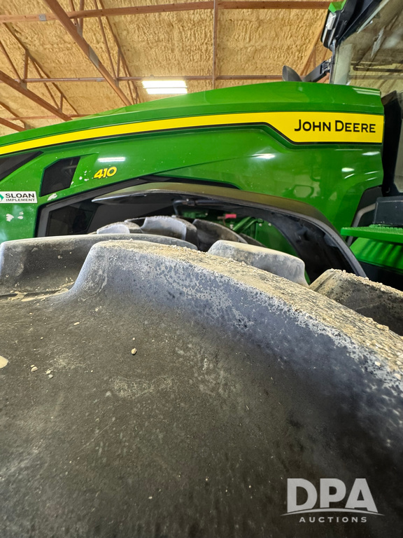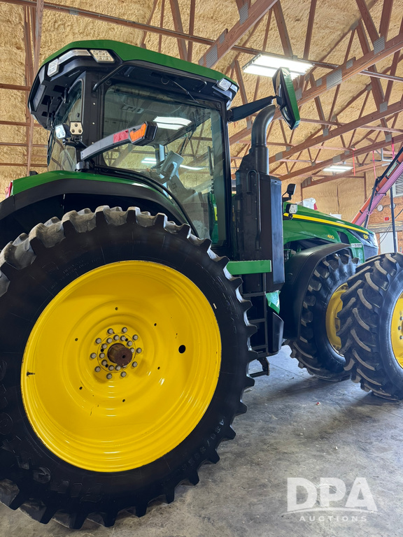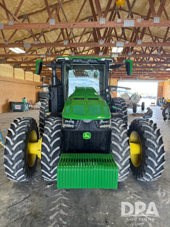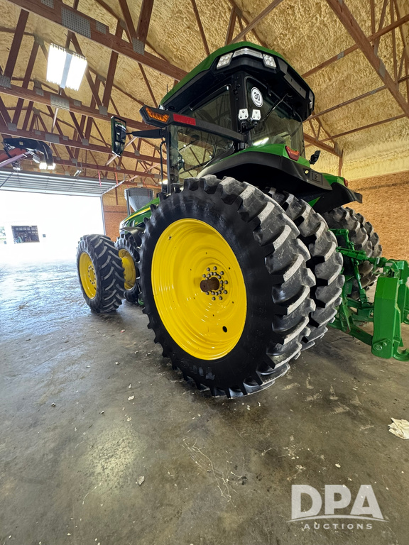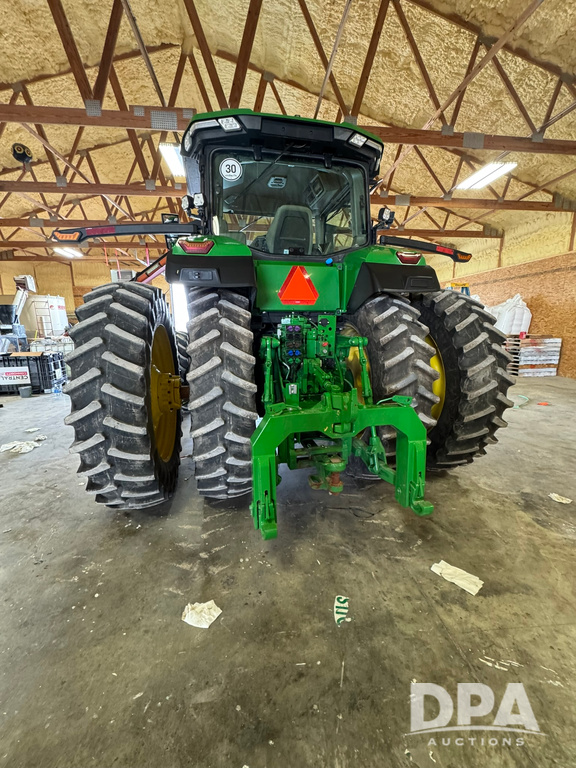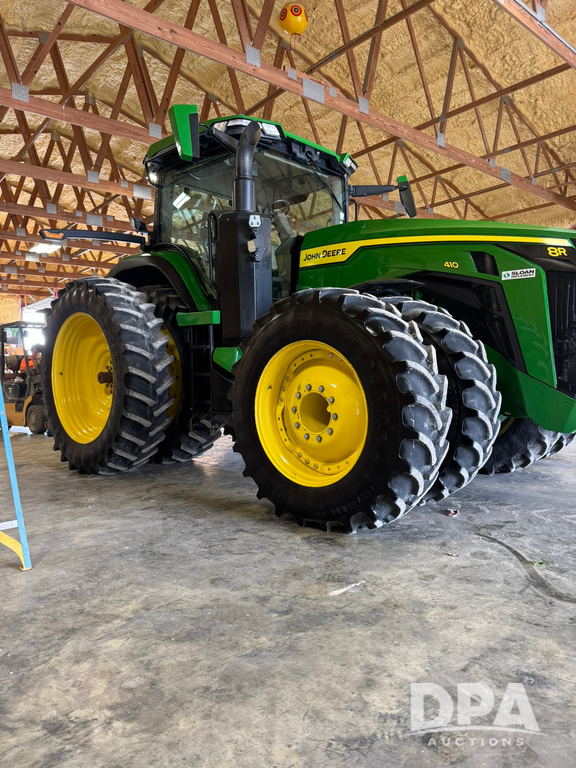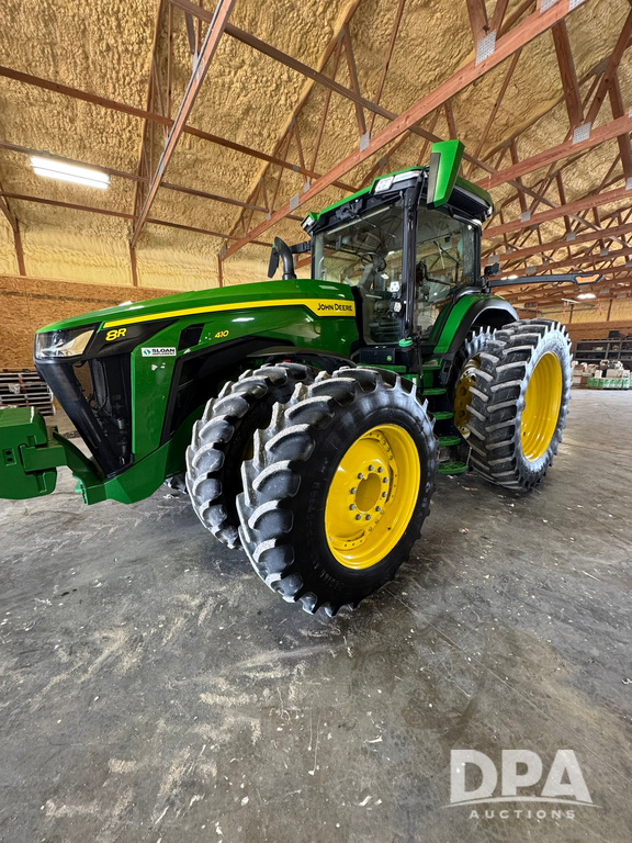 2022 John Deere 8R 410 Tractor (LT1490), ILS front suspension, E23 transmission 31 mph, 5 Hyd SCV's, case drain hookup, 84GPM pump flow, Hyd trailer brakes, 20 front weights, 1,400 pound rear inside weights, Ultimate Comfort and Conv. Pkg, Ultimate Visibility Pkg, Air Seat with Cab Suspension, Leather seats with heat, cooling and massage, refrigerator, Integrated SF7000 Receiver, 4600 monitor with all activations, Implement Ethernet, HD Cat 4 Draw Bar with Support, 1000 PTO, 480R50 Duals, 420R34 Front tires, tires were used very little, Frt. Fenders, Rear Fender Ext, Radar, Block Heater. Power guard warranty till fall of 2027, shows 2,309 hours.