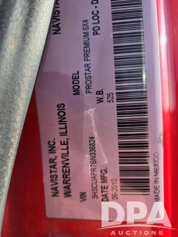 2011 International Prostar Truck (LT1494), Cummins ISX diesel engine, engine brake, Eaton Fuller 10 speed transmission, air ride suspension, tandem rear axels, 22.5LP tires, sliding fifth wheel, mid roof sleeper, shows 934.447 miles.