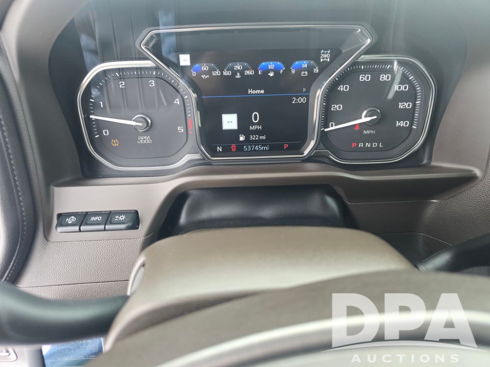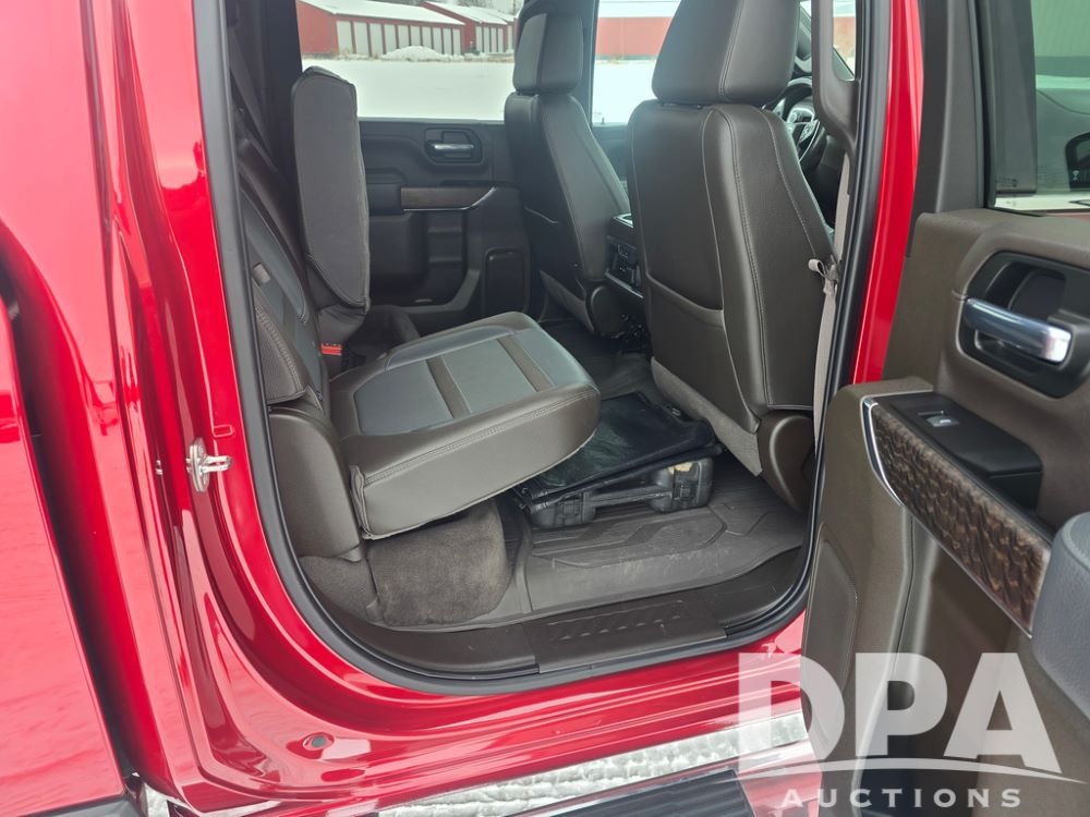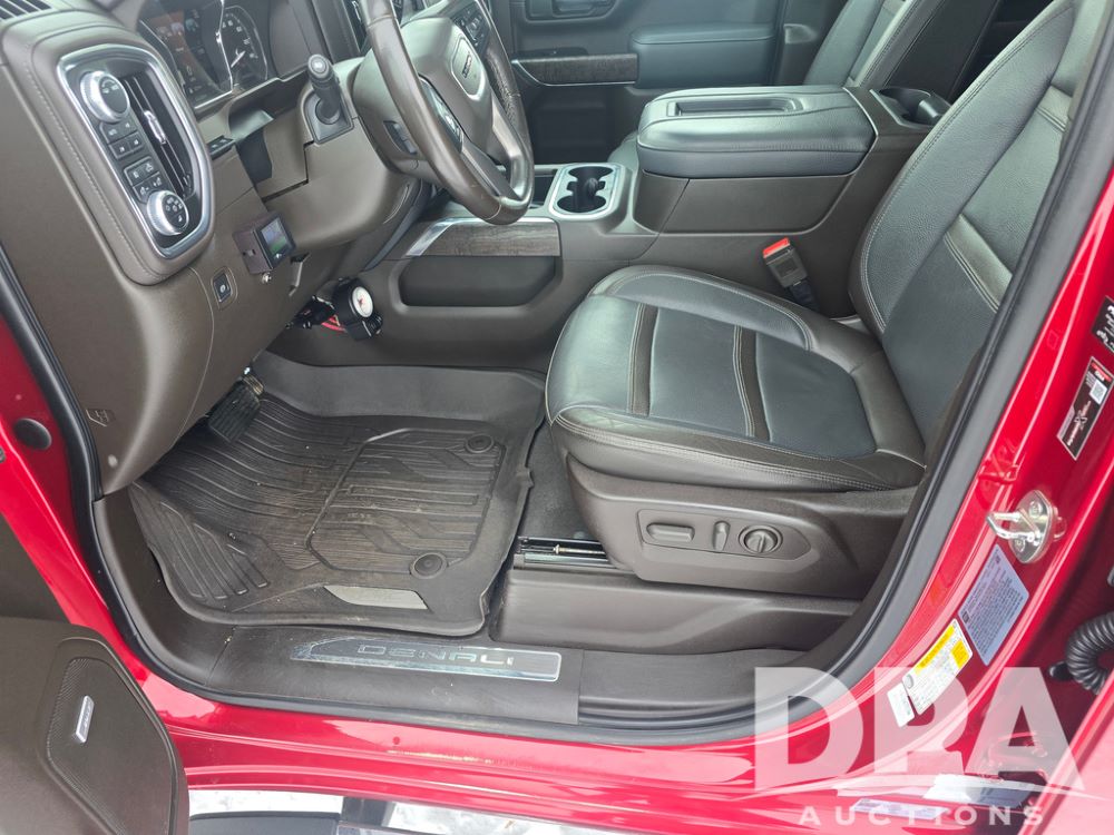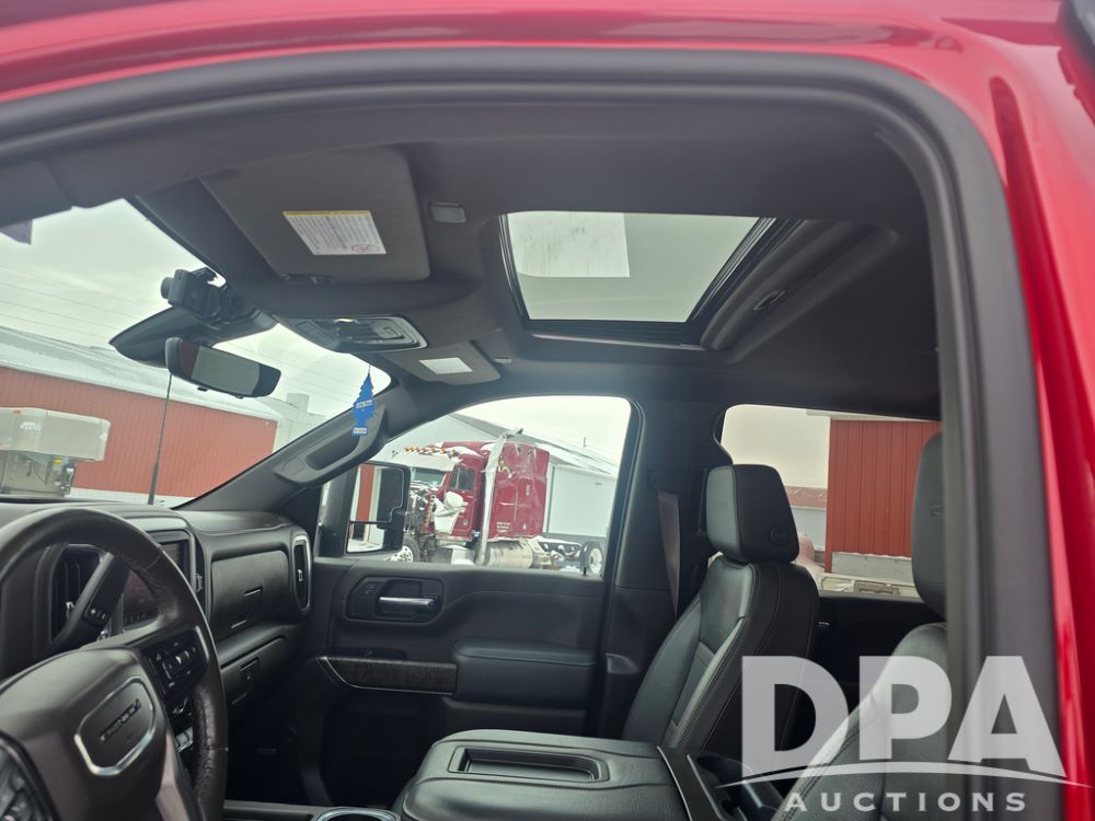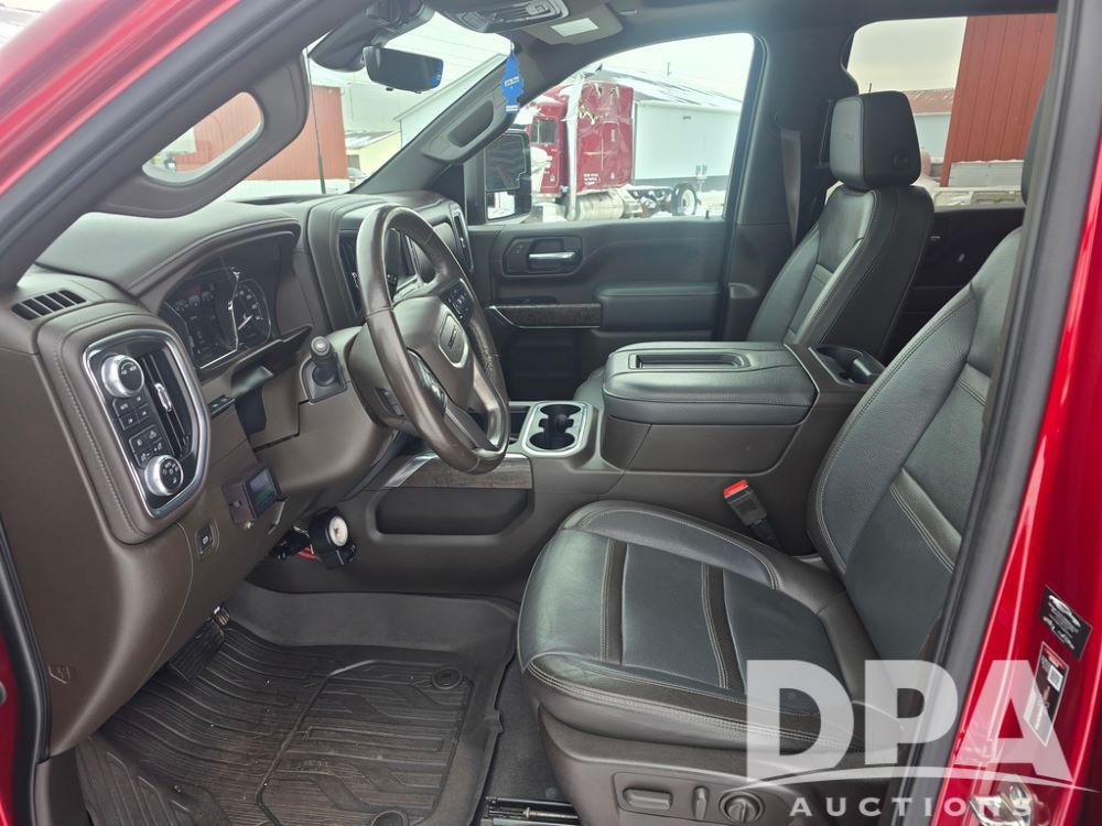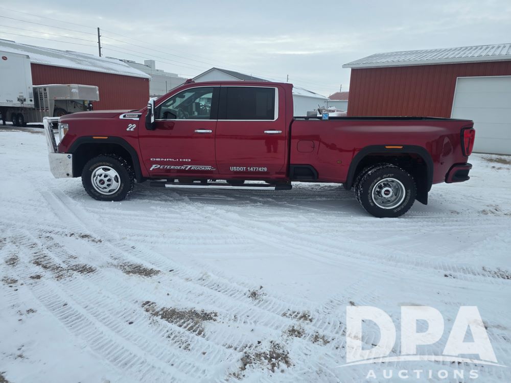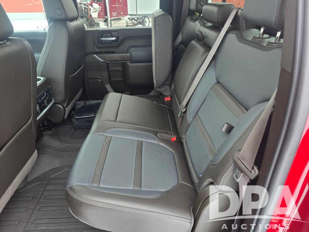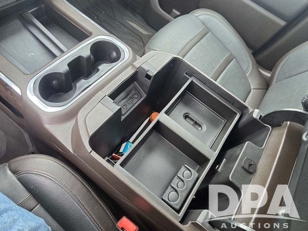 2022 GMC Sierra Denali HD 3500 Truck (JM723), Duramax turbo diesel V8 engine, 445 HP, Allison 10-speed fully automatic transmission, Transfer Flow Trax auxiliary fuel tank, SIT (self inflating tire) technology, wireless charging station, multi-pro tailgate with 6 functions, LED headlamps, fog lights, LED box lighting, spray-in bed liner, power plugin, corner step bumper, 5-passenger capacity in the crew cab, heated leather seats, remote start, keyless entry, power windows and locks, sun roof, GM all weather liners, air conditioning, heat, Infotainment system, tires- 235/80R17, shows 53,745 miles.