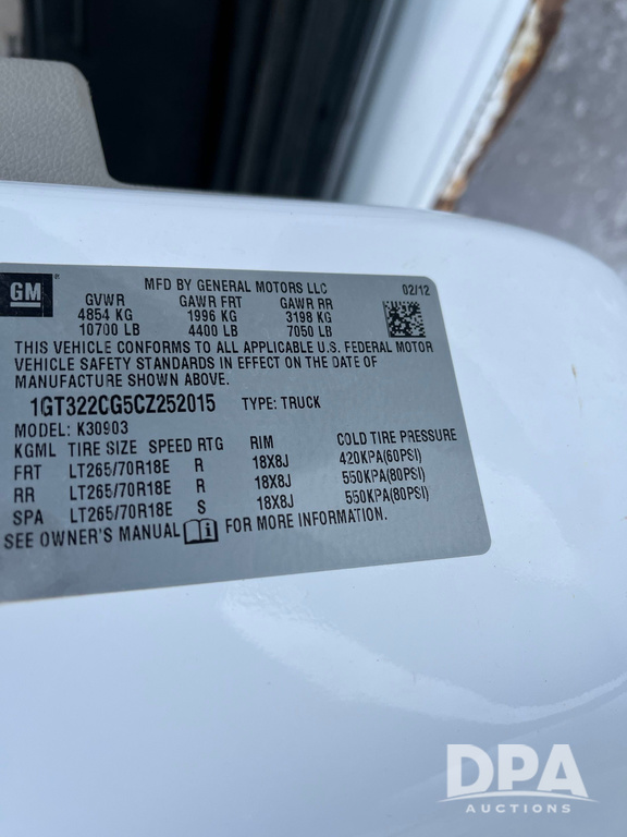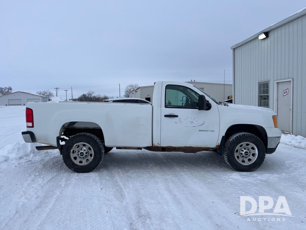 2012 GMC 3500HD Pickup (JN3549, Unit 621), 4x4, Vortec 6.0L gas engine, automatic transmission, air conditioning, heat, Am/Fm radio, cruise control power windows & locks, 5th wheel, LT275/70R18 tires, shows 127,996 miles.