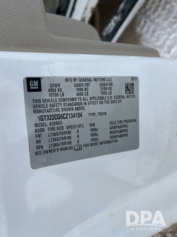 2012 GMC 3500HD Pickup (JN3583, Unit 93), 4x4, Vortec gas engine, automatic transmission, air conditioning, heat, Am/Fm radio, cruise control, power windows & locks, running boards, rear hitch, shows 133,779 miles.