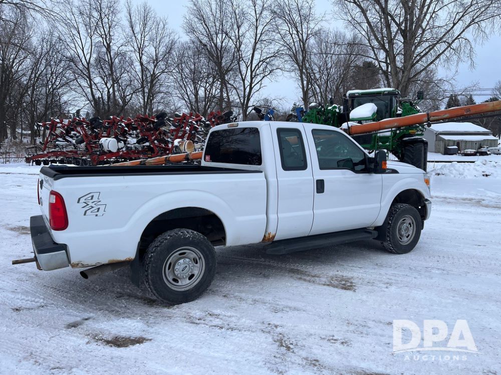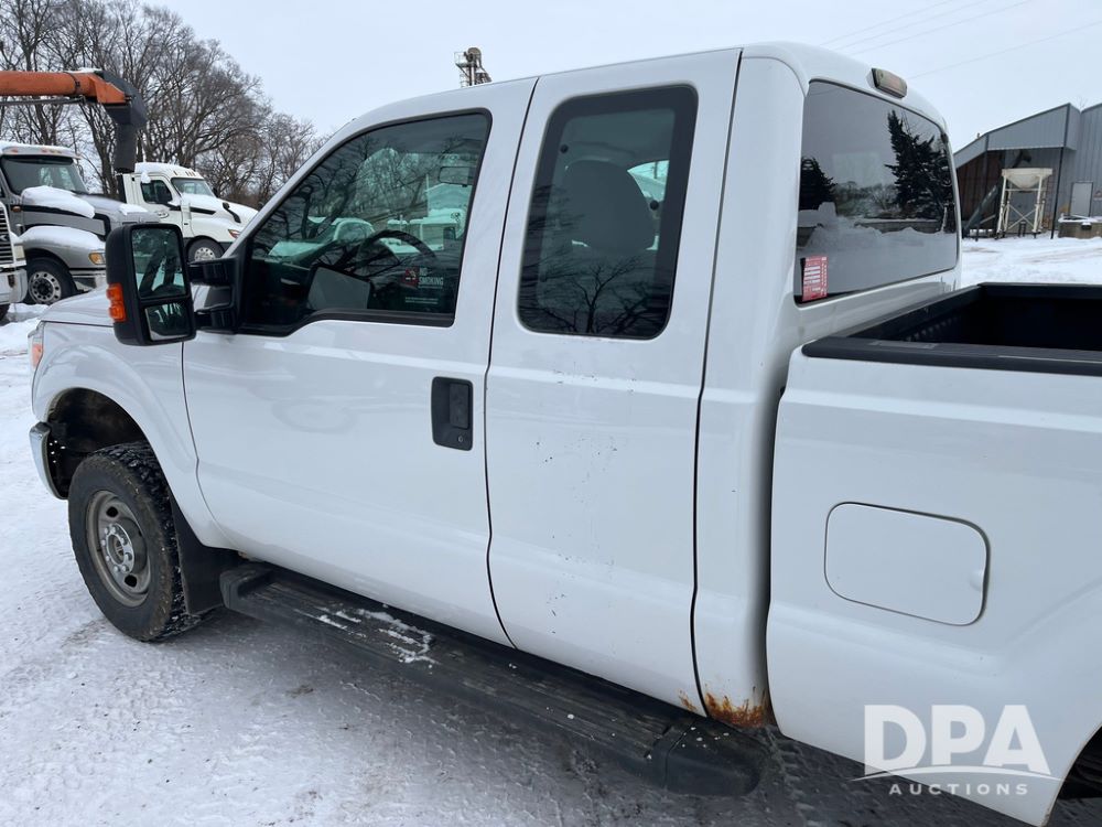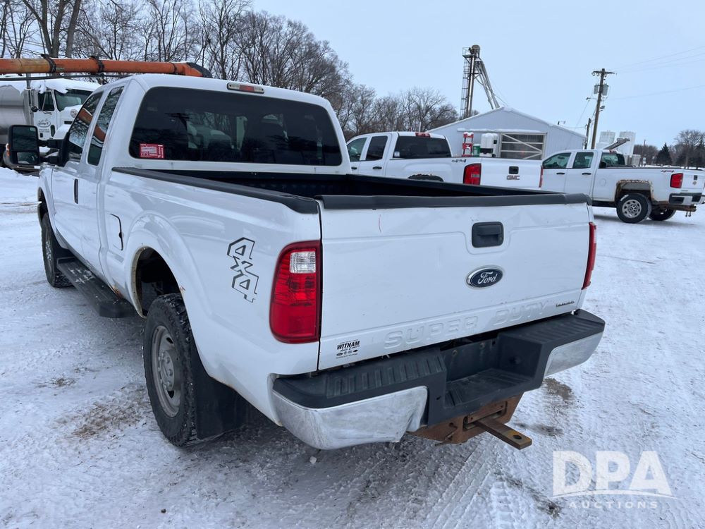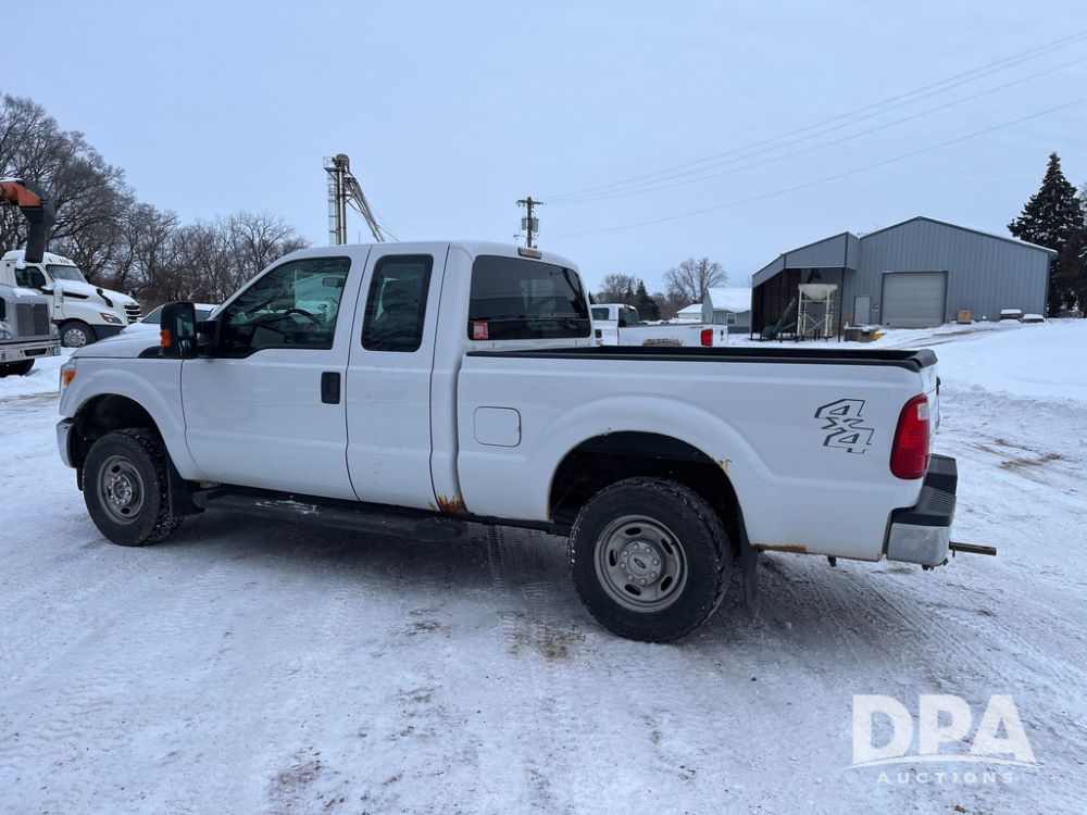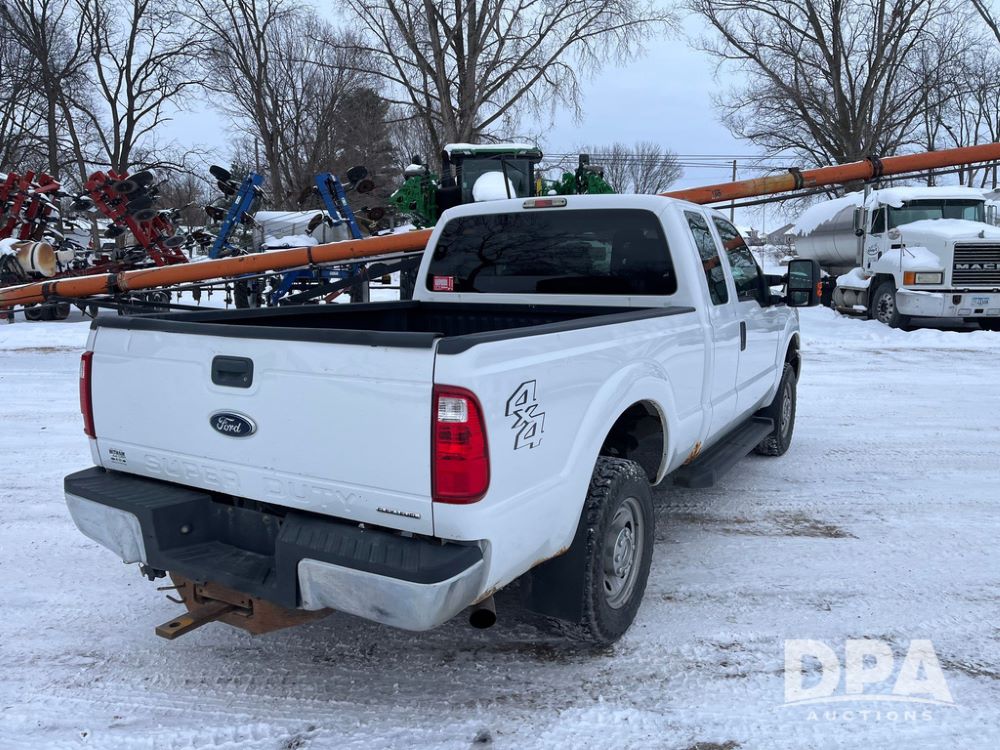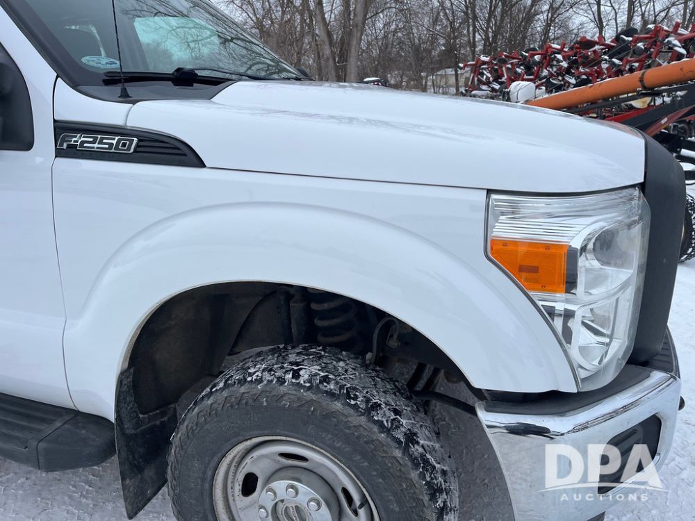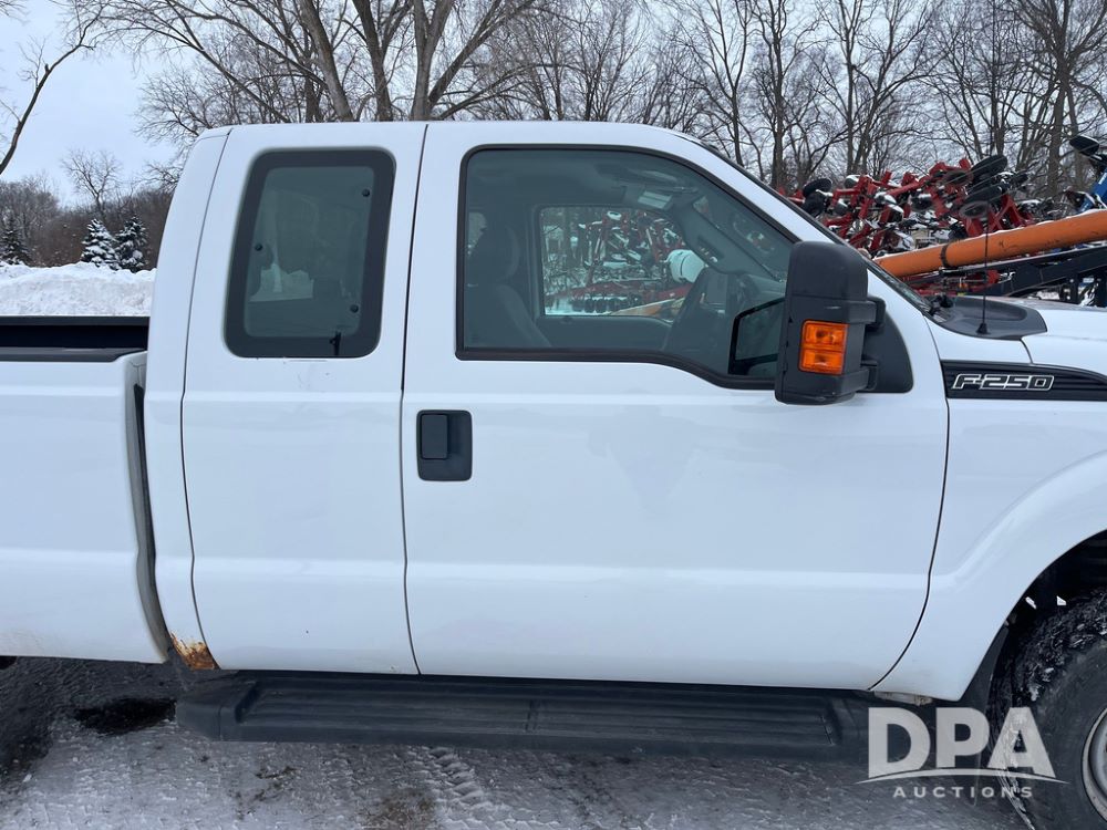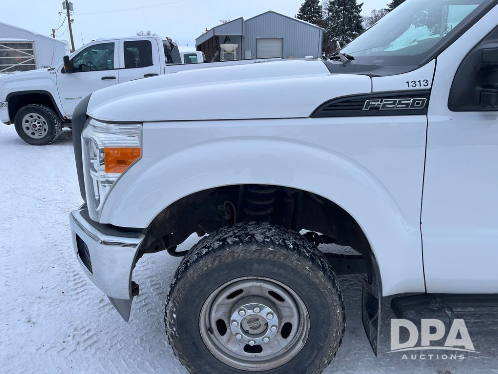 2014 Ford F250 Super Duty Extended Cab Pickup (JN3586, Unit 1313), 4x4, 6.2L gas engine, automatic transmission, air conditioning, heat, Am/Fm CD radio, cruise control, power windows & locks, running boards, rear hitch, LT245/75R17 tires, shows 180,651 miles.